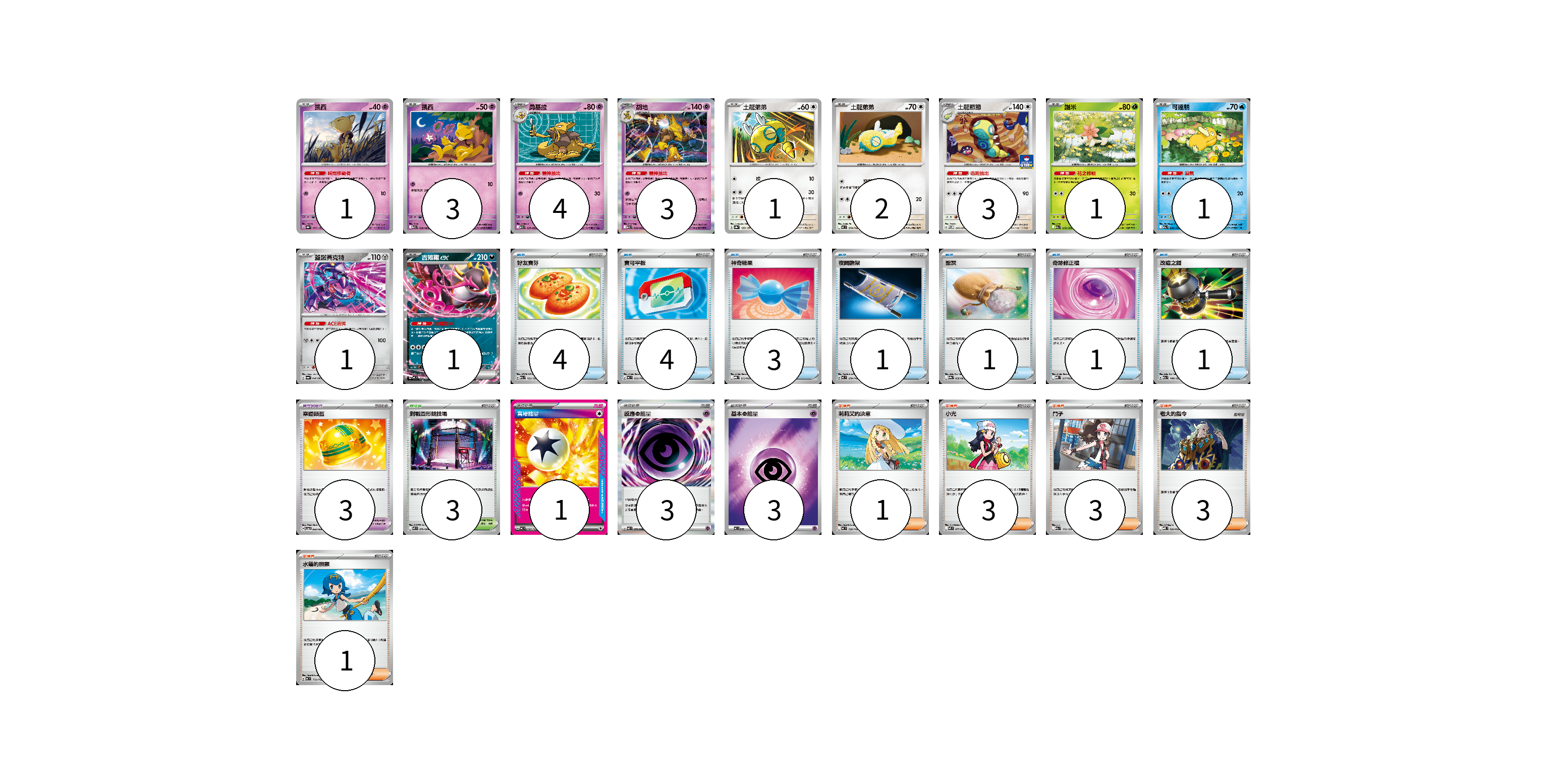 牌組構築方案 以此牌組為基礎新構築牌組 顯示卡面 顯示列表 寶可夢卡(21) 1 3 4 3 1 2 3 1 1 1 1 寶可夢道具(3) 3 物品卡(15) 4 4 3 1 1 1 1 支援者卡(11) 1 3 3 3 1 競技場卡(3) 3 能量卡(7) 1 3 3 寶可夢卡(21) 卡牌名稱 張數 卡牌名稱 張數 凱西 SV8a 057/187 01 凱西 M1S 036/063 03 勇基拉 M1S 037/063 04 胡地 M1S 038/063 03 土龍弟弟 SV8a 129/187 01 土龍弟弟 MC 574/742 02 土龍節節 M-P 045/M-P 03 謝米 M2a 012/193 01 可達鴨 M2a 032/193 01 蓋諾賽克特 SV6a 040/064 01 吉雉雞ex MC 489/742 01 寶可夢道具(3) 卡牌名稱 張數 卡牌名稱 張數 幸運頭盔 SV5a 060/066 03 物品卡(15) 卡牌名稱 張數 卡牌名稱 張數 好友寶芬 M2a 153/193 04 寶可平板 MC 662/742 04 神奇糖果 MBG 013/022 03 夜間擔架 MC 670/742 01 聖灰 SV9a 056/063 01 奇跡修正檔 MBD 017/022 01 改造之錘 M2a 148/193 01 支援者卡(11) 卡牌名稱 張數 卡牌名稱 張數 莉莉艾的決意 MC 729/742 01 小光 M2 077/080 03 鬥子 M2a 172/193 03 老大的指令 MBD 020/022 03 水蓮的照顧 MC 712/742 01 競技場卡(3) 卡牌名稱 張數 卡牌名稱 張數 對戰圓形競技場 M2 079/080 03 能量卡(7) 卡牌名稱 張數 卡牌名稱 張數 富裕能量 MC 740/742 01 感應【超】能量 M3 079/080 03 基本【超】能量 MC PSY 03 以此牌組為基礎新構築牌組 牌組編碼 AVrMBj-auhBol-aZnBBk copy 列印牌組單 牌組編碼已複製 分享至SNS