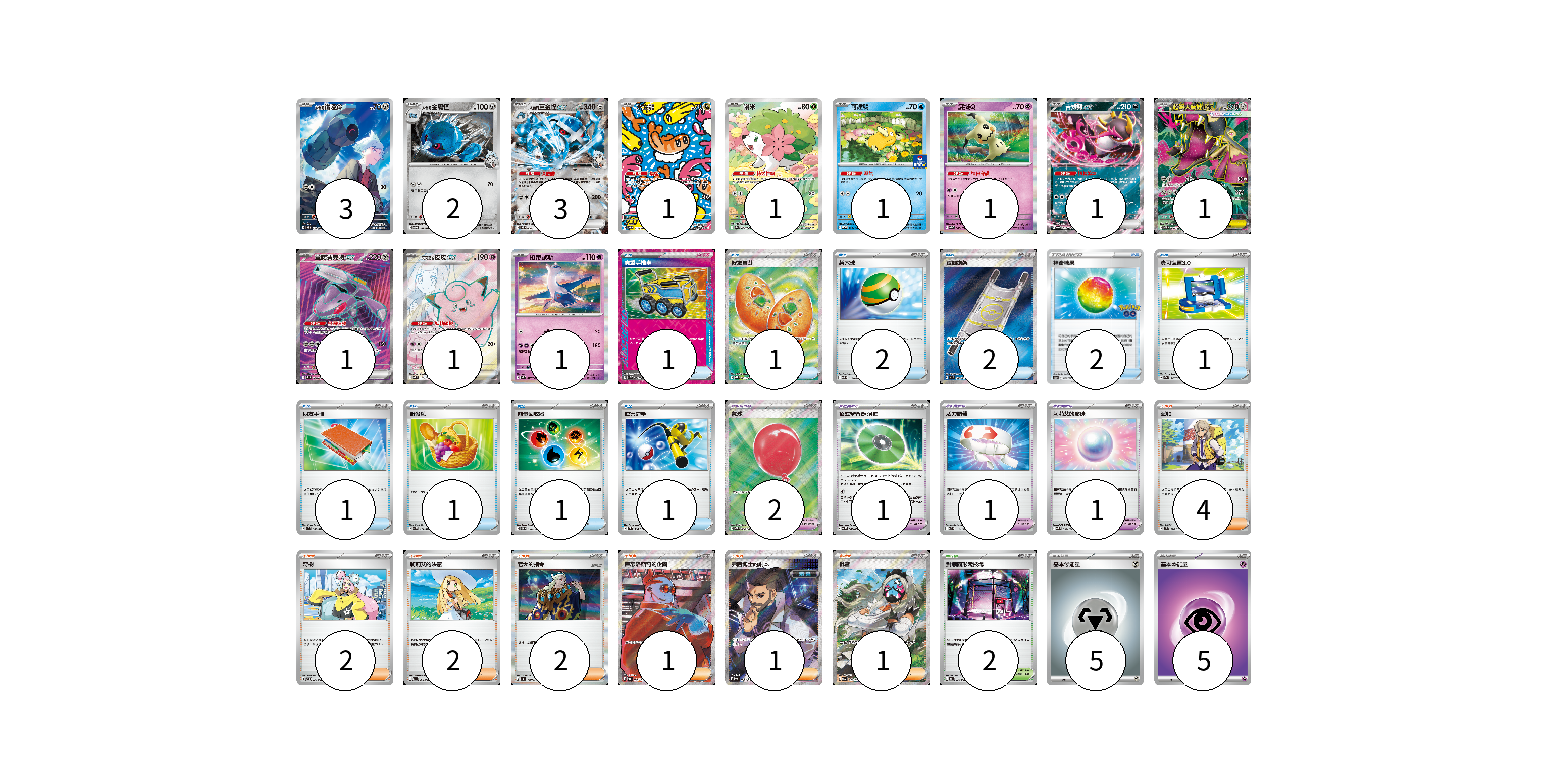 牌組構築方案 以此牌組為基礎新構築牌組 顯示卡面 顯示列表 寶可夢卡(17) 3 2 3 1 1 1 1 1 1 1 1 1 寶可夢道具(5) 2 1 1 1 物品卡(13) 1 1 2 2 2 1 1 1 1 1 支援者卡(13) 4 2 2 2 1 1 1 競技場卡(2) 2 能量卡(10) 5 5 寶可夢卡(17) 卡牌名稱 張數 卡牌名稱 張數 <大吾的>鐵啞鈴 SVOD 021/020 03 <大吾的>金屬怪 SVOD 007/020 02 <大吾的>巨金怪ex SVOD 008/020 03 米立龍 SV6 112/101 01 謝米 SV9a 066/063 01 可達鴨 SV-P 220/SV-P 01 謎擬Q SV4a 088/190 01 吉雉雞ex SV6a 038/064 01 超級大嘴娃ex M1L 080/063 01 蓋諾賽克特ex SV11B 164/086 01 莉莉艾的皮皮ex SV9 115/100 01 拉帝歐斯 SV4K 027/066 01 寶可夢道具(5) 卡牌名稱 張數 卡牌名稱 張數 氣球 M1L 084/063 02 招式學習器 演進 SV4M 063/066 01 活力頭帶 SVD 125/139 01 莉莉艾的珍珠 SV9 093/100 01 物品卡(13) 卡牌名稱 張數 卡牌名稱 張數 貴重手推車 SVK 020/042 01 好友寶芬 M1S 081/063 01 巢穴球 SVF 016/038 02 夜間擔架 M1L 083/063 02 神奇糖果 S10b 066/071 02 寶可裝置3.0 SVAM 017/023 01 朋友手冊 SV1S 069/078 01 野餐籃 SV1V 071/078 01 能量回收器 SVOM 010/021 01 厲害釣竿 SV2P 066/071 01 支援者卡(13) 卡牌名稱 張數 卡牌名稱 張數 派帕 SV1V 076/078 04 奇樹 SVF 029/038 02 莉莉艾的決意 M1L 062/063 02 老大的指令 SV1a 069/073 02 庫瑟洛斯奇的企圖 SV6a 086/064 01 弗圖博士的劇本 SV4M 086/066 01 枇琶 SV5K 091/071 01 競技場卡(2) 卡牌名稱 張數 卡牌名稱 張數 對戰圓形競技場 M2 079/080 02 能量卡(10) 卡牌名稱 張數 卡牌名稱 張數 基本【鋼】能量 SVTH MET 05 基本【超】能量 SVTS PSY 05 以此牌組為基礎新構築牌組 牌組編碼 AXgjHK-QZqrMo-quVGlb copy 列印牌組單 牌組編碼已複製 分享至SNS