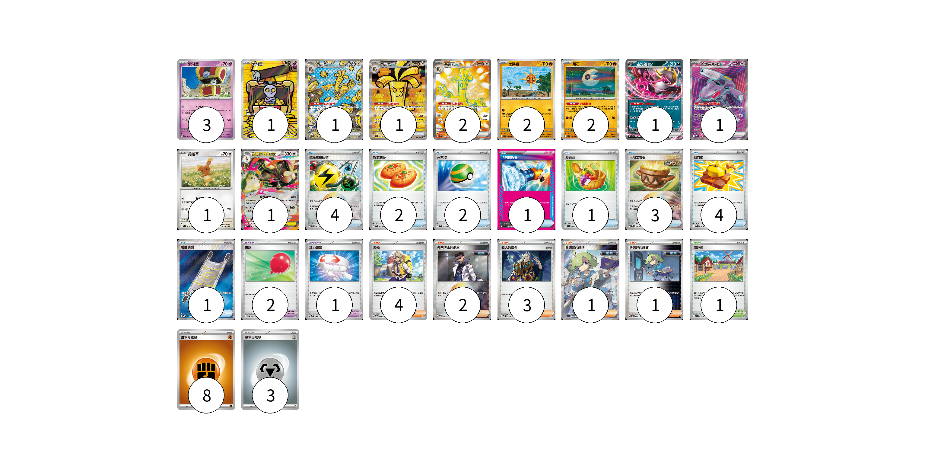 牌組構築方案 以此牌組為基礎新構築牌組 顯示卡面 顯示列表 寶可夢卡(16) 3 1 1 1 2 2 2 1 1 1 1 寶可夢道具(3) 2 1 物品卡(18) 4 2 2 1 1 3 4 1 支援者卡(11) 4 2 3 1 1 競技場卡(1) 1 能量卡(11) 8 3 寶可夢卡(16) 卡牌名稱 張數 卡牌名稱 張數 索財靈 SV7a 024/064 03 索財靈 SV3a 068/062 01 賽富豪ex SV8a 220/187 01 賽富豪ex SV3a 087/062 01 賽富豪ex SV3a 079/062 02 太陽岩 M1L 027/063 02 月石 M1L 026/063 02 吉雉雞ex SVOM 009/021 01 蓋諾賽克特ex SV11B 164/086 01 捲捲耳 M2 071/080 01 超級長耳兔ex M2 072/080 01 寶可夢道具(3) 卡牌名稱 張數 卡牌名稱 張數 氣球 MBG 019/022 02 活力頭帶 SVM 140/175 01 物品卡(18) 卡牌名稱 張數 卡牌名稱 張數 超級能量回收 SV8a 141/187 04 好友寶芬 MBD 013/022 02 巢穴球 SVK 016/042 02 頂尖捕捉器 MBG 014/022 01 野餐籃 SV1V 071/078 01 大地之容器 SV8a 143/187 03 戰鬥鑼 M1L 059/063 04 夜間擔架 M1L 083/063 01 支援者卡(11) 卡牌名稱 張數 卡牌名稱 張數 派帕 SVOD 018/020 04 弗圖博士的劇本 SV8a 175/187 02 老大的指令 MBD 020/022 03 暗碼迷的解讀 SV5M 090/071 01 暗碼迷的解讀 SV5M 067/071 01 競技場卡(1) 卡牌名稱 張數 卡牌名稱 張數 深缽鎮 SVK 039/042 01 能量卡(11) 卡牌名稱 張數 卡牌名稱 張數 基本【鬥】能量 SVAM FIG 08 基本鋼能量 sv-p MET 03 以此牌組為基礎新構築牌組 牌組編碼 AZnhdU-VqFmuO-JJyfmp copy 列印牌組單 牌組編碼已複製 分享至SNS