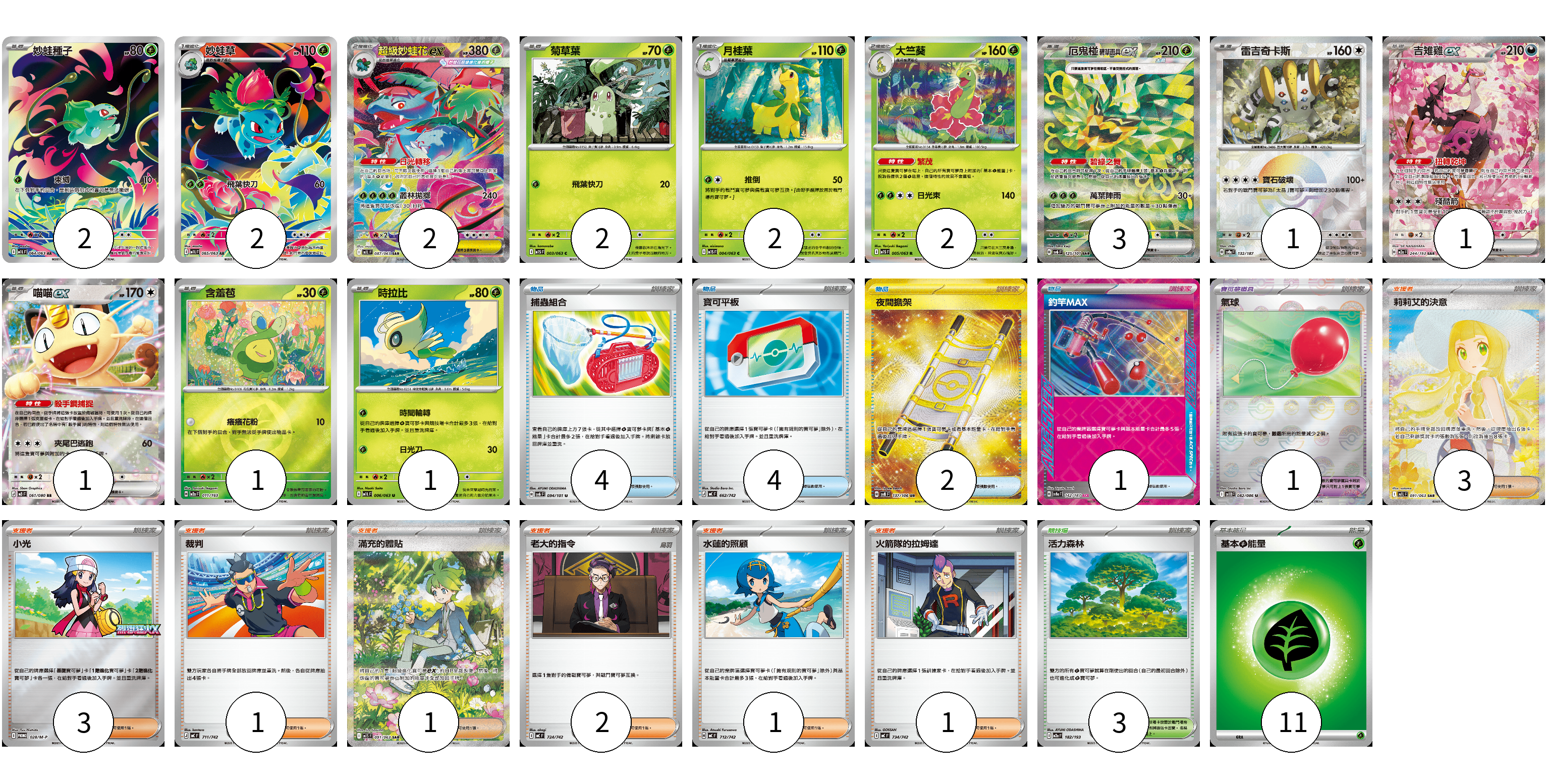 牌組構築方案 以此牌組為基礎新構築牌組 顯示卡面 顯示列表 寶可夢卡(20) 2 2 2 2 2 2 3 1 1 1 1 1 寶可夢道具(1) 1 物品卡(11) 4 4 2 1 支援者卡(12) 3 3 1 1 2 1 1 競技場卡(3) 3 能量卡(11) 11 寶可夢卡(20) 卡牌名稱 張數 卡牌名稱 張數 妙蛙種子 M1L 064/063 02 妙蛙草 M1L 065/063 02 超級妙蛙花ex M1L 087/063 02 菊草葉 M1S 003/063 02 月桂葉 M1S 004/063 02 大竺葵 M1S 005/063 02 厄鬼椪 碧草面具ex SV6 125/101 03 雷吉奇卡斯 SV8a 132/187 01 吉雉雞ex M2a 244/193 01 喵喵ex M3 061/080 01 含羞苞 M2a 011/193 01 時拉比 M1L 006/063 01 寶可夢道具(1) 卡牌名稱 張數 卡牌名稱 張數 氣球 SV11B 082/086 01 物品卡(11) 卡牌名稱 張數 卡牌名稱 張數 捕蟲組合 SV6 094/101 04 寶可平板 MC 662/742 04 夜間擔架 SV8 137/106 02 釣竿MAX SV8a 142/187 01 支援者卡(12) 卡牌名稱 張數 卡牌名稱 張數 莉莉艾的決意 M1L 091/063 03 小光 M-P 028/M-P 03 裁判 MC 711/742 01 滿充的體貼 M1S 091/063 01 老大的指令 MC 724/742 02 水蓮的照顧 MC 712/742 01 火箭隊的拉姆達 MC 734/742 01 競技場卡(3) 卡牌名稱 張數 卡牌名稱 張數 活力森林 M2a 182/193 03 能量卡(11) 卡牌名稱 張數 卡牌名稱 張數 基本【草】能量 MC GRA 11 以此牌組為基礎新構築牌組 牌組編碼 AamMsi-NepiTS-FgrAmd copy 列印牌組單 牌組編碼已複製 分享至SNS