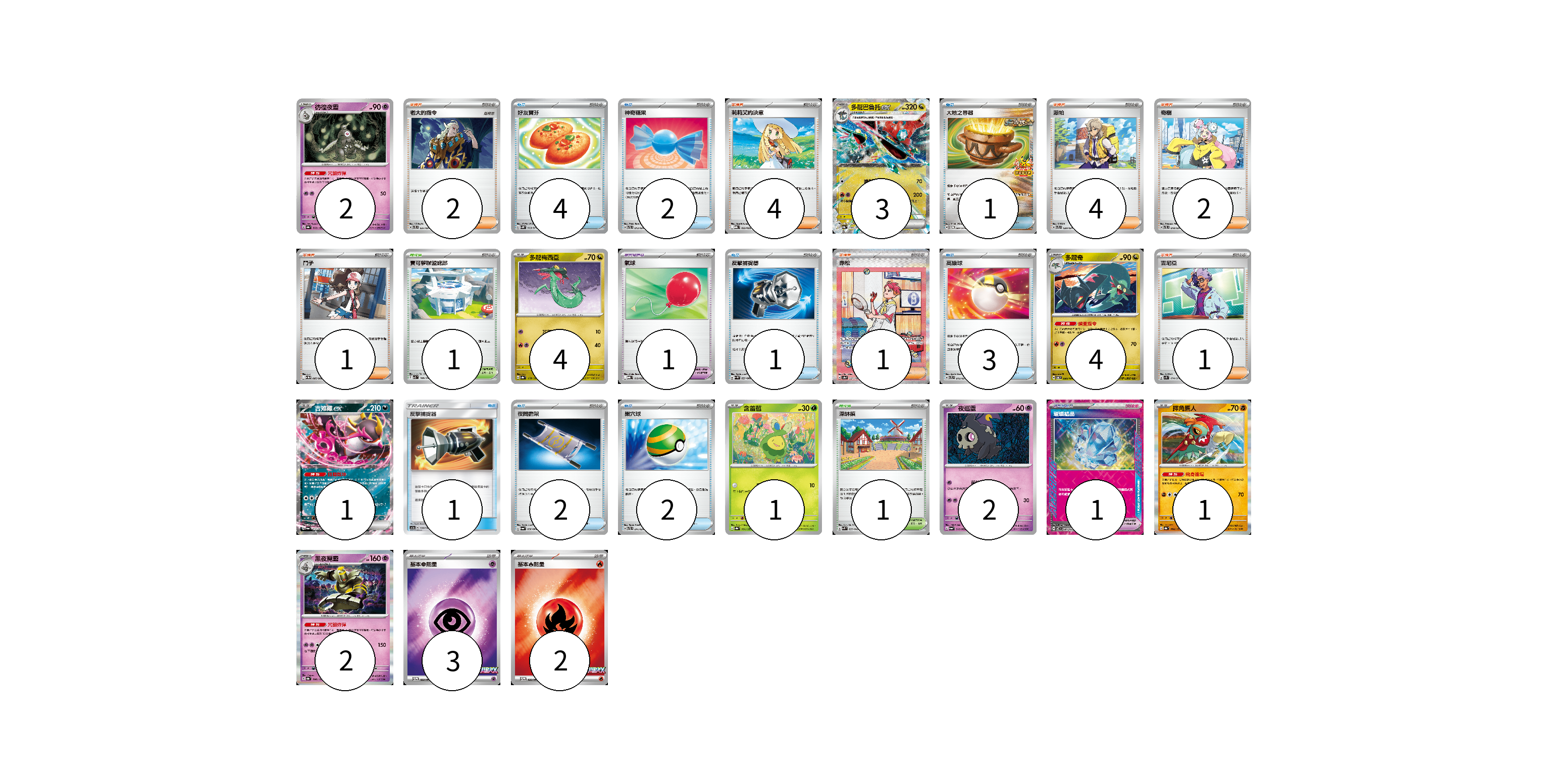 牌組構築方案 以此牌組為基礎新構築牌組 顯示卡面 顯示列表 寶可夢卡(20) 2 3 4 4 1 1 2 1 2 寶可夢道具(4) 2 1 1 物品卡(16) 4 2 1 1 3 1 2 2 支援者卡(13) 2 4 4 1 1 1 競技場卡(2) 1 1 能量卡(5) 3 2 寶可夢卡(20) 卡牌名稱 張數 卡牌名稱 張數 彷徨夜靈 SV8a 065/187 02 多龍巴魯托ex SV8a 120/187 03 多龍梅西亞 SV8a 118/187 04 多龍奇 SV6 080/101 04 吉雉雞ex SV6a 038/064 01 含羞苞 SV8a 001/187 01 夜巡靈 SV6a 018/064 02 摔角鷹人 SV8a 084/187 01 黑夜魔靈 SV8a 066/187 02 寶可夢道具(4) 卡牌名稱 張數 卡牌名稱 張數 奇樹 SVTL 018/021 02 氣球 MBG 019/022 01 璀璨結晶 SV7 094/102 01 物品卡(16) 卡牌名稱 張數 卡牌名稱 張數 好友寶芬 SV5K 063/071 04 神奇糖果 SVTL 013/021 02 大地之容器 SV-P 084/SV-P 01 反擊捕捉器 SV4M 059/066 01 高級球 SVTL 012/021 03 反擊捕捉器 AC1a 130/158 01 夜間擔架 SV6a 056/064 02 巢穴球 SVTL 011/021 02 支援者卡(13) 卡牌名稱 張數 卡牌名稱 張數 老大的指令 SVTL 021/021 02 莉莉艾的決意 MBG 022/022 04 派帕 SVTL 020/021 04 鬥子 SV11W 085/086 01 赤松 SV8a 227/187 01 吉尼亞 SV1S 074/078 01 競技場卡(2) 卡牌名稱 張數 卡牌名稱 張數 寶可夢聯盟總部 SV3 108/108 01 深缽鎮 SVK 039/042 01 能量卡(5) 卡牌名稱 張數 卡牌名稱 張數 基本【超】能量 M-P 033/M-P 03 基本【火】能量 M-P 032/M-P 02 以此牌組為基礎新構築牌組 牌組編碼 AbCdBB-QNxHSn-ZffVGw copy 列印牌組單 牌組編碼已複製 分享至SNS