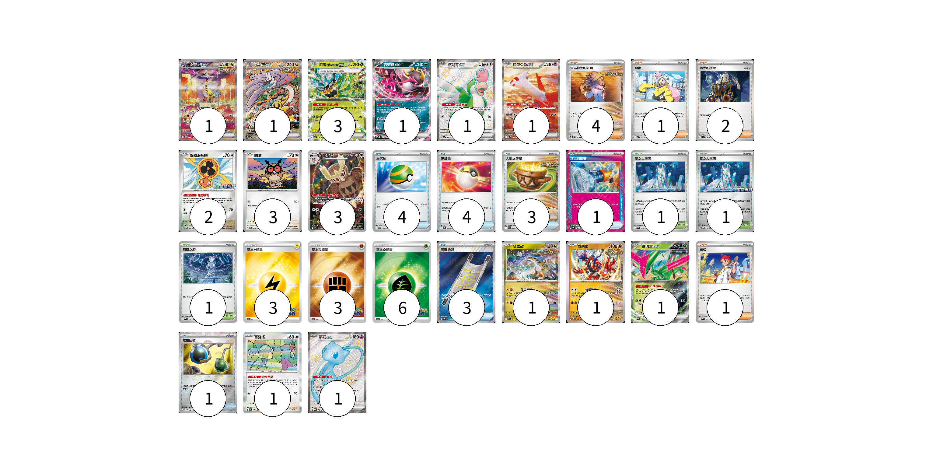 牌組構築方案 以此牌組為基礎新構築牌組 顯示卡面 顯示列表 寶可夢卡(21) 1 1 3 1 1 1 2 3 3 1 1 1 1 1 物品卡(16) 4 4 3 1 3 1 支援者卡(8) 4 1 2 1 競技場卡(3) 1 1 1 能量卡(12) 3 3 6 寶可夢卡(21) 卡牌名稱 張數 卡牌名稱 張數 猛雷鼓ex SV5K 095/071 01 猛雷鼓ex SV8a 222/187 01 厄鬼椪 碧草面具ex SV6 016/101 03 吉雉雞ex SV8a 104/187 01 怒鸚哥ex SV4a 337/190 01 拉帝亞斯ex SV7a 087/064 01 旋轉洛托姆 SV-P 146/SV-P 02 咕咕 SV7 076/102 03 貓頭夜鷹 SV7 114/102 03 猛雷鼓 SV7 075/102 01 故勒頓 SV8 069/106 01 鐵斑葉ex SV8a 016/187 01 百變怪 SV2a 132/165 01 夢幻ex SV4a 327/190 01 物品卡(16) 卡牌名稱 張數 卡牌名稱 張數 巢穴球 SVEL 011/020 04 高級球 SV4a 161/190 04 大地之容器 SV4K 060/066 03 頂尖捕捉器 SV8a 148/187 01 夜間擔架 M1L 083/063 03 能量回收 SV11W 079/086 01 支援者卡(8) 卡牌名稱 張數 卡牌名稱 張數 奧琳博士的氣魄 SV4K 064/066 04 奇樹 SVM 160/175 01 老大的指令 SVK 036/042 02 赤松 SV8a 163/187 01 競技場卡(3) 卡牌名稱 張數 卡牌名稱 張數 零之大空洞 SV8a 182/187 01 零之大空洞 SV-P 151/SV-P 01 阻礙之塔 SV8a 181/187 01 能量卡(12) 卡牌名稱 張數 卡牌名稱 張數 基本雷能量 S10b LIG 03 基本鬥能量 S10b FIG 03 基本草能量 S10b GRA 06 以此牌組為基礎新構築牌組 牌組編碼 AcrHhJ-eRpaUq-qyneQN copy 列印牌組單 牌組編碼已複製 分享至SNS