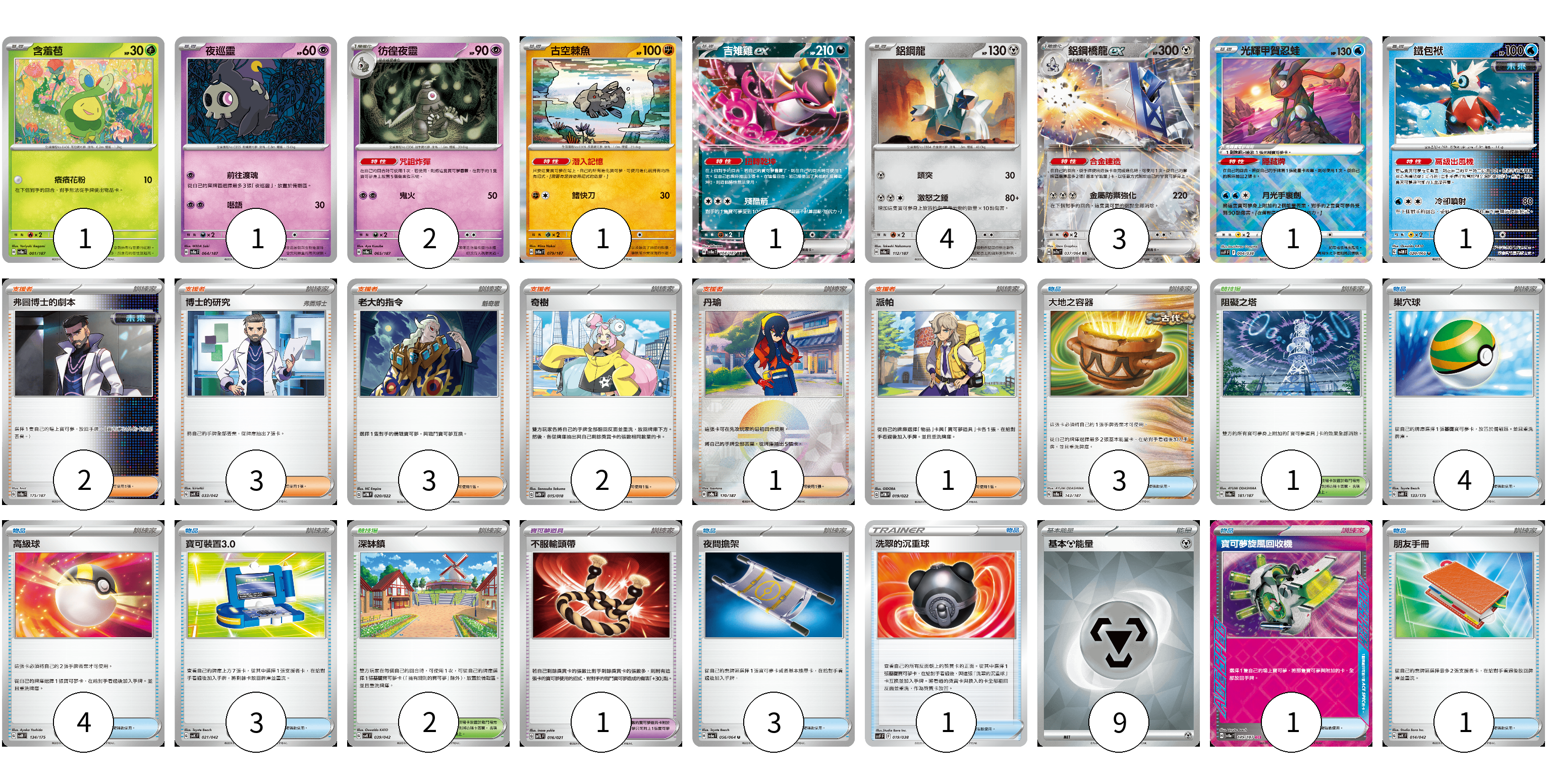 牌組構築方案 以此牌組為基礎新構築牌組 顯示卡面 顯示列表 寶可夢卡(15) 1 1 2 1 1 4 3 1 1 寶可夢道具(1) 1 物品卡(20) 3 4 4 3 3 1 1 1 支援者卡(12) 2 3 3 2 1 1 競技場卡(3) 1 2 能量卡(9) 9 寶可夢卡(15) 卡牌名稱 張數 卡牌名稱 張數 含羞苞 SV8a 001/187 01 夜巡靈 SV8a 064/187 01 彷徨夜靈 SV8a 065/187 02 古空棘魚 SV8a 079/187 01 吉雉雞ex SV8a 104/187 01 鋁鋼龍 SV8a 112/187 04 鋁鋼橋龍ex SV7a 037/064 03 光輝甲賀忍蛙 SVF 004/038 01 鐵包袱 SV4M 020/066 01 寶可夢道具(1) 卡牌名稱 張數 卡牌名稱 張數 不服輸頭帶 SVTL 016/021 01 物品卡(20) 卡牌名稱 張數 卡牌名稱 張數 大地之容器 SV8a 143/187 03 巢穴球 SVM 133/175 04 高級球 SVM 134/175 04 寶可裝置3.0 SVK 021/042 03 夜間擔架 SV6a 056/064 03 洗翠的沉重球 SVF 019/038 01 寶可夢旋風回收機 SV8a 149/187 01 朋友手冊 SVK 014/042 01 支援者卡(12) 卡牌名稱 張數 卡牌名稱 張數 弗圖博士的劇本 SV8a 175/187 02 博士的研究 SVK 033/042 03 老大的指令 SVTM 020/022 03 奇樹 SVTH 015/018 02 丹瑜 SV8a 170/187 01 派帕 SVTM 019/022 01 競技場卡(3) 卡牌名稱 張數 卡牌名稱 張數 阻礙之塔 SV8a 181/187 01 深缽鎮 SVK 039/042 02 能量卡(9) 卡牌名稱 張數 卡牌名稱 張數 基本【鋼】能量 SVM MET 09 以此牌組為基礎新構築牌組 牌組編碼 AfnbAw-RwltaN-VIMjgG copy 列印牌組單 牌組編碼已複製 分享至SNS