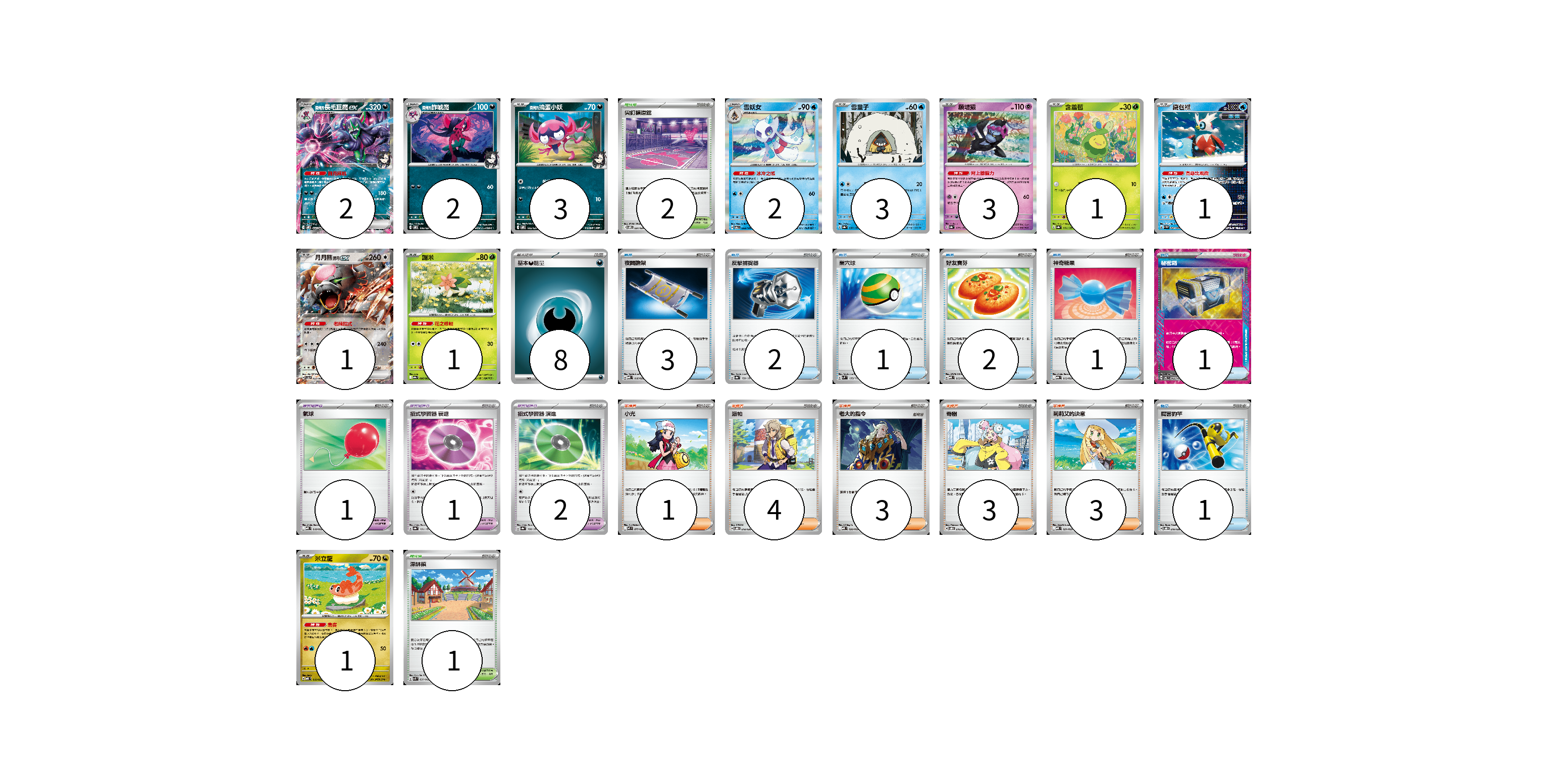 牌組構築方案 以此牌組為基礎新構築牌組 顯示卡面 顯示列表 寶可夢卡(20) 2 2 3 2 3 3 1 1 1 1 1 寶可夢道具(4) 1 1 2 物品卡(11) 3 2 1 2 1 1 1 支援者卡(14) 1 4 3 3 3 競技場卡(3) 2 1 能量卡(8) 8 寶可夢卡(20) 卡牌名稱 張數 卡牌名稱 張數 <瑪俐的>長毛巨魔ex SVOM 007/021 02 <瑪俐的>詐唬魔 SVOM 006/021 02 <瑪俐的>搗蛋小妖 SVOM 005/021 03 雪妖女 SV6 033/101 02 雪童子 SV8a 037/187 03 願增猿 SV8a 075/187 03 含羞苞 SV8a 001/187 01 鐵包袱 SV4M 020/066 01 月月熊 赫月 ex SV5a 052/066 01 謝米 SV9a 006/063 01 米立龍 MBD 010/022 01 寶可夢道具(4) 卡牌名稱 張數 卡牌名稱 張數 氣球 MBD 018/022 01 招式學習器 衰退 SV8a 161/187 01 招式學習器 演進 SV8a 160/187 02 物品卡(11) 卡牌名稱 張數 卡牌名稱 張數 夜間擔架 MBD 016/022 03 反擊捕捉器 SV8a 139/187 02 巢穴球 SVM 133/175 01 好友寶芬 MBD 013/022 02 神奇糖果 MBG 013/022 01 秘密箱 SV6 092/101 01 厲害釣竿 SVOD 010/020 01 支援者卡(14) 卡牌名稱 張數 卡牌名稱 張數 小光 M2 077/080 01 派帕 SVOD 018/020 04 老大的指令 MBD 020/022 03 奇樹 SVOD 016/020 03 莉莉艾的決意 MBD 021/022 03 競技場卡(3) 卡牌名稱 張數 卡牌名稱 張數 尖釘鎮道館 SVOM 021/021 02 深缽鎮 SVK 039/042 01 能量卡(8) 卡牌名稱 張數 卡牌名稱 張數 基本惡能量 sv-p DAR 08 以此牌組為基礎新構築牌組 牌組編碼 AgPTvt-pQSGUU-XJmyNw copy 列印牌組單 牌組編碼已複製 分享至SNS