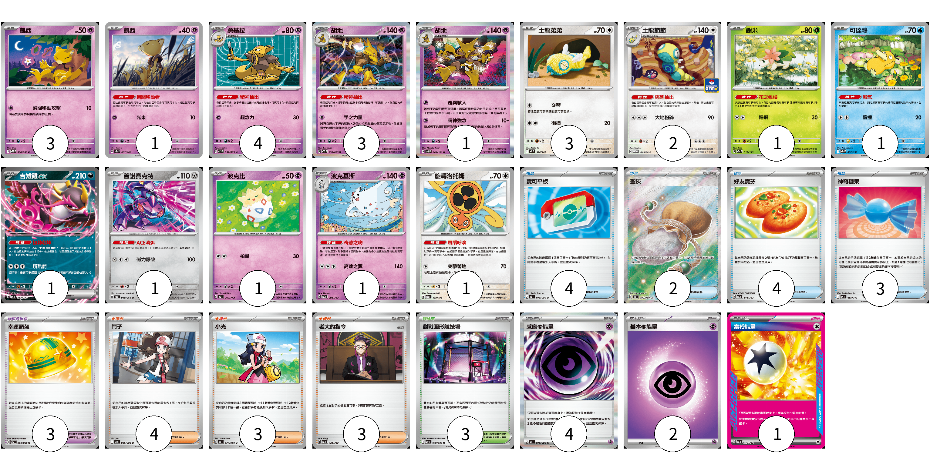 牌組構築方案 以此牌組為基礎新構築牌組 顯示卡面 顯示列表 寶可夢卡(24) 3 1 4 3 1 3 2 1 1 1 1 1 1 1 寶可夢道具(3) 3 物品卡(13) 4 2 4 3 支援者卡(10) 4 3 3 競技場卡(3) 3 能量卡(7) 4 2 1 寶可夢卡(24) 卡牌名稱 張數 卡牌名稱 張數 凱西 M1S 036/063 03 凱西 SV8a 057/187 01 勇基拉 M1S 037/063 04 胡地 M1S 038/063 03 胡地 SV6 049/101 01 土龍弟弟 MC 574/742 03 土龍節節 M-P 045/M-P 02 謝米 M2a 012/193 01 可達鴨 M2a 032/193 01 吉雉雞ex MC 489/742 01 蓋諾賽克特 SV6a 040/064 01 波克比 MC 291/742 01 波克基斯 MC 293/742 01 旋轉洛托姆 M2a 139/193 01 寶可夢道具(3) 卡牌名稱 張數 卡牌名稱 張數 幸運頭盔 SV5a 060/066 03 物品卡(13) 卡牌名稱 張數 卡牌名稱 張數 寶可平板 M3 070/080 04 聖灰 M3 102/080 02 好友寶芬 MC 648/742 04 神奇糖果 MC 655/742 03 支援者卡(10) 卡牌名稱 張數 卡牌名稱 張數 鬥子 SV11W 085/086 04 小光 M2 077/080 03 老大的指令 MC 724/742 03 競技場卡(3) 卡牌名稱 張數 卡牌名稱 張數 對戰圓形競技場 M2 079/080 03 能量卡(7) 卡牌名稱 張數 卡牌名稱 張數 感應【超】能量 M3 079/080 04 基本【超】能量 MC PSY 02 富裕能量 MC 740/742 01 以此牌組為基礎新構築牌組 牌組編碼 AgUiYh-jBuSsc-qkyTxb copy 列印牌組單 牌組編碼已複製 分享至SNS