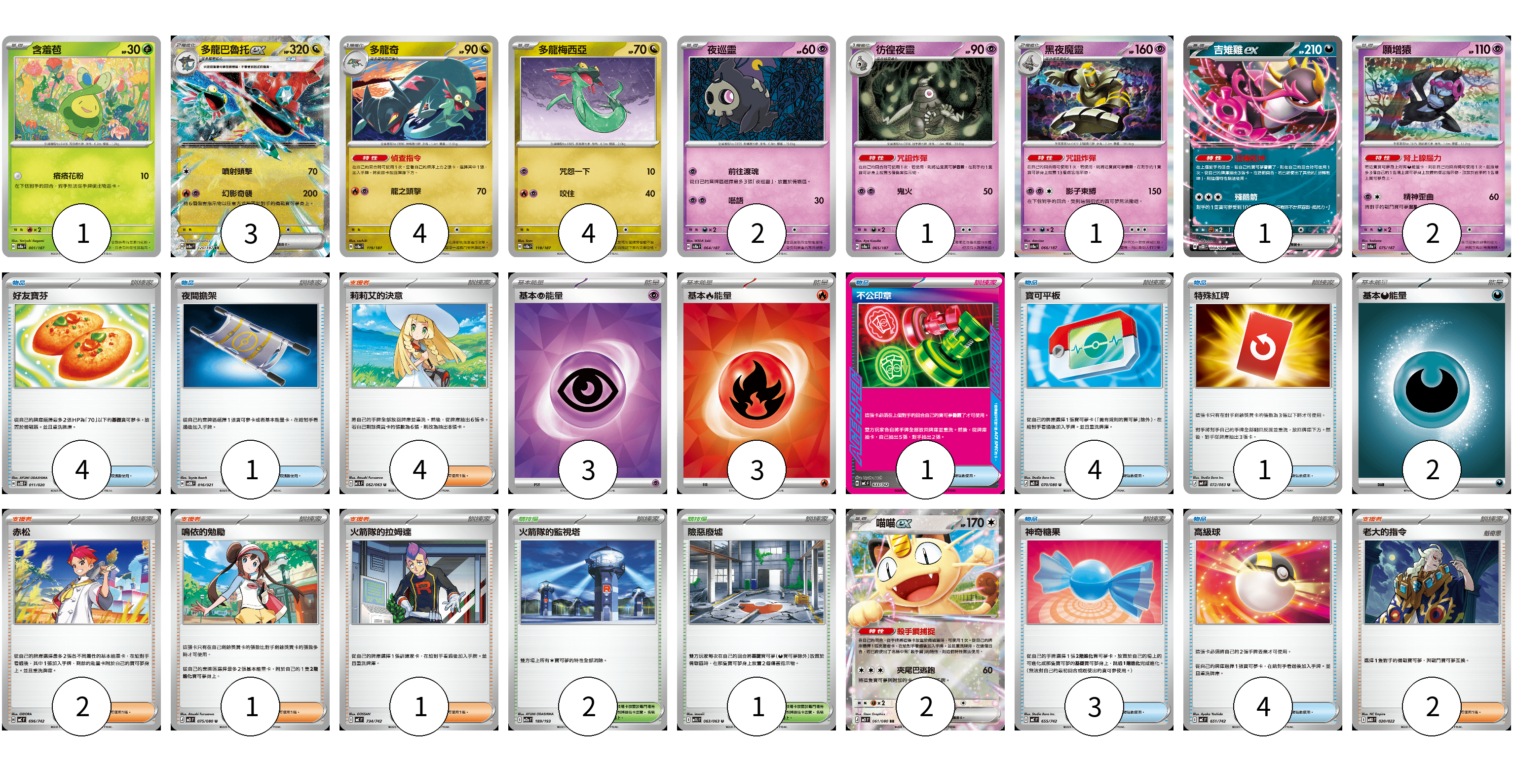 牌組構築方案 以此牌組為基礎新構築牌組 顯示卡面 顯示列表 寶可夢卡(21) 1 3 4 4 2 1 1 1 2 2 物品卡(18) 4 1 1 4 1 3 4 支援者卡(10) 4 2 1 1 2 競技場卡(3) 2 1 能量卡(8) 3 3 2 寶可夢卡(21) 卡牌名稱 張數 卡牌名稱 張數 含羞苞 SV8a 001/187 01 多龍巴魯托ex SV8a 120/187 03 多龍奇 SV8a 119/187 04 多龍梅西亞 SV8a 118/187 04 夜巡靈 SV8a 064/187 02 彷徨夜靈 SV8a 065/187 01 黑夜魔靈 SV8a 066/187 01 吉雉雞ex SVOD 004/020 01 願增猿 SV8a 075/187 02 喵喵ex M3 061/080 02 物品卡(18) 卡牌名稱 張數 卡牌名稱 張數 好友寶芬 SVOD 011/020 04 夜間擔架 SVOM 016/021 01 不公印章 MC 633/742 01 寶可平板 M3 070/080 04 特殊紅牌 M4 072/083 01 神奇糖果 MC 655/742 03 高級球 MC 651/742 04 支援者卡(10) 卡牌名稱 張數 卡牌名稱 張數 莉莉艾的決意 M1L 062/063 04 赤松 MC 696/742 02 鳴依的勉勵 M3 075/080 01 火箭隊的拉姆達 MC 734/742 01 老大的指令 MBD 020/022 02 競技場卡(3) 卡牌名稱 張數 卡牌名稱 張數 火箭隊的監視塔 M2a 189/193 02 險惡廢墟 M1L 063/063 01 能量卡(8) 卡牌名稱 張數 卡牌名稱 張數 基本【超】能量 SVOD PSY 03 基本【火】能量 SVQL FIR 03 基本【惡】能量 MC DAR 02 以此牌組為基礎新構築牌組 牌組編碼 AgeeiW-oeliPG-hlLcaG copy 列印牌組單 牌組編碼已複製 分享至SNS
