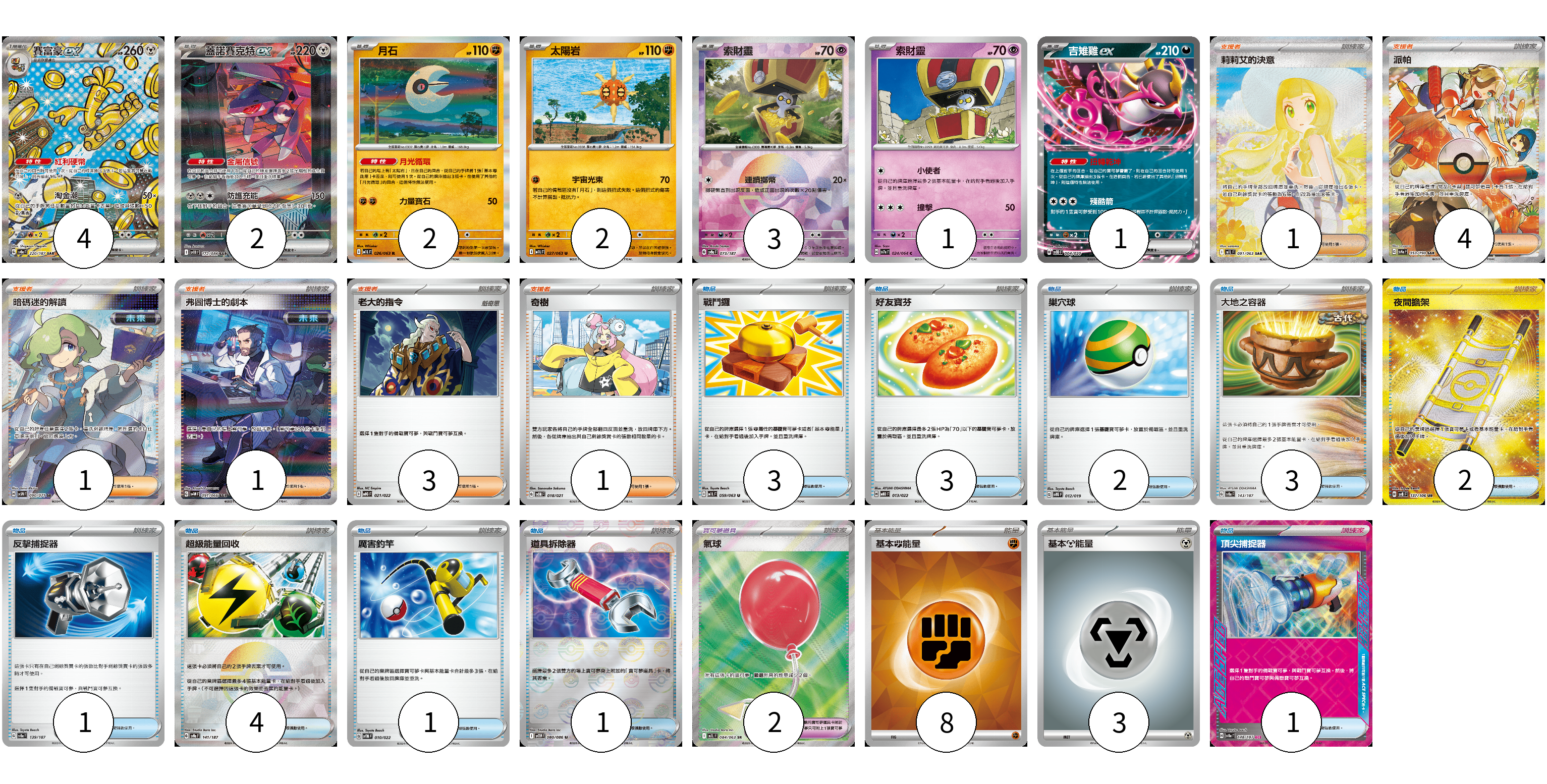 牌組構築方案 以此牌組為基礎新構築牌組 顯示卡面 顯示列表 寶可夢卡(15) 4 2 2 2 3 1 1 寶可夢道具(2) 2 物品卡(21) 3 3 2 3 2 1 4 1 1 1 支援者卡(11) 1 4 1 1 3 1 能量卡(11) 8 3 寶可夢卡(15) 卡牌名稱 張數 卡牌名稱 張數 賽富豪ex SV8a 220/187 04 蓋諾賽克特ex SV11B 172/086 02 月石 M1L 026/063 02 太陽岩 M1L 027/063 02 索財靈 SV8a 073/187 03 索財靈 SV7a 024/064 01 吉雉雞ex SVOD 004/020 01 寶可夢道具(2) 卡牌名稱 張數 卡牌名稱 張數 氣球 M1L 084/063 02 物品卡(21) 卡牌名稱 張數 卡牌名稱 張數 戰鬥鑼 M1L 059/063 03 好友寶芬 MBD 013/022 03 巢穴球 SVTG 012/019 02 大地之容器 SV8a 143/187 03 夜間擔架 SV8 137/106 02 反擊捕捉器 SV8a 139/187 01 超級能量回收 SV8a 141/187 04 厲害釣竿 SVTM 010/022 01 道具拆除器 SV11W 080/086 01 頂尖捕捉器 SV8a 148/187 01 支援者卡(11) 卡牌名稱 張數 卡牌名稱 張數 莉莉艾的決意 M1L 091/063 01 派帕 SV4a 353/190 04 暗碼迷的解讀 SV5M 090/071 01 弗圖博士的劇本 SV4M 091/066 01 老大的指令 MBG 021/022 03 奇樹 SVOM 018/021 01 能量卡(11) 卡牌名稱 張數 卡牌名稱 張數 基本【鬥】能量 SVK FIG 08 基本【鋼】能量 SVB MET 03 以此牌組為基礎新構築牌組 牌組編碼 AhCmvQ-kLLxHA-aHxQkz copy 列印牌組單 牌組編碼已複製 分享至SNS