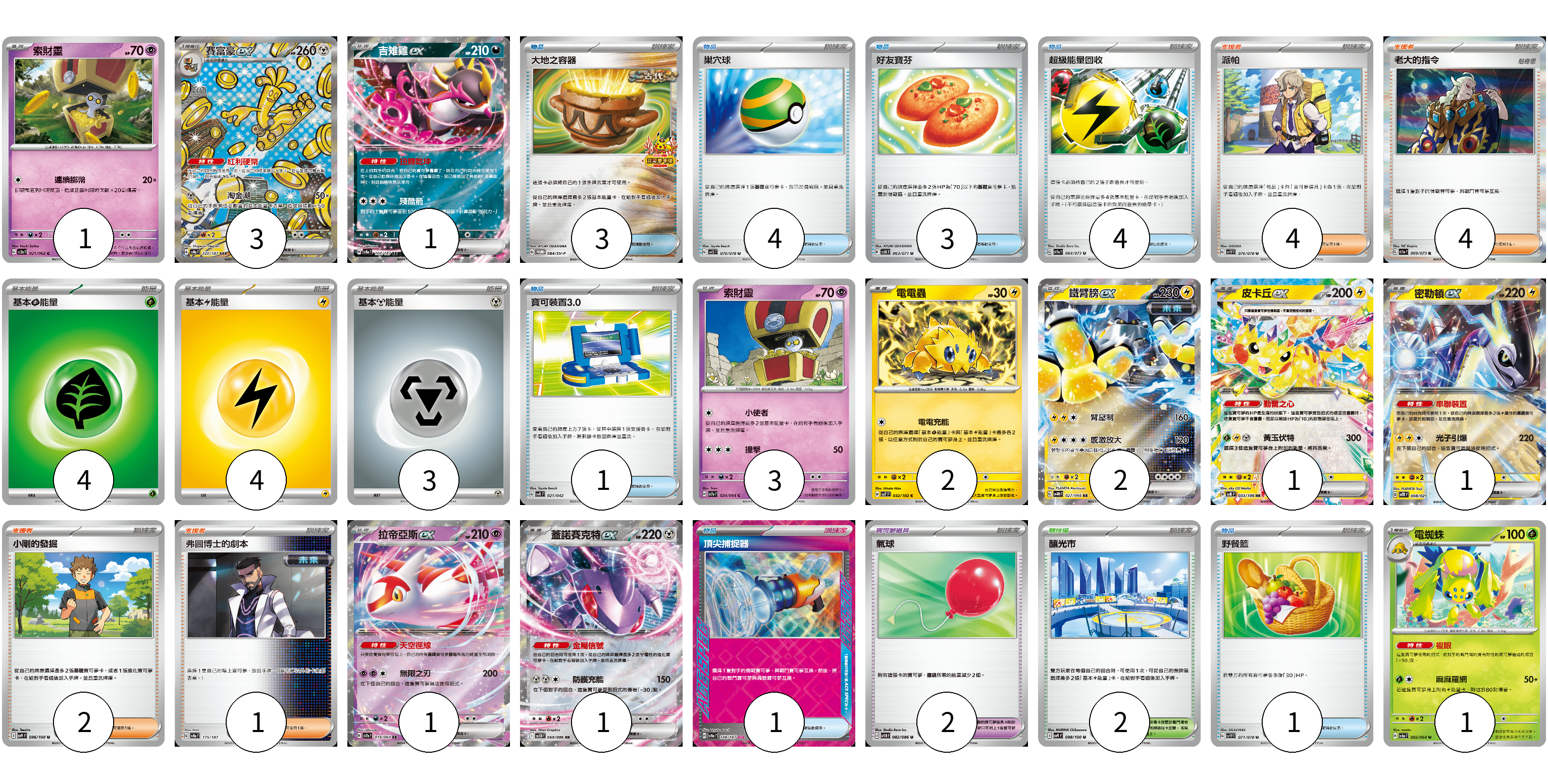 牌組構築方案 以此牌組為基礎新構築牌組 顯示卡面 顯示列表 寶可夢卡(17) 1 3 1 3 2 2 1 1 1 1 1 寶可夢道具(2) 2 物品卡(17) 3 4 3 4 1 1 1 支援者卡(11) 4 4 2 1 競技場卡(2) 2 能量卡(11) 4 4 3 寶可夢卡(17) 卡牌名稱 張數 卡牌名稱 張數 索財靈 SV3a 021/062 01 賽富豪ex SV8a 220/187 03 吉雉雞ex SV8a 104/187 01 索財靈 SV7a 024/064 03 電電蟲 SV7 032/102 02 鐵臂膀ex SV4M 027/066 02 皮卡丘ex SV8 033/106 01 密勒頓ex SVTR 008/021 01 拉帝亞斯ex SV7a 019/064 01 蓋諾賽克特ex SV11B 069/086 01 電蜘蛛 SV6a 002/064 01 寶可夢道具(2) 卡牌名稱 張數 卡牌名稱 張數 氣球 SV11B 082/086 02 物品卡(17) 卡牌名稱 張數 卡牌名稱 張數 大地之容器 SV-P 084/SV-P 03 巢穴球 SV1S 070/078 04 好友寶芬 SV5K 063/071 03 超級能量回收 SV1a 064/073 04 寶可裝置3.0 SVK 021/042 01 頂尖捕捉器 SV8a 148/187 01 野餐籃 SV1V 071/078 01 支援者卡(11) 卡牌名稱 張數 卡牌名稱 張數 派帕 SV1V 076/078 04 老大的指令 SV1a 069/073 04 小剛的發掘 SV9 096/100 02 弗圖博士的劇本 SV8a 175/187 01 競技場卡(2) 卡牌名稱 張數 卡牌名稱 張數 釀光市 SV9 098/100 02 能量卡(11) 卡牌名稱 張數 卡牌名稱 張數 基本草能量 sv-p GRA 04 基本雷能量 sv-p LIG 04 基本鋼能量 sv-p MET 03 以此牌組為基礎新構築牌組 牌組編碼 AheiuK-VDMira-XkNDvS copy 列印牌組單 牌組編碼已複製 分享至SNS