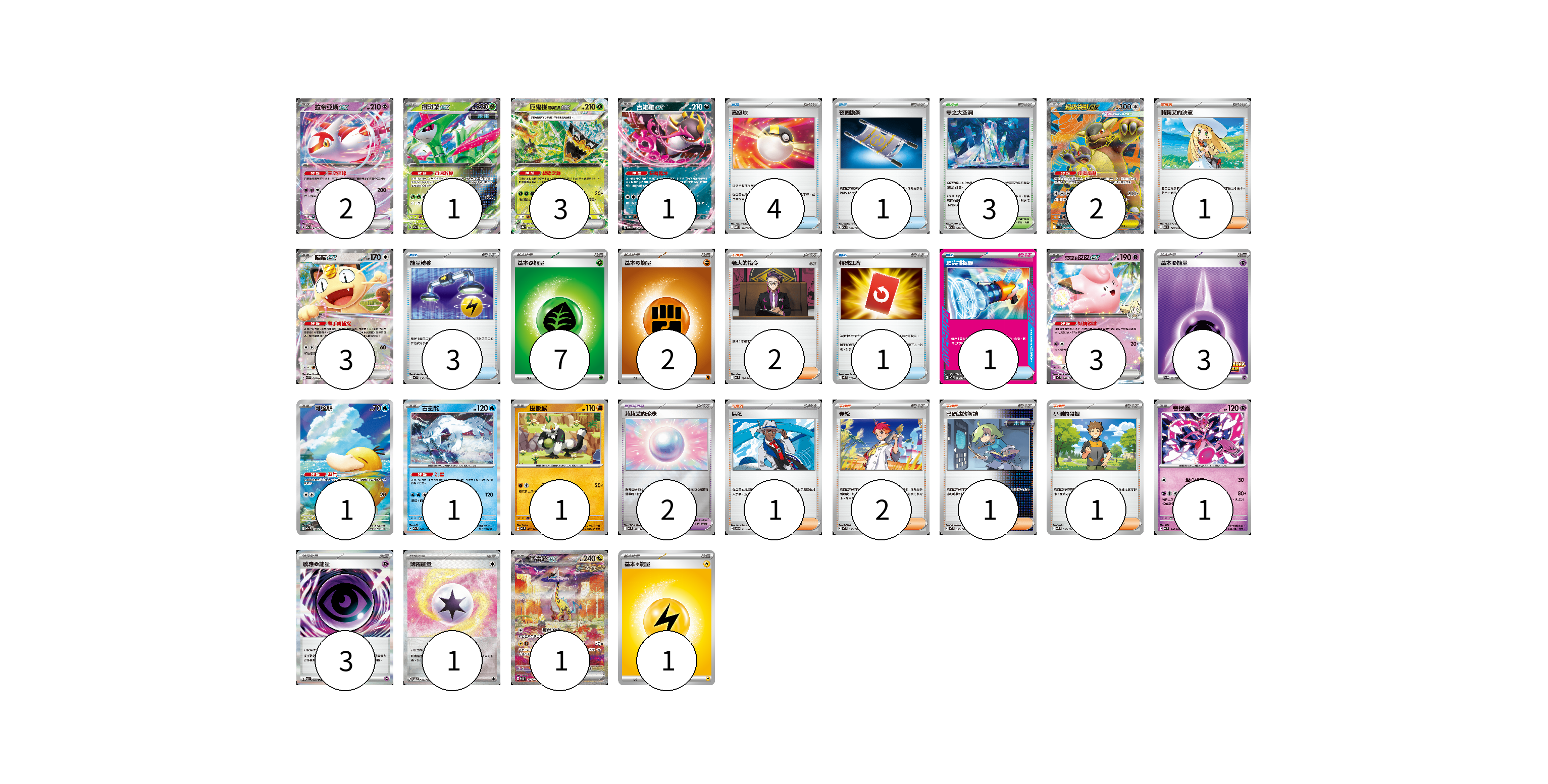牌組構築方案 以此牌組為基礎新構築牌組 顯示卡面 顯示列表 寶可夢卡(20) 2 1 3 1 2 3 3 1 1 1 1 1 寶可夢道具(2) 2 物品卡(10) 4 1 3 1 1 支援者卡(8) 1 2 1 2 1 1 競技場卡(3) 3 能量卡(17) 7 2 3 3 1 1 寶可夢卡(20) 卡牌名稱 張數 卡牌名稱 張數 拉帝亞斯ex M2a 075/193 02 鐵斑葉ex SV5M 016/071 01 厄鬼椪 碧草面具ex SV8a 020/187 03 吉雉雞ex M2a 114/193 01 超級袋獸ex M1S 080/063 02 喵喵ex M3 061/080 03 <莉莉艾的>皮皮ex MC 287/742 03 可達鴨 M2a 199/193 01 古劍豹 M2a 043/193 01 投擲猴 MC 407/742 01 眷戀雲 MC 346/742 01 猛雷鼓ex SV5K 095/071 01 寶可夢道具(2) 卡牌名稱 張數 卡牌名稱 張數 莉莉艾的珍珠 MC 692/742 02 物品卡(10) 卡牌名稱 張數 卡牌名稱 張數 高級球 MBD 014/022 04 夜間擔架 M2a 159/193 01 能量轉移 MC 638/742 03 特殊紅牌 M4 072/083 01 頂尖捕捉器 MC 656/742 01 支援者卡(8) 卡牌名稱 張數 卡牌名稱 張數 莉莉艾的決意 MC 729/742 01 老大的指令 MC 724/742 02 席藍 SV8 102/106 01 赤松 MC 696/742 02 暗碼迷的解讀 MC 698/742 01 小剛的發掘 SV9 096/100 01 競技場卡(3) 卡牌名稱 張數 卡牌名稱 張數 零之大空洞 M2a 184/193 03 能量卡(17) 卡牌名稱 張數 卡牌名稱 張數 基本【草】能量 MJ GRA 07 基本【鬥】能量 MC FIG 02 基本【超】能量 SV-P 261/SV-P 03 感應【超】能量 M3 079/080 03 薄霧能量 SV8a 186/187 01 基本【雷】能量 MJ LIG 01 以此牌組為基礎新構築牌組 牌組編碼 AhvBgI-zcvUkN-VfFUdP copy 列印牌組單 牌組編碼已複製 分享至SNS