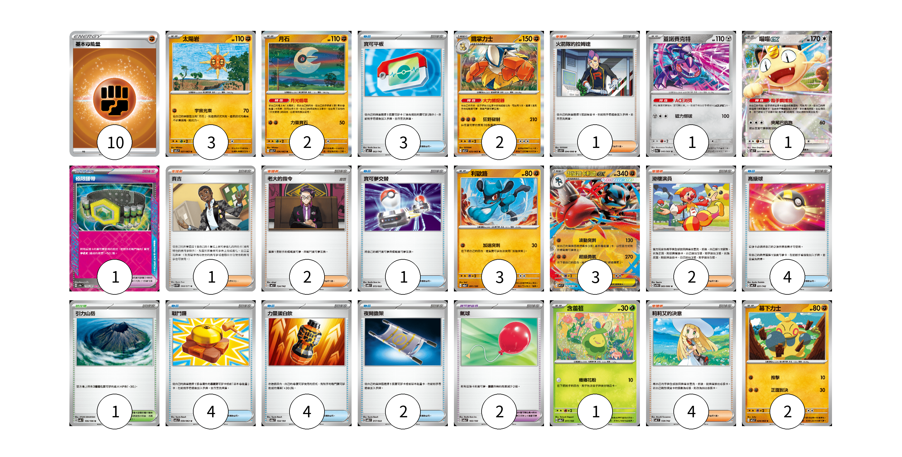 牌組構築方案 以此牌組為基礎新構築牌組 顯示卡面 顯示列表 寶可夢卡(18) 3 2 2 1 1 3 3 1 2 寶可夢道具(3) 1 2 物品卡(18) 3 1 4 4 4 2 支援者卡(10) 1 1 2 2 4 競技場卡(1) 1 能量卡(10) 10 寶可夢卡(18) 卡牌名稱 張數 卡牌名稱 張數 太陽岩 M1L 027/063 03 月石 M1L 026/063 02 鐵掌力士 M1L 025/063 02 蓋諾賽克特 SV6a 040/064 01 喵喵ex M3 061/080 01 利歐路 M2a 091/193 03 超級路卡利歐ex M1L 029/063 03 含羞苞 M2a 011/193 01 幕下力士 M1L 024/063 02 寶可夢道具(3) 卡牌名稱 張數 卡牌名稱 張數 極限腰帶 SV8a 159/187 01 氣球 M2a 165/193 02 物品卡(18) 卡牌名稱 張數 卡牌名稱 張數 寶可平板 MC 662/742 03 寶可夢交替 MBG 015/022 01 高級球 MC 651/742 04 戰鬥鑼 M1L 059/063 04 力量蛋白飲 M2a 154/193 04 夜間擔架 MBG 017/022 02 支援者卡(10) 卡牌名稱 張數 卡牌名稱 張數 火箭隊的拉姆達 SV10 094/098 01 賽吉 SV5M 068/071 01 老大的指令 MC 724/742 02 滑稽演員 SV11W 083/086 02 莉莉艾的決意 MC 729/742 04 競技場卡(1) 卡牌名稱 張數 卡牌名稱 張數 引力山岳 SV8 106/106 01 能量卡(10) 卡牌名稱 張數 卡牌名稱 張數 基本鬥能量 SLL FIG 10 以此牌組為基礎新構築牌組 牌組編碼 AiXVLx-dDjCig-DIjuKK copy 列印牌組單 牌組編碼已複製 分享至SNS