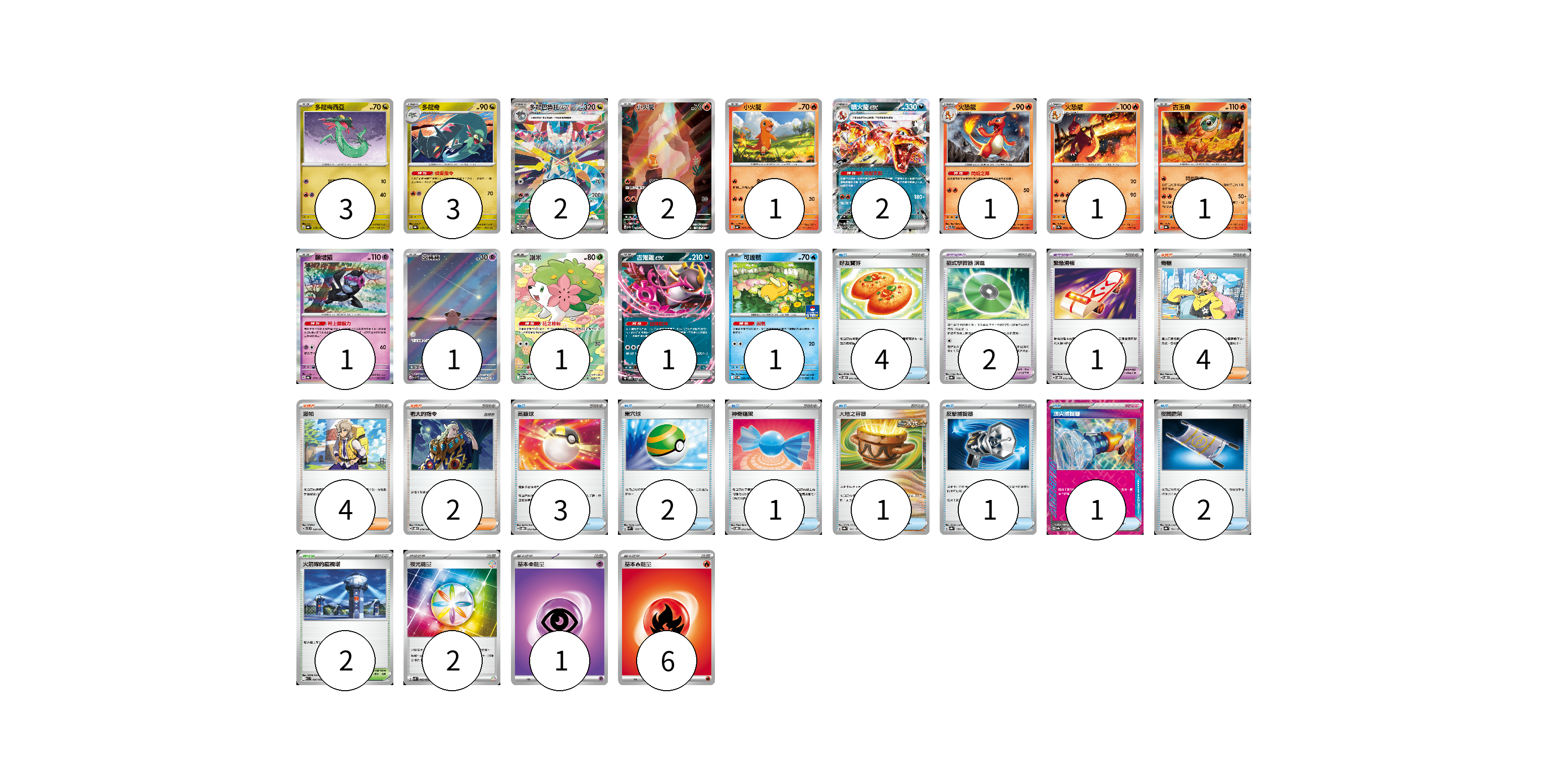 牌組構築方案 以此牌組為基礎新構築牌組 顯示卡面 顯示列表 寶可夢卡(21) 3 3 2 2 1 2 1 1 1 1 1 1 1 1 寶可夢道具(3) 2 1 物品卡(15) 4 3 2 1 1 1 1 2 支援者卡(10) 4 4 2 競技場卡(2) 2 能量卡(9) 2 1 6 寶可夢卡(21) 卡牌名稱 張數 卡牌名稱 張數 多龍梅西亞 SV8a 118/187 03 多龍奇 SV8a 119/187 03 多龍巴魯托ex SV8a 221/187 02 小火龍 SV2a 168/165 02 小火龍 SV4a 025/190 01 噴火龍ex SV3 066/108 02 火恐龍 SVTL 002/021 01 火恐龍 SV2a 005/165 01 古玉魚 SV8a 025/187 01 願增猿 SV8a 075/187 01 皮寶寶 SV3 113/108 01 謝米 SV9a 066/063 01 吉雉雞ex SVOD 004/020 01 可達鴨 SV-P 220/SV-P 01 寶可夢道具(3) 卡牌名稱 張數 卡牌名稱 張數 招式學習器 演進 SV8a 160/187 02 緊急滑板 SVOD 015/020 01 物品卡(15) 卡牌名稱 張數 卡牌名稱 張數 好友寶芬 SVOD 011/020 04 高級球 SVOD 012/020 03 巢穴球 SVM 133/175 02 神奇糖果 SVOD 013/020 01 大地之容器 SV8a 143/187 01 反擊捕捉器 SV8a 139/187 01 頂尖捕捉器 SV8a 148/187 01 夜間擔架 SV8a 151/187 02 支援者卡(10) 卡牌名稱 張數 卡牌名稱 張數 奇樹 SVOD 016/020 04 派帕 SVTL 020/021 04 老大的指令 SVOD 019/020 02 競技場卡(2) 卡牌名稱 張數 卡牌名稱 張數 火箭隊的監視塔 SV10 096/098 02 能量卡(9) 卡牌名稱 張數 卡牌名稱 張數 夜光能量 SVK 042/042 02 基本超能量 sv-p PSY 01 基本火能量 sv-p FIR 06 以此牌組為基礎新構築牌組 牌組編碼 AidwWb-XeWYYs-tSqxCj copy 列印牌組單 牌組編碼已複製 分享至SNS