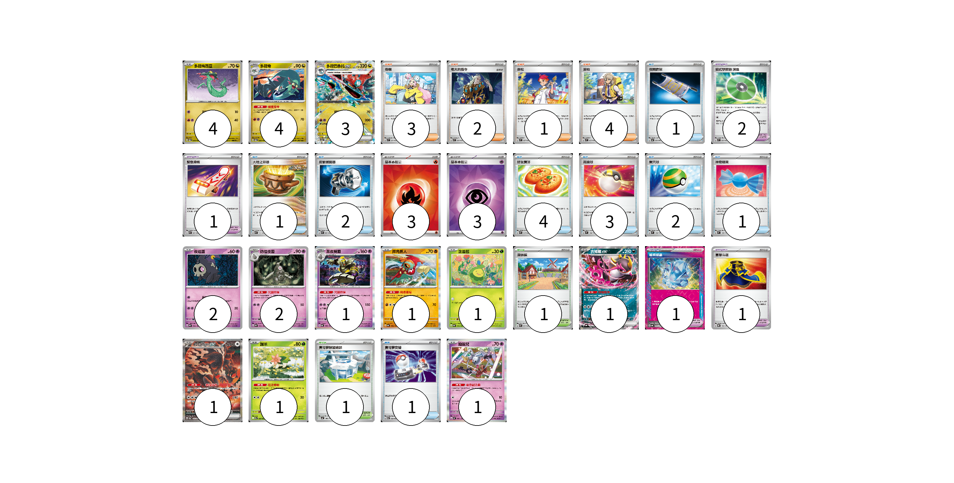 牌組構築方案 以此牌組為基礎新構築牌組 顯示卡面 顯示列表 寶可夢卡(22) 4 4 3 2 2 1 1 1 1 1 1 1 寶可夢道具(5) 2 1 1 1 物品卡(15) 1 1 2 4 3 2 1 1 支援者卡(10) 3 2 1 4 競技場卡(2) 1 1 能量卡(6) 3 3 寶可夢卡(22) 卡牌名稱 張數 卡牌名稱 張數 多龍梅西亞 SV6 079/101 04 多龍奇 SV6 080/101 04 多龍巴魯托ex SV6 081/101 03 夜巡靈 SV8a 064/187 02 彷徨夜靈 SV8a 065/187 02 黑夜魔靈 SV8a 066/187 01 摔角鷹人 SV8a 084/187 01 含羞苞 SV8a 001/187 01 吉雉雞ex SV8a 104/187 01 月月熊 赫月ex SV8a 225/187 01 謝米 SV9a 006/063 01 鑰圈兒 SV4a 087/190 01 寶可夢道具(5) 卡牌名稱 張數 卡牌名稱 張數 招式學習器 演進 SVK 025/042 02 緊急滑板 SVK 023/042 01 璀璨結晶 SV8a 152/187 01 豪華斗篷 SV8a 155/187 01 物品卡(15) 卡牌名稱 張數 卡牌名稱 張數 夜間擔架 SV6a 056/064 01 大地之容器 SVK 012/042 01 反擊捕捉器 SVK 009/042 02 好友寶芬 SVK 015/042 04 高級球 SVM 134/175 03 巢穴球 SVM 133/175 02 神奇糖果 SVM 135/175 01 寶可夢交替 SV9a 058/063 01 支援者卡(10) 卡牌名稱 張數 卡牌名稱 張數 奇樹 SVK 031/042 03 老大的指令 SVK 036/042 02 赤松 SVK 027/042 01 派帕 SVK 035/042 04 競技場卡(2) 卡牌名稱 張數 卡牌名稱 張數 深缽鎮 SVK 039/042 01 寶可夢聯盟總部 SV4a 186/190 01 能量卡(6) 卡牌名稱 張數 卡牌名稱 張數 基本【火】能量 SVK FIR 03 基本【超】能量 SVK PSY 03 以此牌組為基礎新構築牌組 牌組編碼 AigNEc-KprzDZ-NZhqia copy 列印牌組單 牌組編碼已複製 分享至SNS