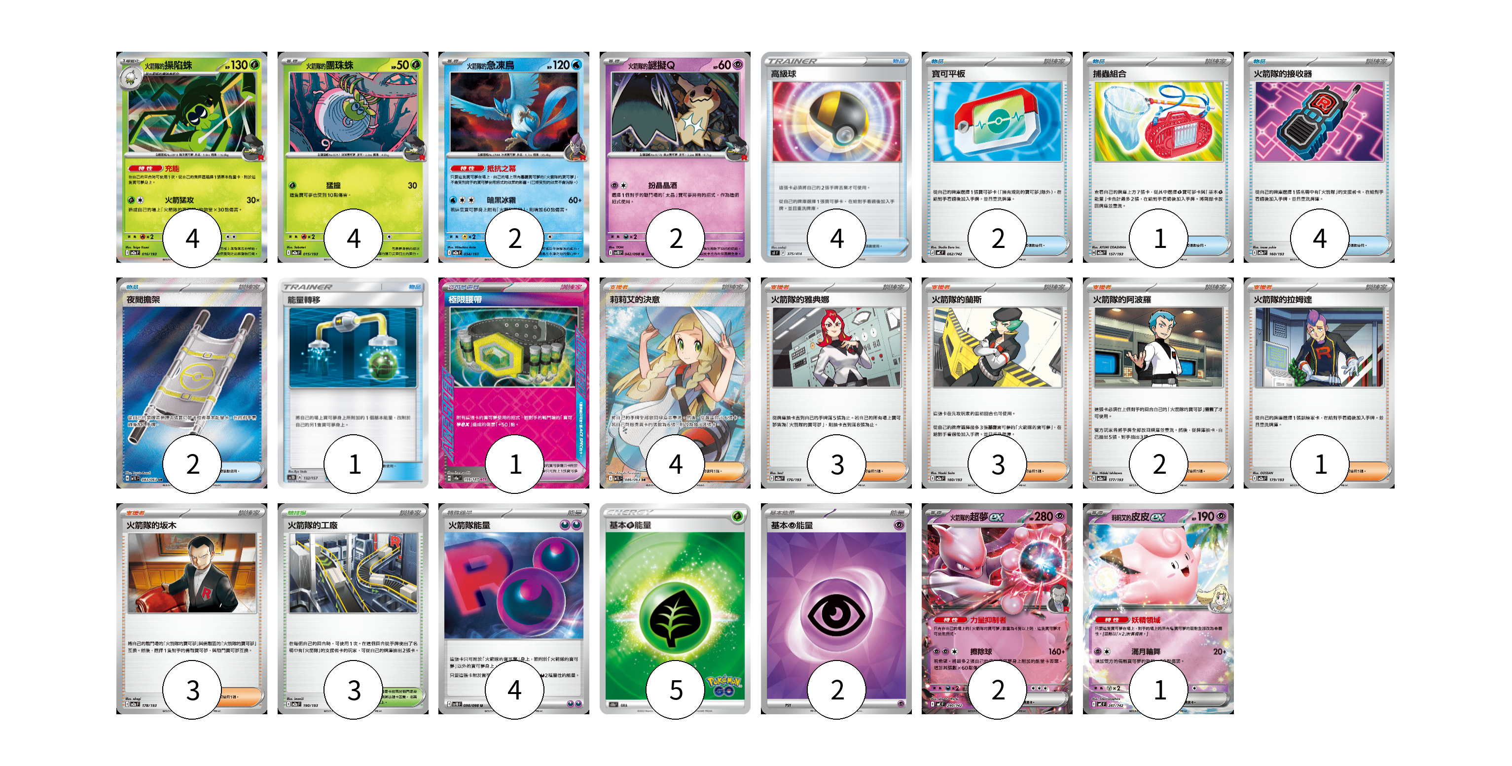 牌組構築方案 以此牌組為基礎新構築牌組 顯示卡面 顯示列表 寶可夢卡(15) 4 4 2 2 2 1 寶可夢道具(1) 1 物品卡(14) 4 2 1 4 2 1 支援者卡(16) 4 3 3 2 1 3 競技場卡(3) 3 能量卡(11) 4 5 2 寶可夢卡(15) 卡牌名稱 張數 卡牌名稱 張數 <火箭隊的>操陷蛛 M2a 016/193 04 <火箭隊的>團珠蛛 M2a 015/193 04 <火箭隊的>急凍鳥 M2a 034/193 02 <火箭隊的>謎擬Q SV10 042/098 02 <火箭隊的>超夢ex MC 290/742 02 莉莉艾的皮皮ex MC 287/742 01 寶可夢道具(1) 卡牌名稱 張數 卡牌名稱 張數 極限腰帶 SV8a 159/187 01 物品卡(14) 卡牌名稱 張數 卡牌名稱 張數 高級球 SI 375/414 04 寶可平板 MC 662/742 02 捕蟲組合 M2a 157/193 01 火箭隊的接收器 M2a 160/193 04 夜間擔架 M1L 083/063 02 能量轉移 AC1D 132/157 01 支援者卡(16) 卡牌名稱 張數 卡牌名稱 張數 莉莉艾的決意 M1L 086/063 04 火箭隊的雅典娜 M2a 176/193 03 火箭隊的蘭斯 M2a 180/193 03 火箭隊的阿波羅 M2a 177/193 02 火箭隊的拉姆達 M2a 179/193 01 火箭隊的坂木 M2a 178/193 03 競技場卡(3) 卡牌名稱 張數 卡牌名稱 張數 火箭隊的工廠 M2a 190/193 03 能量卡(11) 卡牌名稱 張數 卡牌名稱 張數 火箭隊能量 SV10 098/098 04 基本草能量 S10b GRA 05 基本【超】能量 SVOD PSY 02 以此牌組為基礎新構築牌組 牌組編碼 AilWvy-meFyya-JPrMVS copy 列印牌組單 牌組編碼已複製 分享至SNS