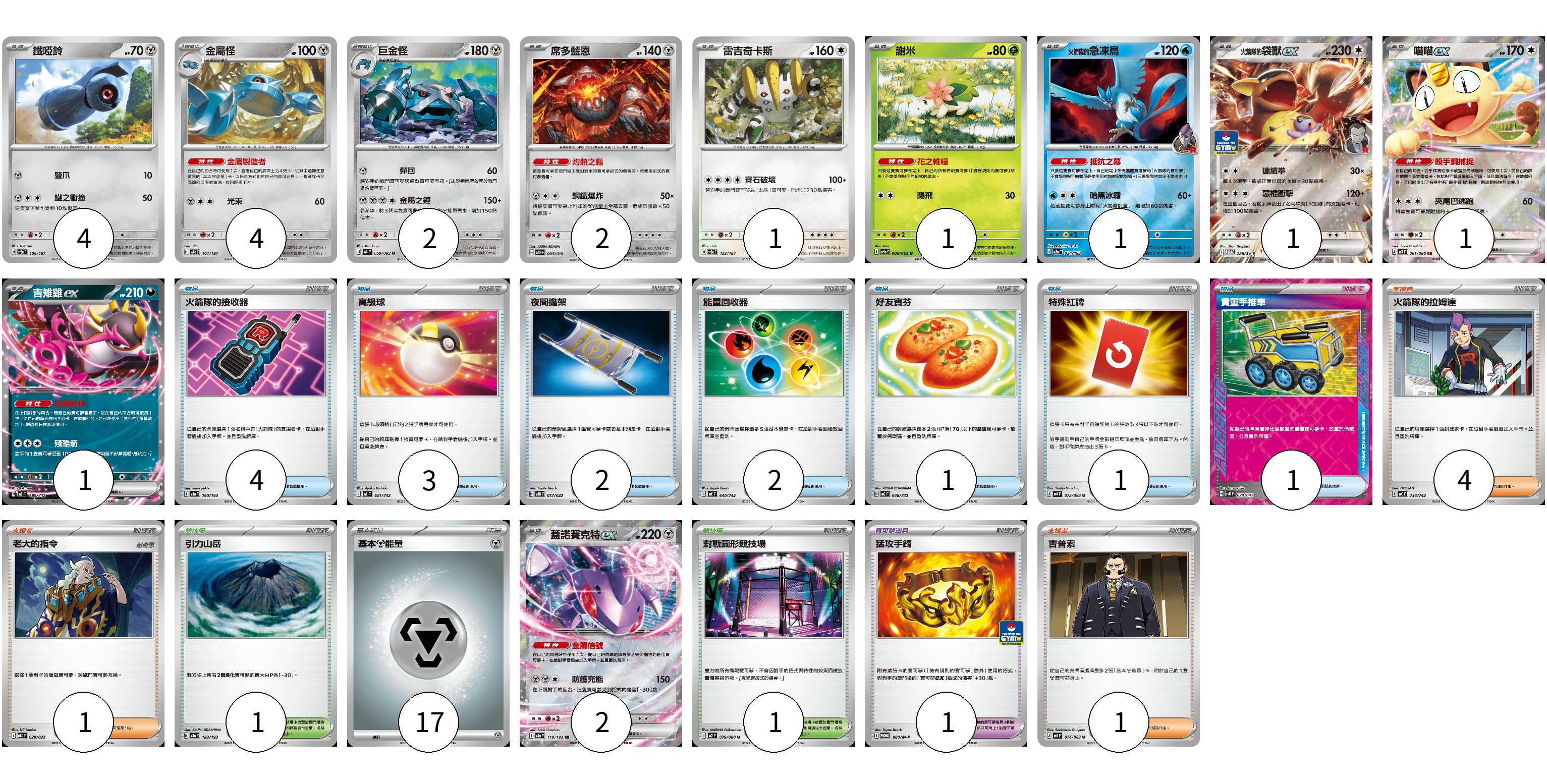 牌組構築方案 以此牌組為基礎新構築牌組 顯示卡面 顯示列表 寶可夢卡(20) 4 4 2 2 1 1 1 1 1 1 2 寶可夢道具(1) 1 物品卡(14) 4 3 2 2 1 1 1 支援者卡(6) 4 1 1 競技場卡(2) 1 1 能量卡(17) 17 寶可夢卡(20) 卡牌名稱 張數 卡牌名稱 張數 鐵啞鈴 SV8a 106/187 04 金屬怪 SV8a 107/187 04 巨金怪 M4 059/083 02 席多藍恩 SVTH 005/018 02 雷吉奇卡斯 SV8a 132/187 01 謝米 SV9a 006/063 01 <火箭隊的>急凍鳥 M2a 034/193 01 <火箭隊的>袋獸ex SV-P 226/SV-P 01 喵喵ex M3 061/080 01 吉雉雞ex MC 489/742 01 蓋諾賽克特ex M2a 119/193 02 寶可夢道具(1) 卡牌名稱 張數 卡牌名稱 張數 猛攻手鐲 M-P 080/M-P 01 物品卡(14) 卡牌名稱 張數 卡牌名稱 張數 火箭隊的接收器 M2a 160/193 04 高級球 MC 651/742 03 夜間擔架 MBG 017/022 02 能量回收器 MC 640/742 02 好友寶芬 MC 648/742 01 特殊紅牌 M4 072/083 01 貴重手推車 SVK 020/042 01 支援者卡(6) 卡牌名稱 張數 卡牌名稱 張數 火箭隊的拉姆達 MC 734/742 04 老大的指令 MBD 020/022 01 吉普索 M4 076/083 01 競技場卡(2) 卡牌名稱 張數 卡牌名稱 張數 引力山岳 M2a 183/193 01 對戰圓形競技場 M2 079/080 01 能量卡(17) 卡牌名稱 張數 卡牌名稱 張數 基本【鋼】能量 M-P MET 17 以此牌組為基礎新構築牌組 牌組編碼 AmtPtU-BgtAik-kVufBf copy 列印牌組單 牌組編碼已複製 分享至SNS