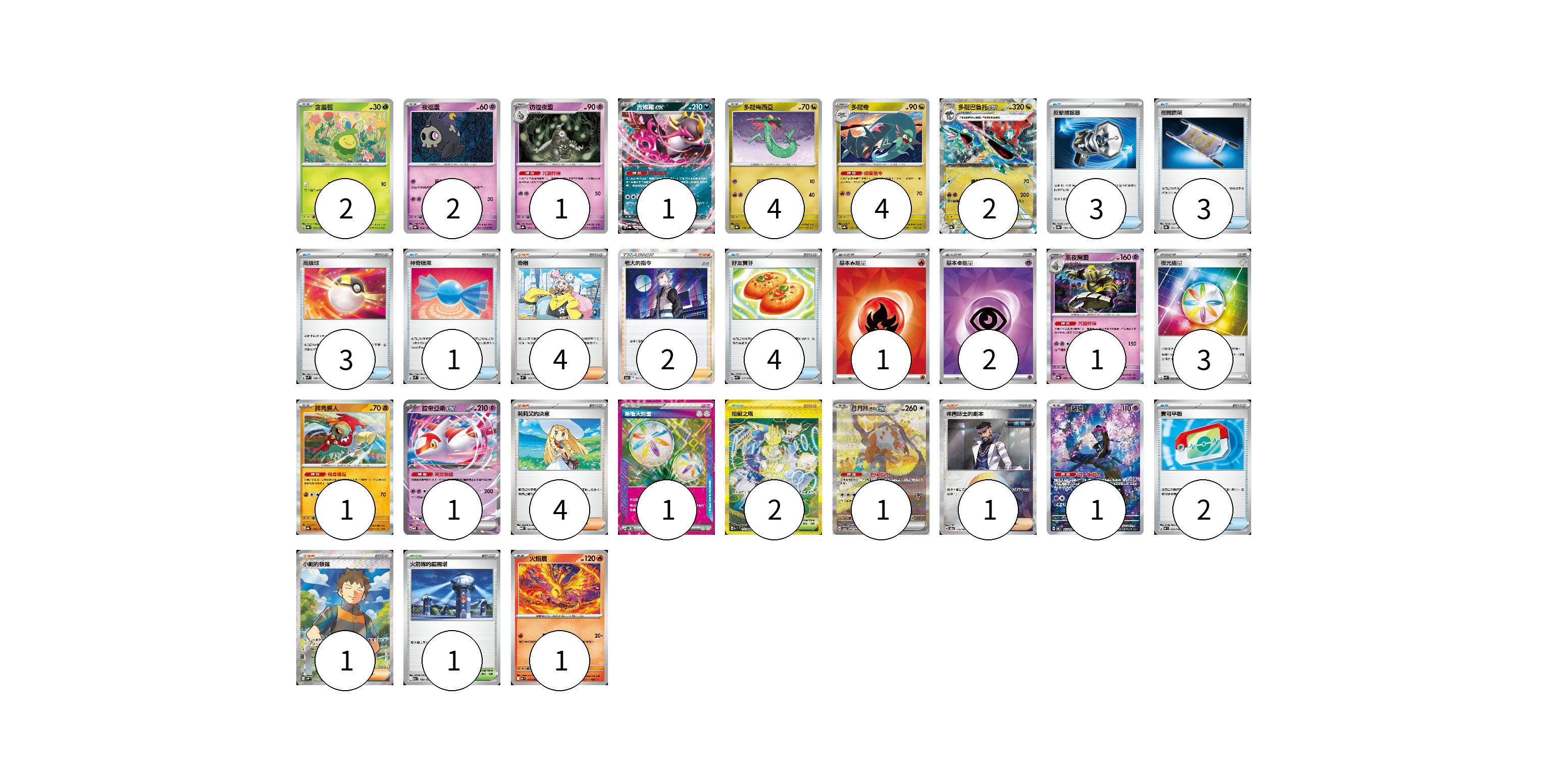牌組構築方案 以此牌組為基礎新構築牌組 顯示卡面 顯示列表 寶可夢卡(22) 2 2 1 1 4 4 2 1 1 1 1 1 1 物品卡(16) 3 3 3 1 4 2 支援者卡(12) 4 2 4 1 1 競技場卡(3) 2 1 能量卡(7) 1 2 3 1 寶可夢卡(22) 卡牌名稱 張數 卡牌名稱 張數 含羞苞 SV8a 001/187 02 夜巡靈 SV8a 064/187 02 彷徨夜靈 SV8a 065/187 01 吉雉雞ex SV8a 104/187 01 多龍梅西亞 SV8a 118/187 04 多龍奇 SV8a 119/187 04 多龍巴魯托ex SV8a 120/187 02 黑夜魔靈 SV8a 066/187 01 摔角鷹人 SV8a 084/187 01 拉帝亞斯ex MBD 003/022 01 月月熊 赫月 ex SV5a 091/066 01 願增猿 SV6 107/101 01 火焰鳥 M2 014/080 01 物品卡(16) 卡牌名稱 張數 卡牌名稱 張數 反擊捕捉器 SV8a 139/187 03 夜間擔架 SV8a 151/187 03 高級球 SVM 134/175 03 神奇糖果 SVM 135/175 01 好友寶芬 SVK 015/042 04 寶可平板 MC 662/742 02 支援者卡(12) 卡牌名稱 張數 卡牌名稱 張數 奇樹 SVM 160/175 04 老大的指令(赤日) S12a 161/172 02 莉莉艾的決意 MBD 021/022 04 弗圖博士的劇本 SV8a 175/187 01 小剛的發掘 SV9 123/100 01 競技場卡(3) 卡牌名稱 張數 卡牌名稱 張數 阻礙之塔 SV10 132/098 02 火箭隊的監視塔 M2a 189/193 01 能量卡(7) 卡牌名稱 張數 卡牌名稱 張數 基本【火】能量 SVK FIR 01 基本【超】能量 SVK PSY 02 夜光能量 SVK 042/042 03 新衝天能量 SV5K 071/071 01 以此牌組為基礎新構築牌組 牌組編碼 ApCvGR-lSGblZ-qKdhlf copy 列印牌組單 牌組編碼已複製 分享至SNS