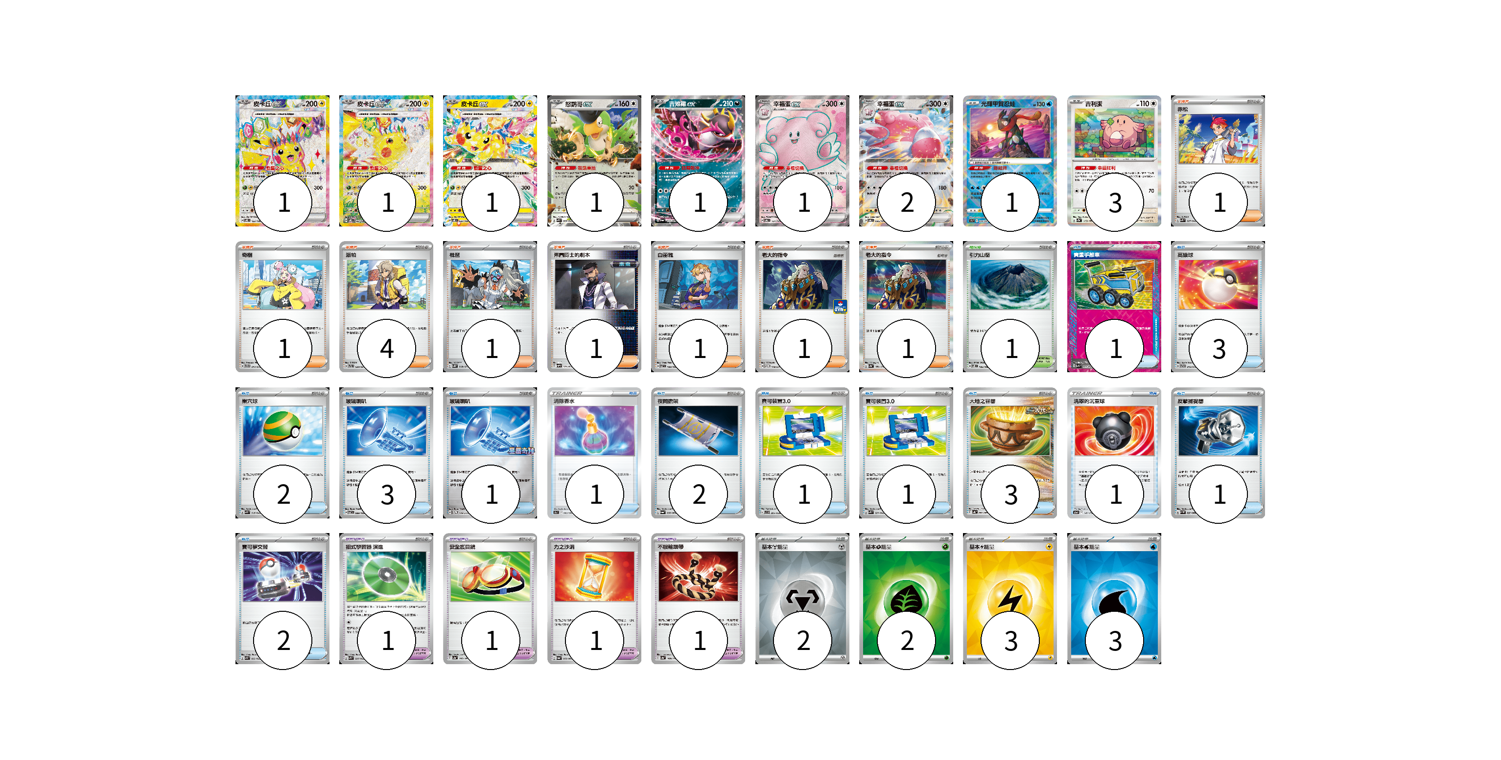 牌組構築方案 以此牌組為基礎新構築牌組 顯示卡面 顯示列表 寶可夢卡(12) 1 1 1 1 1 1 2 1 3 寶可夢道具(4) 1 1 1 1 物品卡(22) 1 3 2 3 1 1 2 1 1 3 1 1 2 支援者卡(11) 1 1 4 1 1 1 1 1 競技場卡(1) 1 能量卡(10) 2 2 3 3 寶可夢卡(12) 卡牌名稱 張數 卡牌名稱 張數 皮卡丘ex SV8 122/106 01 皮卡丘ex SV8 132/106 01 皮卡丘ex SV8 033/106 01 怒鸚哥ex SVK 006/042 01 吉雉雞ex SV6a 038/064 01 幸福蛋ex SV6 121/101 01 幸福蛋ex SV6 085/101 02 光輝甲賀忍蛙 S9a 026/067 01 吉利蛋 SV2a 113/165 03 寶可夢道具(4) 卡牌名稱 張數 卡牌名稱 張數 招式學習器 演進 SVK 025/042 01 安全護目鏡 SV2a 157/165 01 力之沙漏 SV6a 058/064 01 不服輸頭帶 SV4a 168/190 01 物品卡(22) 卡牌名稱 張數 卡牌名稱 張數 貴重手推車 SVK 020/042 01 高級球 SVTG 013/019 03 巢穴球 SVK 016/042 02 玻璃喇叭 SV7 089/102 03 玻璃喇叭 SV-P 149/SV-P 01 消除香水 S9a 063/067 01 夜間擔架 SV6a 056/064 02 寶可裝置3.0 SVB 004/028 01 寶可裝置3.0 SVK 021/042 01 大地之容器 SV4K 060/066 03 洗翠的沉重球 S12a 140/172 01 反擊捕捉器 SV4M 059/066 01 寶可夢交替 SVK 022/042 02 支援者卡(11) 卡牌名稱 張數 卡牌名稱 張數 赤松 SVK 027/042 01 奇樹 SVTG 017/019 01 派帕 SVTL 020/021 04 枇琶 SV5K 068/071 01 弗圖博士的劇本 SVHM 021/022 01 白蕾雅 SV7 100/102 01 老大的指令 SV-P 178/SV-P 01 老大的指令 SV4a 181/190 01 競技場卡(1) 卡牌名稱 張數 卡牌名稱 張數 引力山岳 SV8 106/106 01 能量卡(10) 卡牌名稱 張數 卡牌名稱 張數 基本【鋼】能量 SVK MET 02 基本【草】能量 SVK GRA 02 基本【雷】能量 SVK LIG 03 基本【水】能量 SVK WAT 03 以此牌組為基礎新構築牌組 牌組編碼 AqGNNd-ZPwvgn-XLAAnv copy 列印牌組單 牌組編碼已複製 分享至SNS