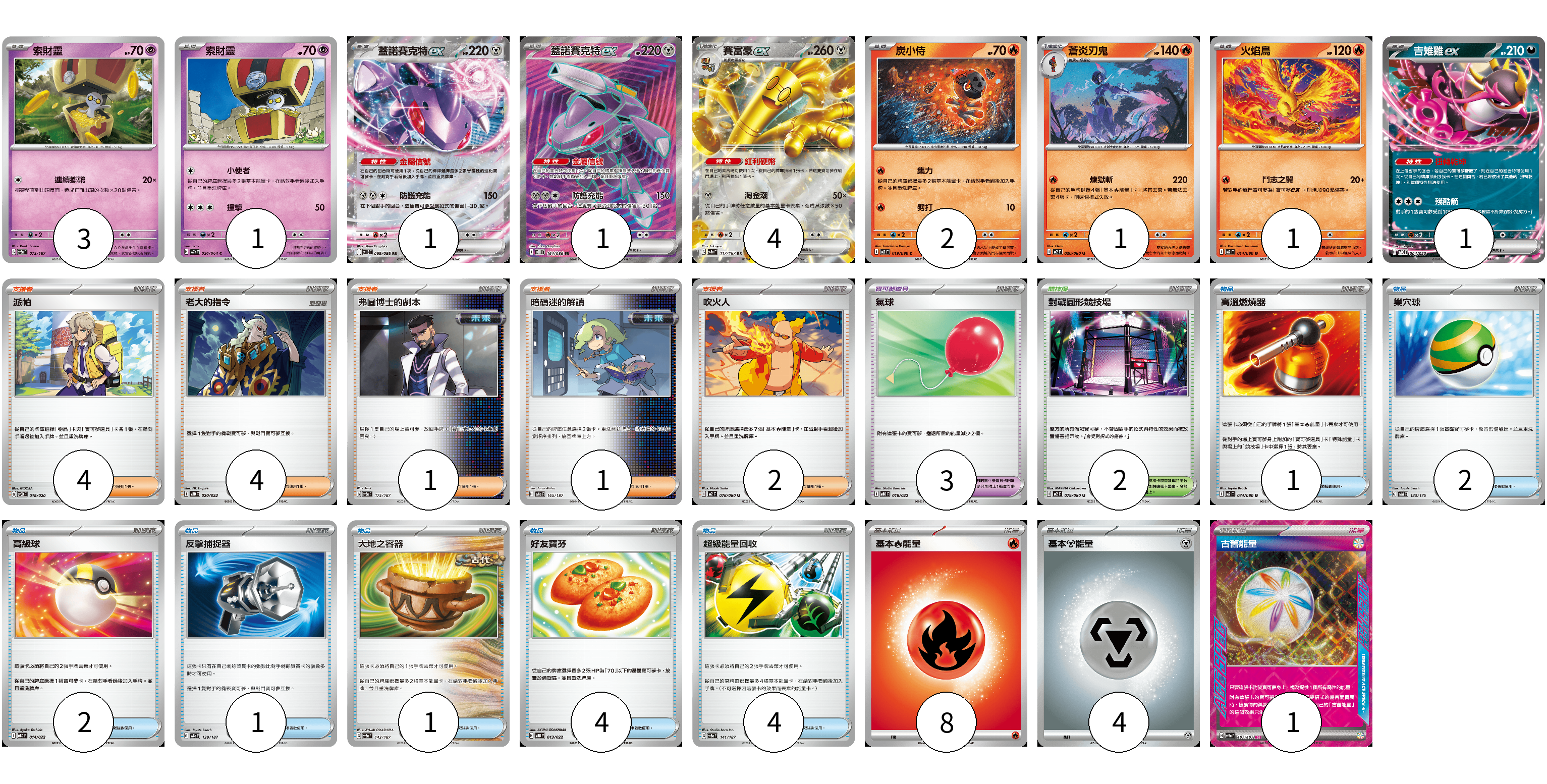 牌組構築方案 以此牌組為基礎新構築牌組 顯示卡面 顯示列表 寶可夢卡(15) 3 1 1 1 4 2 1 1 1 寶可夢道具(3) 3 物品卡(15) 1 2 2 1 1 4 4 支援者卡(12) 4 4 1 1 2 競技場卡(2) 2 能量卡(13) 8 4 1 寶可夢卡(15) 卡牌名稱 張數 卡牌名稱 張數 索財靈 SV8a 073/187 03 索財靈 SV7a 024/064 01 蓋諾賽克特ex SV11B 069/086 01 蓋諾賽克特ex SV11B 164/086 01 賽富豪ex SV8a 117/187 04 炭小侍 M2 019/080 02 蒼炎刃鬼 M2 020/080 01 火焰鳥 M2 014/080 01 吉雉雞ex SVOD 004/020 01 寶可夢道具(3) 卡牌名稱 張數 卡牌名稱 張數 氣球 MBD 018/022 03 物品卡(15) 卡牌名稱 張數 卡牌名稱 張數 高溫燃燒器 M2 074/080 01 巢穴球 SVM 133/175 02 高級球 MBD 014/022 02 反擊捕捉器 SV8a 139/187 01 大地之容器 SV8a 143/187 01 好友寶芬 MBD 013/022 04 超級能量回收 SV8a 141/187 04 支援者卡(12) 卡牌名稱 張數 卡牌名稱 張數 派帕 SVOD 018/020 04 老大的指令 MBD 020/022 04 弗圖博士的劇本 SV8a 175/187 01 暗碼迷的解讀 SV8a 165/187 01 吹火人 M2 078/080 02 競技場卡(2) 卡牌名稱 張數 卡牌名稱 張數 對戰圓形競技場 M2 079/080 02 能量卡(13) 卡牌名稱 張數 卡牌名稱 張數 基本【火】能量 M-P FIR 08 基本【鋼】能量 M-P MET 04 古舊能量 SV8a 187/187 01 以此牌組為基礎新構築牌組 牌組編碼 AqPfdO-bsFjoj-mUTTMd copy 列印牌組單 牌組編碼已複製 分享至SNS