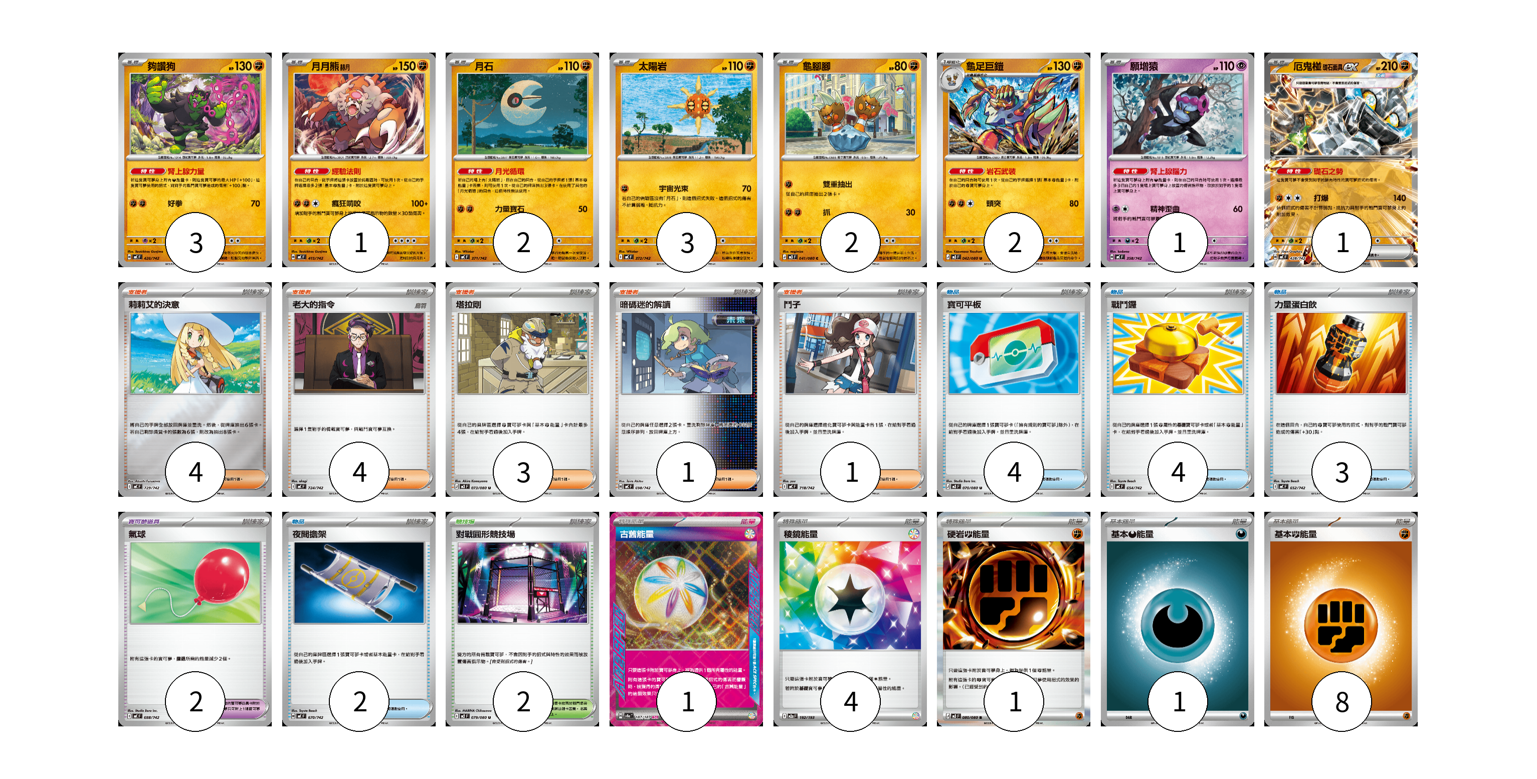 牌組構築方案 以此牌組為基礎新構築牌組 顯示卡面 顯示列表 寶可夢卡(15) 3 1 2 3 2 2 1 1 寶可夢道具(2) 2 物品卡(13) 4 4 3 2 支援者卡(13) 4 4 3 1 1 競技場卡(2) 2 能量卡(15) 1 4 1 1 8 寶可夢卡(15) 卡牌名稱 張數 卡牌名稱 張數 夠讚狗 MC 426/742 03 月月熊 赫月 MC 415/742 01 月石 MC 371/742 02 太陽岩 MC 372/742 03 龜腳腳 M3 041/080 02 龜足巨鎧 M3 042/080 02 願增猿 MC 358/742 01 厄鬼椪 礎石面具ex MC 428/742 01 寶可夢道具(2) 卡牌名稱 張數 卡牌名稱 張數 氣球 MC 688/742 02 物品卡(13) 卡牌名稱 張數 卡牌名稱 張數 寶可平板 M3 070/080 04 戰鬥鑼 MC 654/742 04 力量蛋白飲 MC 652/742 03 夜間擔架 MC 670/742 02 支援者卡(13) 卡牌名稱 張數 卡牌名稱 張數 莉莉艾的決意 MC 729/742 04 老大的指令 MC 724/742 04 塔拉剛 M3 073/080 03 暗碼迷的解讀 MC 698/742 01 鬥子 MC 718/742 01 競技場卡(2) 卡牌名稱 張數 卡牌名稱 張數 對戰圓形競技場 M2 079/080 02 能量卡(15) 卡牌名稱 張數 卡牌名稱 張數 古舊能量 SV8a 187/187 01 稜鏡能量 M2a 192/193 04 硬岩【鬥】能量 M3 080/080 01 基本【惡】能量 MC DAR 01 基本【鬥】能量 MC FIG 08 以此牌組為基礎新構築牌組 牌組編碼 AtBLTv-WTxiRk-UMKASj copy 列印牌組單 牌組編碼已複製 分享至SNS