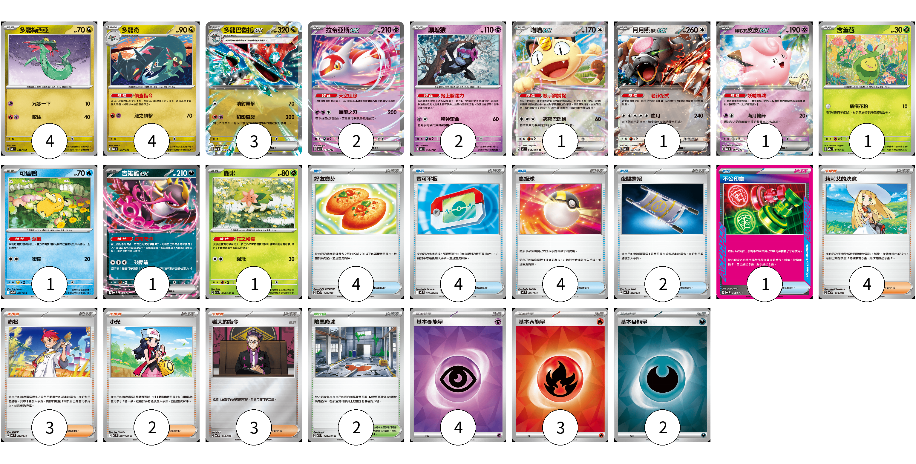 牌組構築方案 以此牌組為基礎新構築牌組 顯示卡面 顯示列表 寶可夢卡(22) 4 4 3 2 2 1 1 1 1 1 1 1 物品卡(15) 4 4 4 2 1 支援者卡(12) 4 3 2 3 競技場卡(2) 2 能量卡(9) 4 3 2 寶可夢卡(22) 卡牌名稱 張數 卡牌名稱 張數 多龍梅西亞 MC 546/742 04 多龍奇 MC 547/742 04 多龍巴魯托ex MC 548/742 03 拉帝亞斯ex MC 312/742 02 願增猿 MC 358/742 02 喵喵ex M3 061/080 01 月月熊 赫月 ex MC 625/742 01 莉莉艾的皮皮ex MC 287/742 01 含羞苞 M2a 011/193 01 可達鴨 M2a 032/193 01 吉雉雞ex MC 489/742 01 謝米 SV9a 006/063 01 物品卡(15) 卡牌名稱 張數 卡牌名稱 張數 好友寶芬 MC 648/742 04 寶可平板 M3 070/080 04 高級球 MC 651/742 04 夜間擔架 MC 670/742 02 不公印章 MC 633/742 01 支援者卡(12) 卡牌名稱 張數 卡牌名稱 張數 莉莉艾的決意 MC 729/742 04 赤松 MC 696/742 03 小光 M2 077/080 02 老大的指令 MC 724/742 03 競技場卡(2) 卡牌名稱 張數 卡牌名稱 張數 險惡廢墟 M1L 063/063 02 能量卡(9) 卡牌名稱 張數 卡牌名稱 張數 基本【超】能量 SVOD PSY 04 基本【火】能量 SVM FIR 03 基本【惡】能量 SVM DAR 02 以此牌組為基礎新構築牌組 牌組編碼 AuVbzm-DKtANo-Jcqasx copy 列印牌組單 牌組編碼已複製 分享至SNS