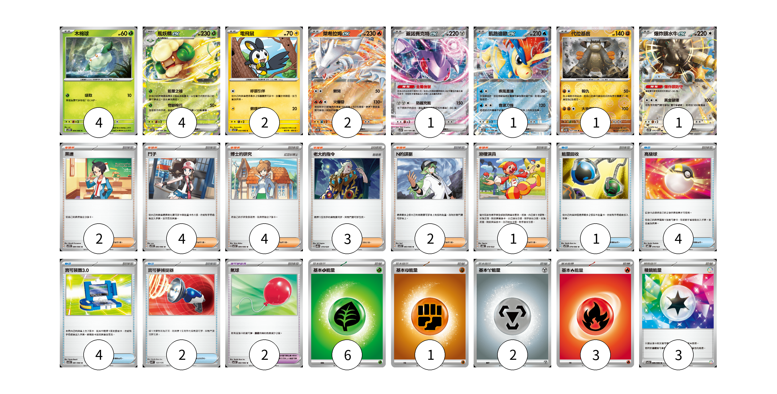 牌組構築方案 以此牌組為基礎新構築牌組 顯示卡面 顯示列表 寶可夢卡(16) 4 4 2 2 1 1 1 1 寶可夢道具(2) 2 物品卡(11) 1 4 4 2 支援者卡(16) 2 4 4 3 2 1 能量卡(15) 6 1 2 3 3 寶可夢卡(16) 卡牌名稱 張數 卡牌名稱 張數 木棉球 SV11W 004/086 04 風妖精ex SV11W 005/086 04 電飛鼠 SV11B 032/086 02 萊希拉姆ex SV11W 017/086 02 蓋諾賽克特ex SV11B 069/086 01 凱路迪歐ex SV11W 027/086 01 代拉基翁 SV11W 051/086 01 爆炸頭水牛ex SV11W 075/086 01 寶可夢道具(2) 卡牌名稱 張數 卡牌名稱 張數 氣球 SV11B 082/086 02 物品卡(11) 卡牌名稱 張數 卡牌名稱 張數 能量回收 SV11W 079/086 01 高級球 MBD 014/022 04 寶可裝置3.0 SV11B 081/086 04 寶可夢捕捉器 SVM 137/175 02 支援者卡(16) 卡牌名稱 張數 卡牌名稱 張數 黑連 SV11W 084/086 02 鬥子 SV11W 085/086 04 博士的研究 SV11B 084/086 04 老大的指令 SVOD 019/020 03 N的謀劃 SV11B 083/086 02 滑稽演員 SVQL 019/022 01 能量卡(15) 卡牌名稱 張數 卡牌名稱 張數 基本【草】能量 M-P GRA 06 基本【鬥】能量 M-P FIG 01 基本【鋼】能量 M-P MET 02 基本【火】能量 SVTL FIR 03 稜鏡能量 SV11B 086/086 03 以此牌組為基礎新構築牌組 牌組編碼 AvNtUU-dWvtkR-MaJhvT copy 列印牌組單 牌組編碼已複製 分享至SNS