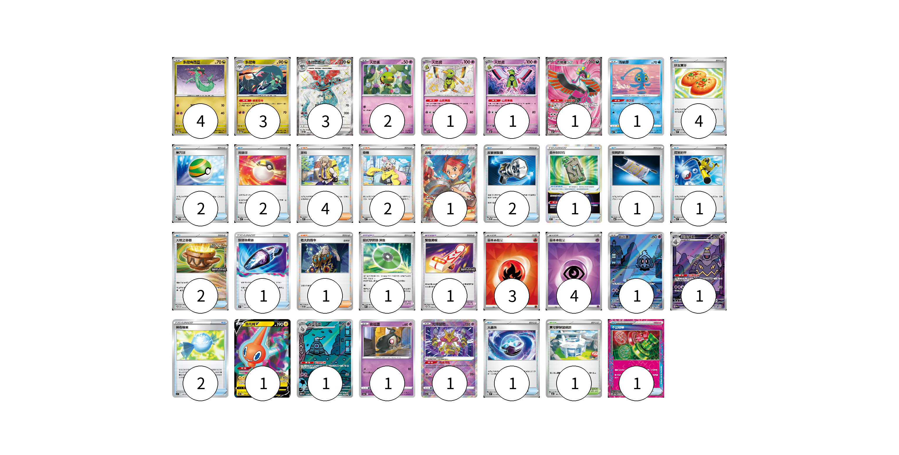 牌組構築方案 以此牌組為基礎新構築牌組 顯示卡面 顯示列表 寶可夢卡(22) 4 3 3 2 1 1 1 1 1 1 1 1 1 1 寶可夢道具(3) 1 1 1 物品卡(19) 4 2 2 2 1 1 2 1 2 1 1 支援者卡(8) 4 2 1 1 競技場卡(1) 1 能量卡(7) 3 4 寶可夢卡(22) 卡牌名稱 張數 卡牌名稱 張數 多龍梅西亞 SV6 079/101 04 多龍奇 SV6 080/101 03 多龍巴魯托ex SV6 120/101 03 天然雀 SV4a 078/190 02 天然鳥 SV4a 257/190 01 天然鳥 SV4a 079/190 01 吉雉雞ex SV6a 081/064 01 瑪納霏 SVF 003/038 01 夜巡靈 SV6a 068/064 01 黑夜魔靈 SV6a 070/064 01 洛托姆V S11 037/100 01 彷徨夜靈 SV6a 069/064 01 夜巡靈 S12a 057/172 01 光輝胡地 S11a 031/068 01 寶可夢道具(3) 卡牌名稱 張數 卡牌名稱 張數 森林封印石 S12 092/098 01 招式學習器 演進 SVK 025/042 01 緊急滑板 SV-P 140/SV-P 01 物品卡(19) 卡牌名稱 張數 卡牌名稱 張數 好友寶芬 SVK 015/042 04 巢穴球 SVK 016/042 02 高級球 SVK 018/042 02 反擊捕捉器 SVTS 009/022 02 夜間擔架 SV6a 056/064 01 厲害釣竿 SVK 011/042 01 大地之容器 SV-P 137/SV-P 02 放逐吸塵器 SVF 023/038 01 神奇糖果 SI 376/414 02 太晶珠 SVK 013/042 01 不公印章 SV5a 053/066 01 支援者卡(8) 卡牌名稱 張數 卡牌名稱 張數 派帕 SVK 035/042 04 奇樹 SVK 031/042 02 赤松 SV7 123/102 01 老大的指令 SVTS 020/022 01 競技場卡(1) 卡牌名稱 張數 卡牌名稱 張數 寶可夢聯盟總部 SV4a 186/190 01 能量卡(7) 卡牌名稱 張數 卡牌名稱 張數 基本【火】能量 SVK FIR 03 基本【超】能量 SVK PSY 04 以此牌組為基礎新構築牌組 牌組編碼 AvcJTH-MqNDYw-fVHMEZ copy 列印牌組單 牌組編碼已複製 分享至SNS