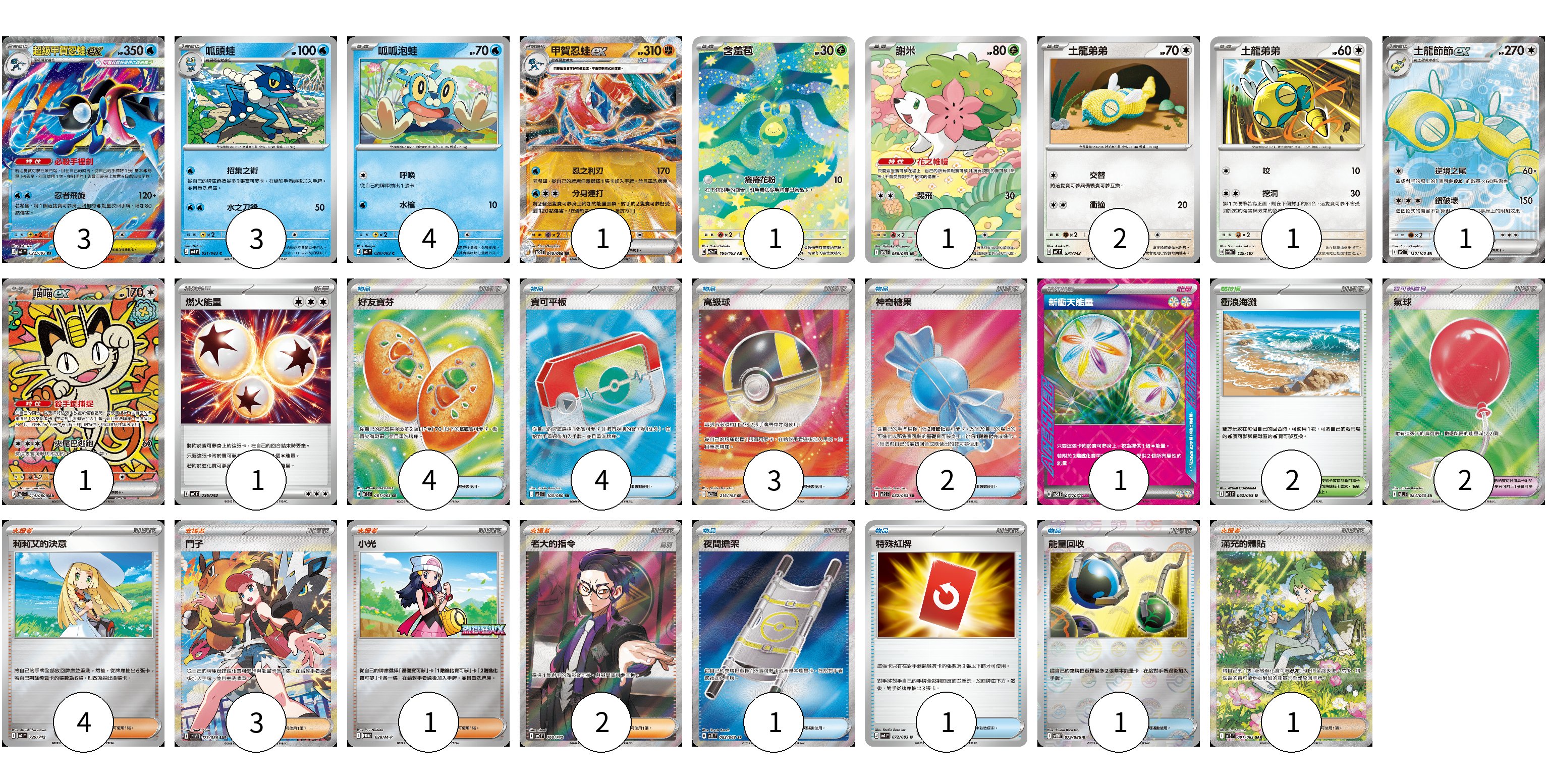 牌組構築方案 以此牌組為基礎新構築牌組 顯示卡面 顯示列表 寶可夢卡(18) 3 3 4 1 1 1 2 1 1 1 寶可夢道具(2) 2 物品卡(16) 4 4 3 2 1 1 1 支援者卡(11) 4 3 1 2 1 競技場卡(2) 2 能量卡(2) 1 1 寶可夢卡(18) 卡牌名稱 張數 卡牌名稱 張數 超級甲賀忍蛙ex M4 022/083 03 呱頭蛙 M4 021/083 03 呱呱泡蛙 M4 020/083 04 甲賀忍蛙ex SV5a 045/066 01 含羞苞 M2a 196/193 01 謝米 SV9a 066/063 01 土龍弟弟 MC 574/742 02 土龍弟弟 SV8a 129/187 01 土龍節節ex SV9 120/100 01 喵喵ex M3 114/080 01 寶可夢道具(2) 卡牌名稱 張數 卡牌名稱 張數 氣球 M1L 084/063 02 物品卡(16) 卡牌名稱 張數 卡牌名稱 張數 好友寶芬 M1S 081/063 04 寶可平板 M3 103/080 04 高級球 M2a 216/193 03 神奇糖果 M1S 082/063 02 夜間擔架 M1L 083/063 01 特殊紅牌 M4 072/083 01 能量回收 SV11W 079/086 01 支援者卡(11) 卡牌名稱 張數 卡牌名稱 張數 莉莉艾的決意 MC 729/742 04 鬥子 SV11W 173/086 03 小光 M-P 028/M-P 01 老大的指令(烏羽) MC 760/742 02 滿充的體貼 M1S 091/063 01 競技場卡(2) 卡牌名稱 張數 卡牌名稱 張數 衝浪海灘 M1S 062/063 02 能量卡(2) 卡牌名稱 張數 卡牌名稱 張數 燃火能量 MC 736/742 01 新衝天能量 SV5K 071/071 01 以此牌組為基礎新構築牌組 牌組編碼 AwaAkq-GyPCYm-XrUmiN copy 列印牌組單 牌組編碼已複製 分享至SNS