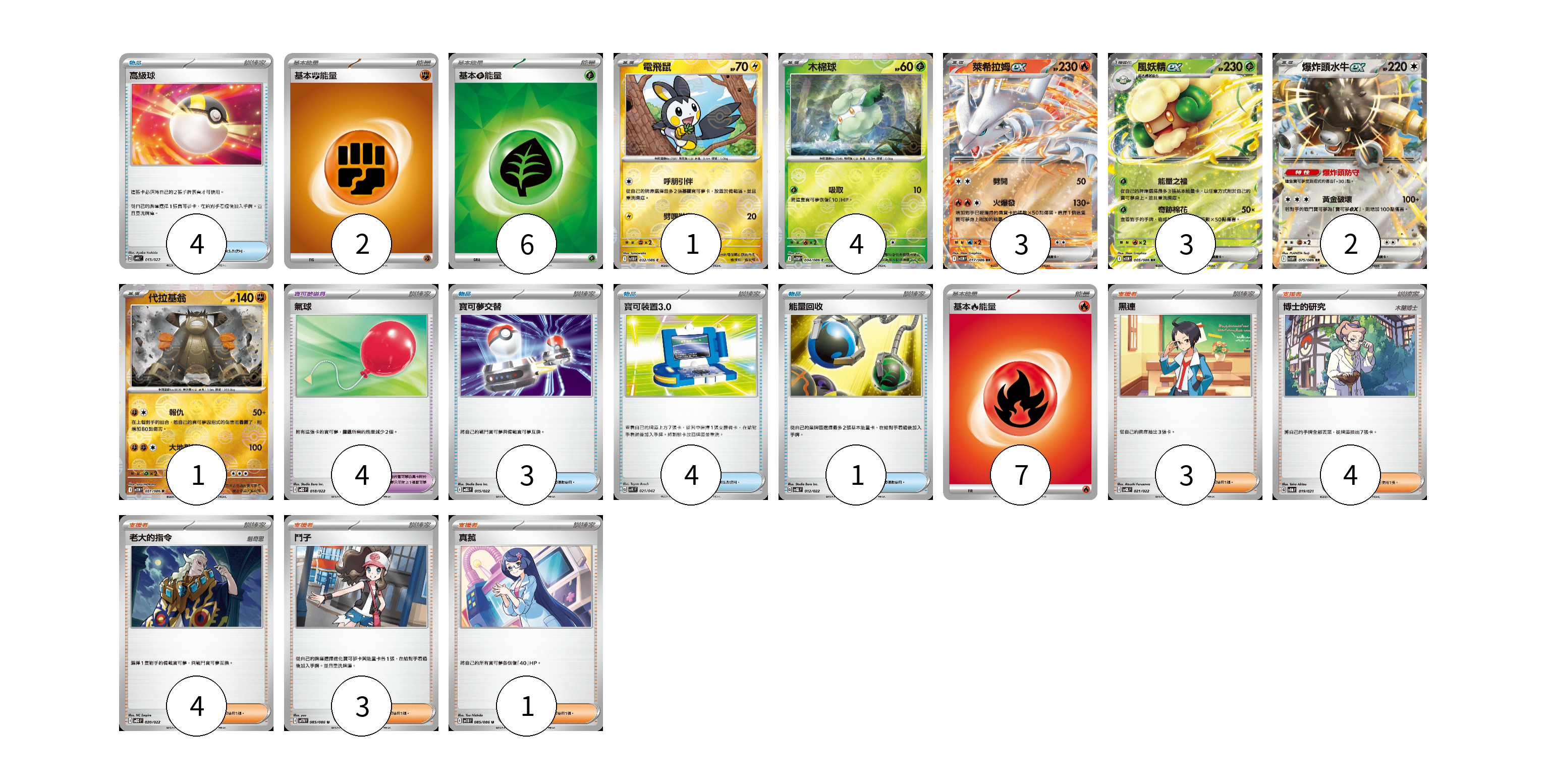 牌組構築方案 以此牌組為基礎新構築牌組 顯示卡面 顯示列表 寶可夢卡(14) 1 4 3 3 2 1 寶可夢道具(4) 4 物品卡(12) 4 3 4 1 支援者卡(15) 3 4 4 3 1 能量卡(15) 2 6 7 寶可夢卡(14) 卡牌名稱 張數 卡牌名稱 張數 電飛鼠 SV11B 032/086 01 木棉球 SV11W 004/086 04 萊希拉姆ex SV11W 017/086 03 風妖精ex SV11W 005/086 03 爆炸頭水牛ex SV11W 075/086 02 代拉基翁 SV11W 051/086 01 寶可夢道具(4) 卡牌名稱 張數 卡牌名稱 張數 氣球 MBD 018/022 04 物品卡(12) 卡牌名稱 張數 卡牌名稱 張數 高級球 SVHK 013/022 04 寶可夢交替 MBG 015/022 03 寶可裝置3.0 SVK 021/042 04 能量回收 SVQL 012/022 01 支援者卡(15) 卡牌名稱 張數 卡牌名稱 張數 黑連 SVQL 021/022 03 博士的研究 SVOM 019/021 04 老大的指令 MBD 020/022 04 鬥子 SV11W 085/086 03 真菰 SV11B 085/086 01 能量卡(15) 卡牌名稱 張數 卡牌名稱 張數 基本【鬥】能量 SVHK FIG 02 基本【草】能量 SVK GRA 06 基本火能量 sv-p FIR 07 以此牌組為基礎新構築牌組 牌組編碼 AyPbpo-nnfFmy-ahJNvH copy 列印牌組單 牌組編碼已複製 分享至SNS