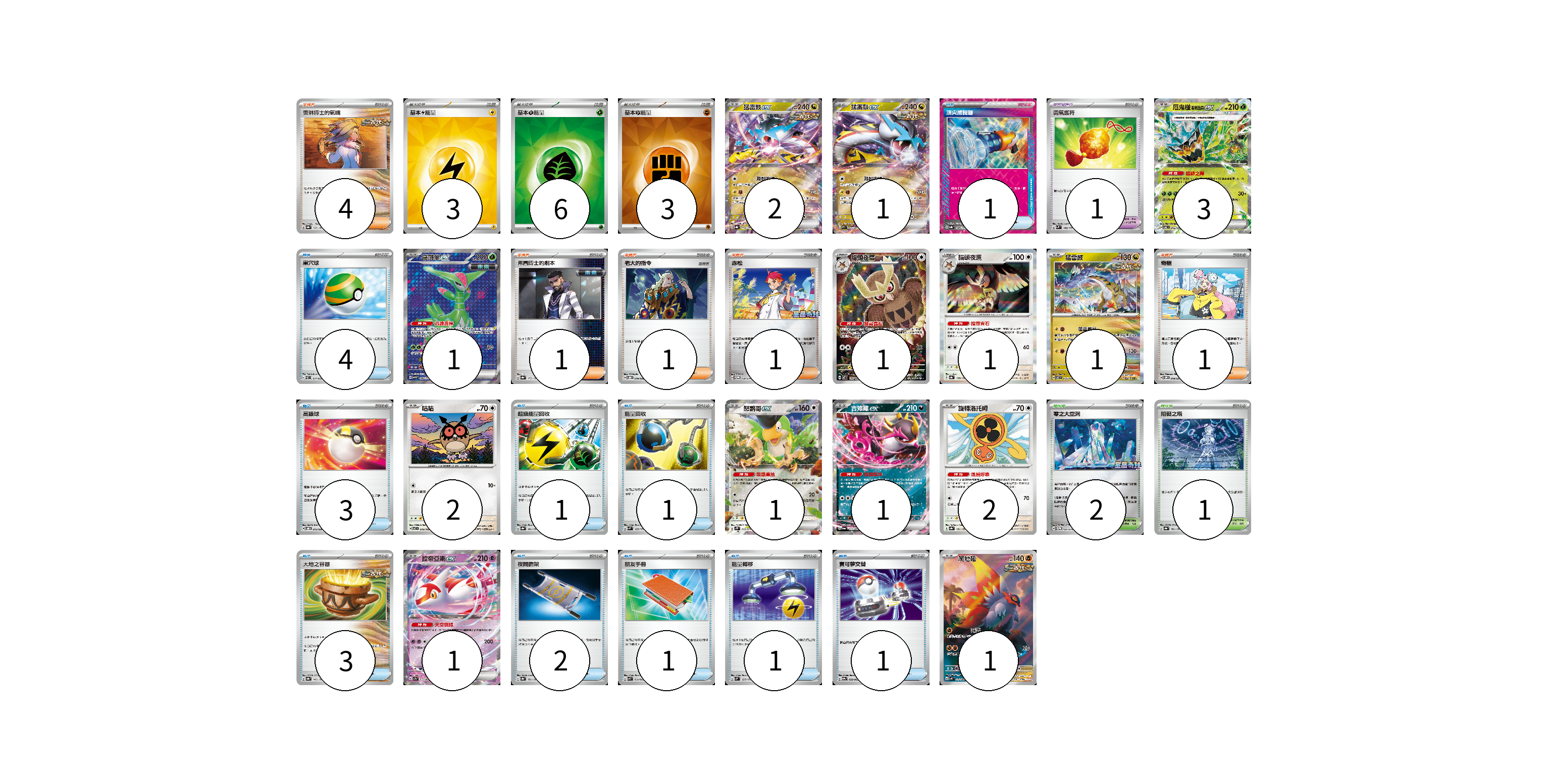 牌組構築方案 以此牌組為基礎新構築牌組 顯示卡面 顯示列表 寶可夢卡(18) 2 1 3 1 1 1 1 2 1 1 2 1 1 寶可夢道具(1) 1 物品卡(18) 1 4 3 1 1 3 2 1 1 1 支援者卡(8) 4 1 1 1 1 競技場卡(3) 2 1 能量卡(12) 3 6 3 寶可夢卡(18) 卡牌名稱 張數 卡牌名稱 張數 猛雷鼓ex SV8a 124/187 02 猛雷鼓ex SV5K 053/071 01 厄鬼椪 碧草面具ex SV6 016/101 03 鐵斑葉ex SV5M 084/071 01 貓頭夜鷹 SV7 114/102 01 貓頭夜鷹 SV8a 128/187 01 猛雷鼓 SV7 075/102 01 咕咕 SV7 076/102 02 怒鸚哥ex SV2P 065/071 01 吉雉雞ex SV6a 038/064 01 旋轉洛托姆 SV8a 131/187 02 拉帝亞斯ex SV7a 019/064 01 爬地翅 SV4K 074/066 01 寶可夢道具(1) 卡牌名稱 張數 卡牌名稱 張數 勇氣護符 SVM 142/175 01 物品卡(18) 卡牌名稱 張數 卡牌名稱 張數 頂尖捕捉器 SV8a 148/187 01 巢穴球 SVEL 011/020 04 高級球 SVOD 012/020 03 超級能量回收 SV8a 141/187 01 能量回收 SVM 125/175 01 大地之容器 SV8a 143/187 03 夜間擔架 SV8a 151/187 02 朋友手冊 SVK 014/042 01 能量轉移 SVM 127/175 01 寶可夢交替 SV9a 058/063 01 支援者卡(8) 卡牌名稱 張數 卡牌名稱 張數 奧琳博士的氣魄 SV8a 167/187 04 弗圖博士的劇本 SV8a 175/187 01 老大的指令 SVOD 019/020 01 赤松 SV-P 150/SV-P 01 奇樹 SVOM 018/021 01 競技場卡(3) 卡牌名稱 張數 卡牌名稱 張數 零之大空洞 SV-P 151/SV-P 02 阻礙之塔 SV8a 181/187 01 能量卡(12) 卡牌名稱 張數 卡牌名稱 張數 基本【雷】能量 SVM LIG 03 基本【草】能量 SVM GRA 06 基本【鬥】能量 SVM FIG 03 以此牌組為基礎新構築牌組 牌組編碼 AzjEVj-Mfnuub-DyhqYi copy 列印牌組單 牌組編碼已複製 分享至SNS