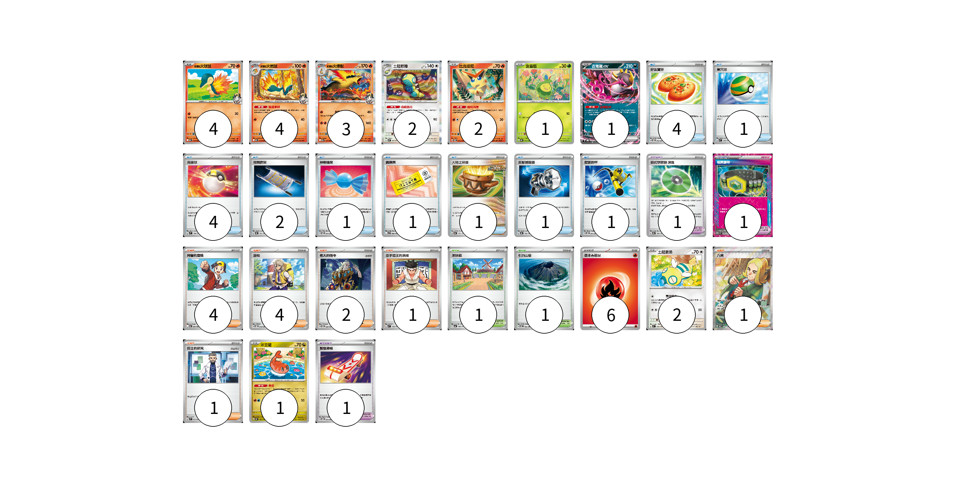 牌組構築方案 以此牌組為基礎新構築牌組 顯示卡面 顯示列表 寶可夢卡(20) 4 4 3 2 2 1 1 2 1 寶可夢道具(3) 1 1 1 物品卡(16) 4 1 4 2 1 1 1 1 1 支援者卡(13) 4 4 2 1 1 1 競技場卡(2) 1 1 能量卡(6) 6 寶可夢卡(20) 卡牌名稱 張數 卡牌名稱 張數 <阿響的>火球鼠 SV9a 015/063 04 <阿響的>火岩鼠 SV9a 016/063 04 <阿響的>火爆獸 SV9a 017/063 03 土龍節節 SV5K 057/071 02 比克提尼 SV8 012/106 02 含羞苞 SV8a 001/187 01 吉雉雞ex SVOD 004/020 01 土龍弟弟 SVM 095/175 02 米立龍 SV8a 121/187 01 寶可夢道具(3) 卡牌名稱 張數 卡牌名稱 張數 招式學習器 演進 SV8a 160/187 01 極限腰帶 SV5K 066/071 01 緊急滑板 SVOD 015/020 01 物品卡(16) 卡牌名稱 張數 卡牌名稱 張數 好友寶芬 SVOM 012/021 04 巢穴球 SVM 133/175 01 高級球 SVM 134/175 04 夜間擔架 SV8a 151/187 02 神奇糖果 SVOM 014/021 01 調換票 SV9 090/100 01 大地之容器 SV8a 143/187 01 反擊捕捉器 SV8a 139/187 01 厲害釣竿 SVOM 011/021 01 支援者卡(13) 卡牌名稱 張數 卡牌名稱 張數 阿響的冒險 SV9a 063/063 04 派帕 SVOD 018/020 04 老大的指令 SVOM 020/021 02 空手道王的演練 SVM 143/175 01 八朔 SV6 124/101 01 博士的研究 SVK 033/042 01 競技場卡(2) 卡牌名稱 張數 卡牌名稱 張數 深缽鎮 SV4a 185/190 01 引力山岳 SV8 106/106 01 能量卡(6) 卡牌名稱 張數 卡牌名稱 張數 基本【火】能量 SVF FIR 06 以此牌組為基礎新構築牌組 牌組編碼 BACKNE-SsgHLW-PEMApJ copy 列印牌組單 牌組編碼已複製 分享至SNS