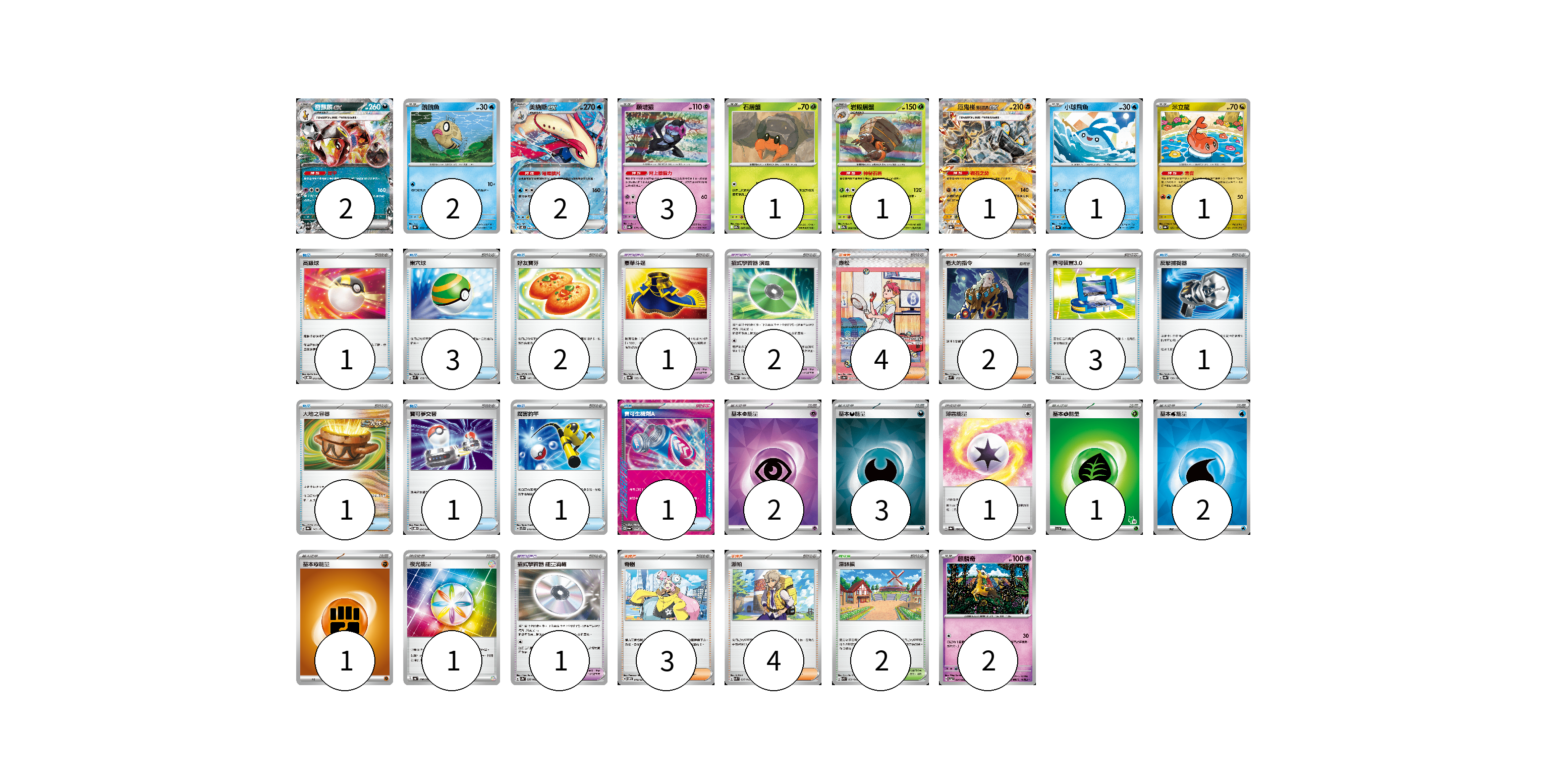 牌組構築方案 以此牌組為基礎新構築牌組 顯示卡面 顯示列表 寶可夢卡(16) 2 2 2 3 1 1 1 1 1 2 寶可夢道具(4) 1 2 1 物品卡(14) 1 3 2 3 1 1 1 1 1 支援者卡(13) 4 2 3 4 競技場卡(2) 2 能量卡(11) 2 3 1 1 2 1 1 寶可夢卡(16) 卡牌名稱 張數 卡牌名稱 張數 奇麒麟ex SV5M 042/071 02 醜醜魚 SV8a 035/187 02 美納斯ex SV8 026/106 02 願增猿 SV8a 075/187 03 石居蟹 SV9a 007/063 01 岩殿居蟹 SV9a 008/063 01 厄鬼椪 礎石面具ex SV8a 091/187 01 小球飛魚 SV3a 007/062 01 米立龍 SV8a 121/187 01 麒麟奇 SV5a 034/066 02 寶可夢道具(4) 卡牌名稱 張數 卡牌名稱 張數 豪華斗篷 SV8a 155/187 01 招式學習器 演進 SV8a 160/187 02 招式學習器 能量渦輪 SV3a 056/062 01 物品卡(14) 卡牌名稱 張數 卡牌名稱 張數 高級球 SVOD 012/020 01 巢穴球 SVM 133/175 03 好友寶芬 SV8a 147/187 02 寶可裝置3.0 SVC 015/021 03 反擊捕捉器 SV8a 139/187 01 大地之容器 SV8a 143/187 01 寶可夢交替 SVOD 014/020 01 厲害釣竿 SVTS 010/022 01 寶可生機劑A SV6a 055/064 01 支援者卡(13) 卡牌名稱 張數 卡牌名稱 張數 赤松 SV8a 227/187 04 老大的指令 SVM 172/175 02 奇樹 SVOM 018/021 03 派帕 SVK 035/042 04 競技場卡(2) 卡牌名稱 張數 卡牌名稱 張數 深缽鎮 SVK 039/042 02 能量卡(11) 卡牌名稱 張數 卡牌名稱 張數 基本【超】能量 SVOD PSY 02 基本【惡】能量 SVOM DAR 03 薄霧能量 SV8a 186/187 01 基本【草】能量 SVI GRA 01 基本【水】能量 SVM WAT 02 基本【鬥】能量 SVTG FIG 01 夜光能量 SV4a 190/190 01 以此牌組為基礎新構築牌組 牌組編碼 BBPYwJ-nqzdaE-FhOINI copy 列印牌組單 牌組編碼已複製 分享至SNS