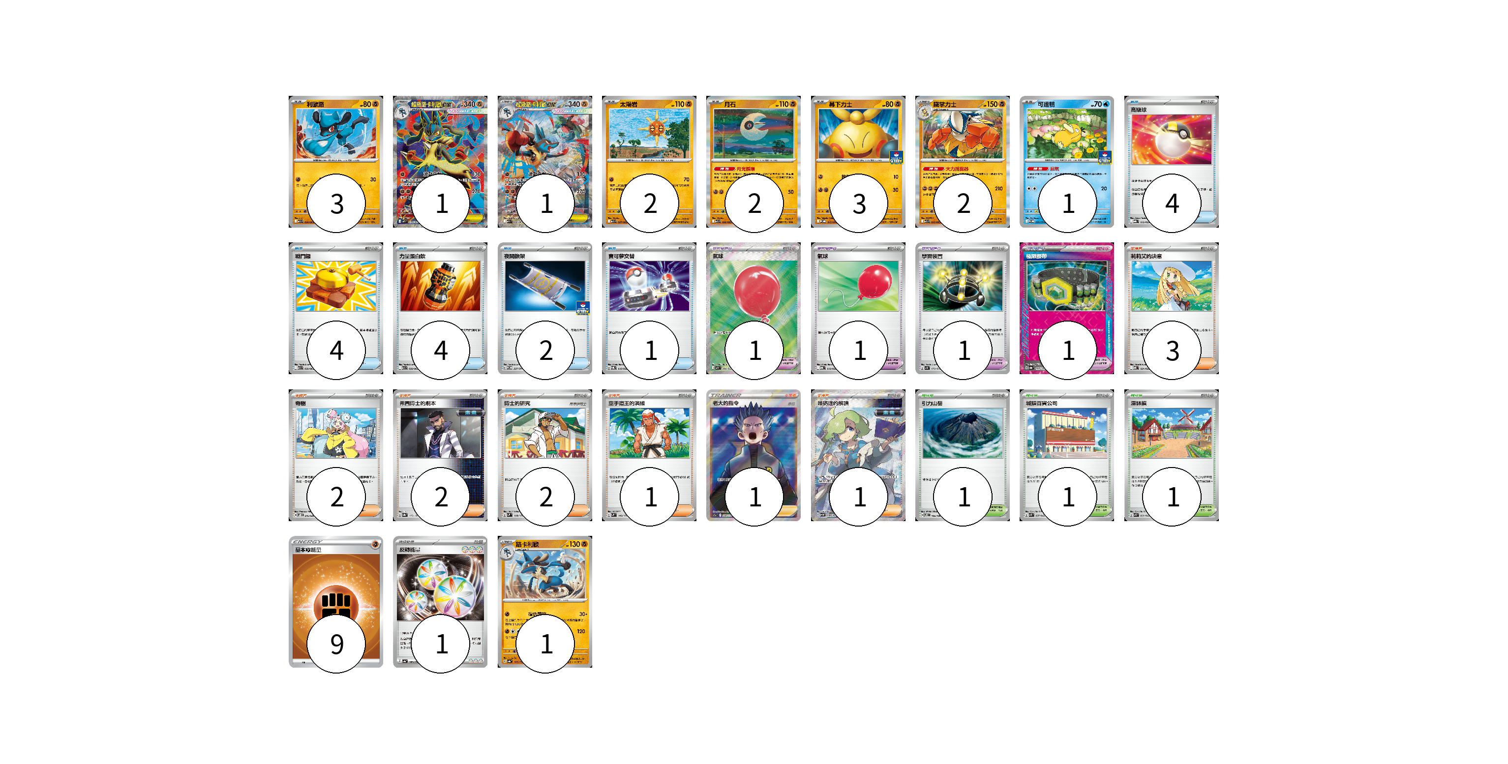 牌組構築方案 以此牌組為基礎新構築牌組 顯示卡面 顯示列表 寶可夢卡(16) 3 1 1 2 2 3 2 1 1 寶可夢道具(4) 1 1 1 1 物品卡(15) 4 4 4 2 1 支援者卡(12) 3 2 2 2 1 1 1 競技場卡(3) 1 1 1 能量卡(10) 9 1 寶可夢卡(16) 卡牌名稱 張數 卡牌名稱 張數 利歐路 M1L 028/063 03 超級路卡利歐ex M1L 078/063 01 超級路卡利歐ex M1L 088/063 01 太陽岩 M1L 027/063 02 月石 M1L 026/063 02 幕下力士 M-P 015/M-P 03 鐵掌力士 M1L 025/063 02 可達鴨 SV-P 220/SV-P 01 路卡利歐 SV4a 105/190 01 寶可夢道具(4) 卡牌名稱 張數 卡牌名稱 張數 氣球 M1L 084/063 01 氣球 MBG 019/022 01 學習裝置 SV1S 072/078 01 極限腰帶 SV8a 159/187 01 物品卡(15) 卡牌名稱 張數 卡牌名稱 張數 高級球 MBG 012/022 04 戰鬥鑼 M1L 059/063 04 力量蛋白飲 M1L 058/063 04 夜間擔架 SV-P 227/SV-P 02 寶可夢交替 SVQL 016/022 01 支援者卡(12) 卡牌名稱 張數 卡牌名稱 張數 莉莉艾的決意 MBD 021/022 03 奇樹 SVOD 016/020 02 弗圖博士的劇本 SV8a 175/187 02 博士的研究 SVM 168/175 02 空手道王的演練 SVM 149/175 01 老大的指令(赤日) S12a 250/172 01 暗碼迷的解讀 SV5M 090/071 01 競技場卡(3) 卡牌名稱 張數 卡牌名稱 張數 引力山岳 SV8 106/106 01 城鎮百貨公司 SVK 037/042 01 深缽鎮 SVK 039/042 01 能量卡(10) 卡牌名稱 張數 卡牌名稱 張數 基本鬥能量 SLL FIG 09 反轉能量 SV4a 189/190 01 以此牌組為基礎新構築牌組 牌組編碼 BCvdBF-KvITwk-oNfMSn copy 列印牌組單 牌組編碼已複製 分享至SNS