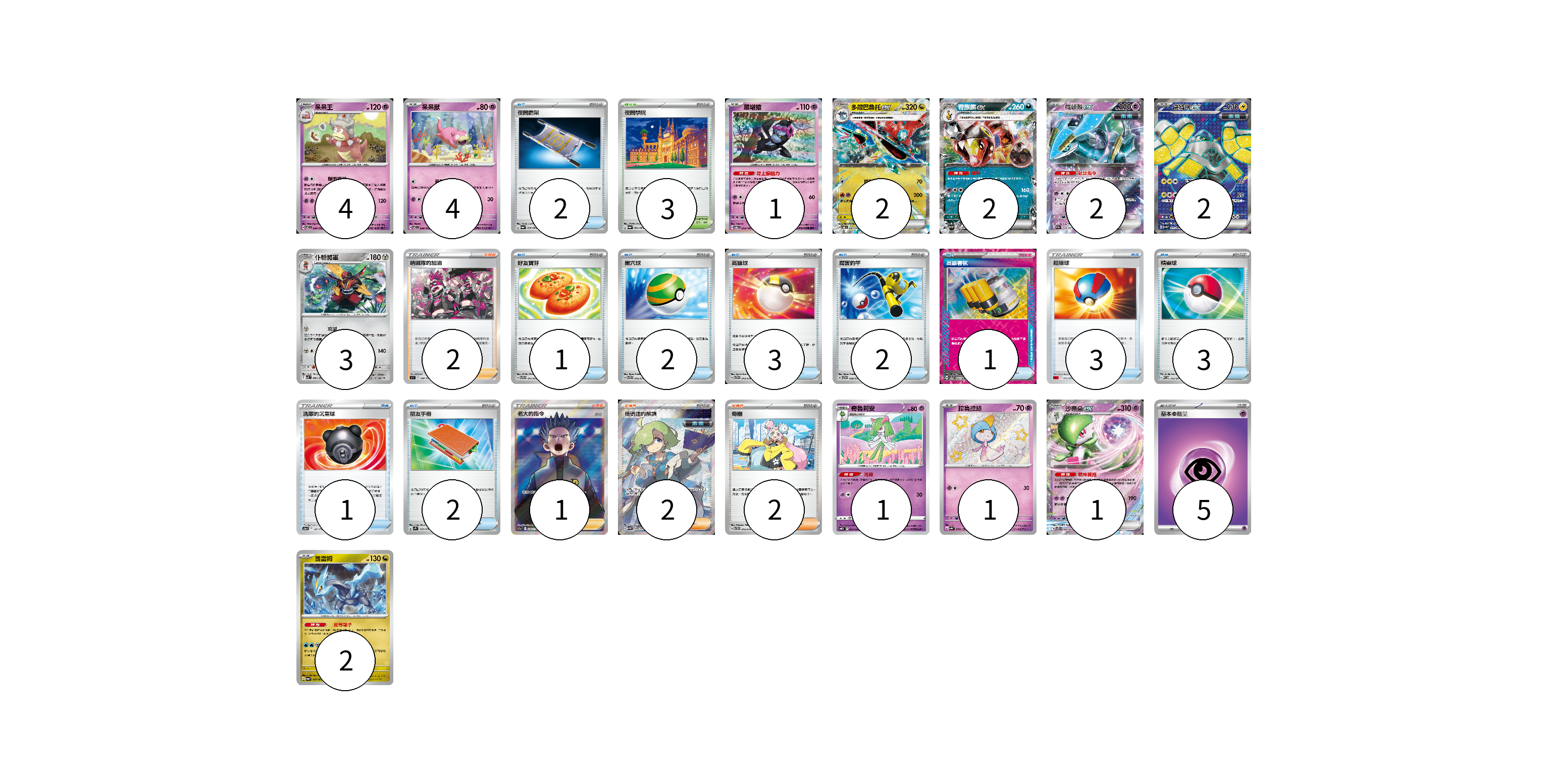 牌組構築方案 以此牌組為基礎新構築牌組 顯示卡面 顯示列表 寶可夢卡(25) 4 4 1 2 2 2 2 3 1 1 1 2 物品卡(20) 2 1 2 3 2 1 3 3 1 2 支援者卡(7) 2 1 2 2 競技場卡(3) 3 能量卡(5) 5 寶可夢卡(25) 卡牌名稱 張數 卡牌名稱 張數 呆呆王 SV7 039/102 04 呆呆獸 SV7 038/102 04 願增猿 SV6 055/101 01 多龍巴魯托ex SV6 081/101 02 奇麒麟ex SV5M 042/071 02 鐵頭殼ex SV5M 036/071 02 鐵臂膀ex SV4M 079/066 02 仆斬將軍 SV3 082/108 03 奇魯莉安 SVTS 003/022 01 拉魯拉絲 SV4a 258/190 01 沙奈朵ex SVTS 004/022 01 酋雷姆 SV6a 047/064 02 物品卡(20) 卡牌名稱 張數 卡牌名稱 張數 夜間擔架 SV6a 056/064 02 好友寶芬 SVTG 011/019 01 巢穴球 SVTG 012/019 02 高級球 SVTG 013/019 03 厲害釣竿 SVTG 009/019 02 高級香氛 SV5a 055/066 01 超級球 SDL 013/021 03 精靈球 SV-P 013/SV-P 03 洗翠的沉重球 S12a 140/172 01 朋友手冊 SV1S 069/078 02 支援者卡(7) 卡牌名稱 張數 卡牌名稱 張數 呐喊隊的加油 SI 388/414 02 老大的指令(赤日) S12a 250/172 01 暗碼迷的解讀 SV5M 090/071 02 奇樹 SVTH 015/018 02 競技場卡(3) 卡牌名稱 張數 卡牌名稱 張數 夜間學院 SV6a 064/064 03 能量卡(5) 卡牌名稱 張數 卡牌名稱 張數 基本【超】能量 SVHM PSY 05 以此牌組為基礎新構築牌組 牌組編碼 BDjQKh-NMQwFp-FCpUWx copy 列印牌組單 牌組編碼已複製 分享至SNS