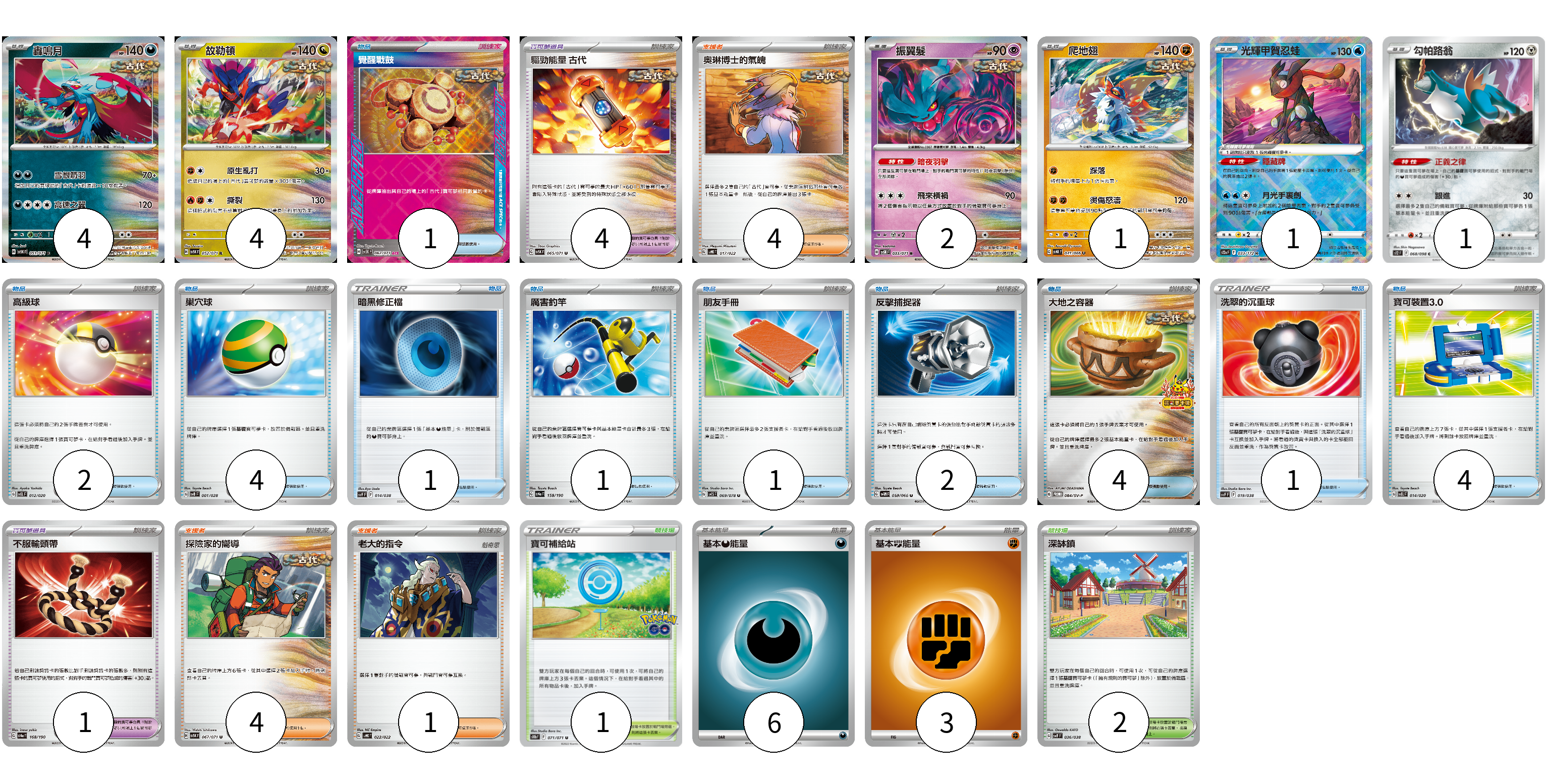 牌組構築方案 以此牌組為基礎新構築牌組 顯示卡面 顯示列表 寶可夢卡(13) 4 4 2 1 1 1 寶可夢道具(5) 4 1 物品卡(21) 1 2 4 1 1 1 2 4 1 4 支援者卡(9) 4 4 1 競技場卡(3) 1 2 能量卡(9) 6 3 寶可夢卡(13) 卡牌名稱 張數 卡牌名稱 張數 轟鳴月 SV5K 051/071 04 故勒頓 SV5K 052/071 04 振翼髮 SV5K 033/071 02 爬地翅 SV4K 041/066 01 光輝甲賀忍蛙 S12a 033/172 01 勾帕路翁 S12 068/098 01 寶可夢道具(5) 卡牌名稱 張數 卡牌名稱 張數 驅勁能量 古代 SV5K 065/071 04 不服輸頭帶 SV4a 168/190 01 物品卡(21) 卡牌名稱 張數 卡牌名稱 張數 覺醒戰鼓 SV5K 062/071 01 高級球 SVEL 012/020 02 巢穴球 SVB 001/028 04 暗黑修正檔 SVF 014/038 01 厲害釣竿 SV4a 158/190 01 朋友手冊 SV1S 069/078 01 反擊捕捉器 SV4M 059/066 02 大地之容器 SV-P 084/SV-P 04 洗翠的沉重球 SVF 019/038 01 寶可裝置3.0 SVEL 014/020 04 支援者卡(9) 卡牌名稱 張數 卡牌名稱 張數 奧琳博士的氣魄 SVHK 017/022 04 探險家的嚮導 SV5K 067/071 04 老大的指令 SVHK 022/022 01 競技場卡(3) 卡牌名稱 張數 卡牌名稱 張數 寶可補給站 S10b 071/071 01 深缽鎮 SVF 036/038 02 能量卡(9) 卡牌名稱 張數 卡牌名稱 張數 基本【惡】能量 SVF DAR 06 基本【鬥】能量 SVF FIG 03 以此牌組為基礎新構築牌組 牌組編碼 BEdpLO-pImTmt-mLAbYj copy 列印牌組單 牌組編碼已複製 分享至SNS