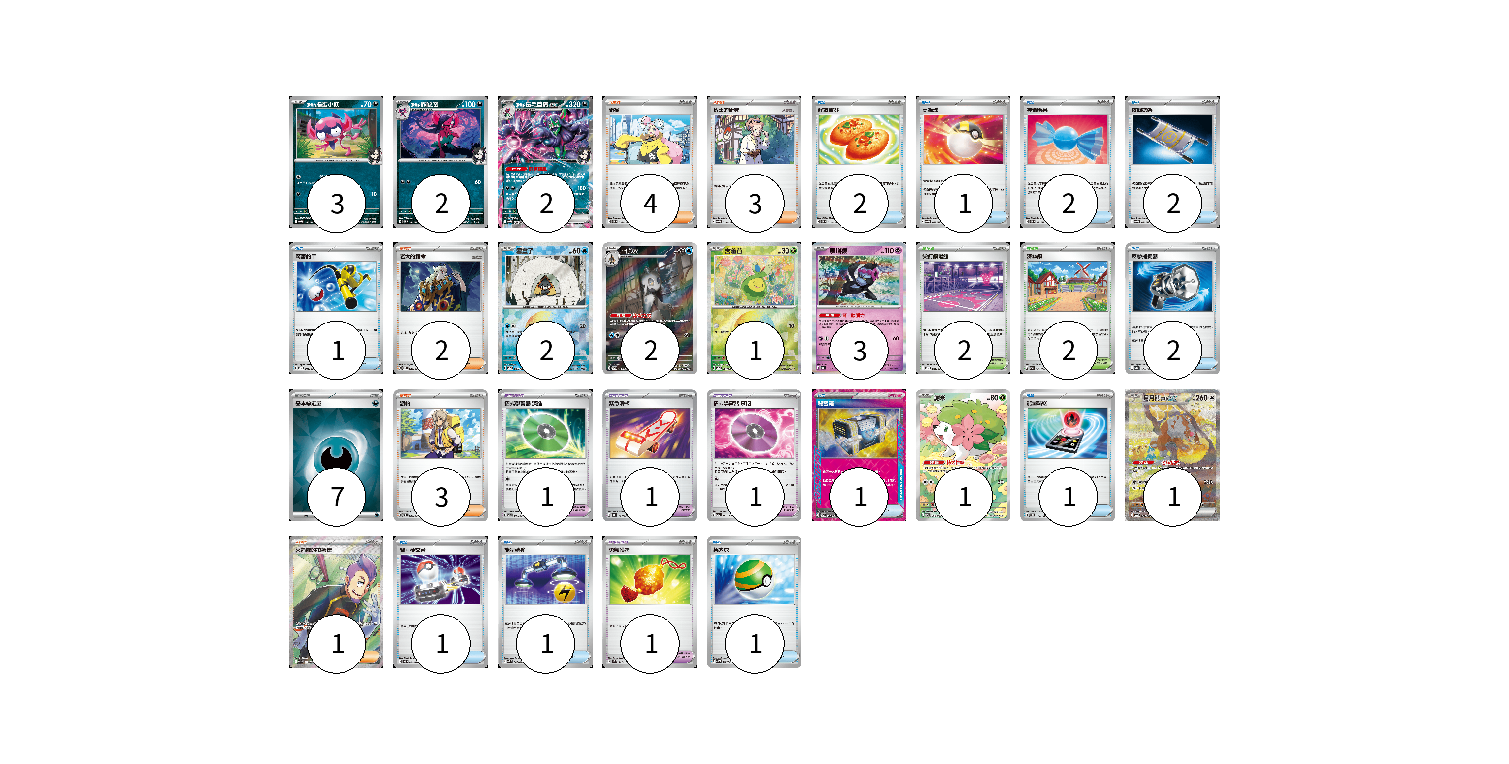 牌組構築方案 以此牌組為基礎新構築牌組 顯示卡面 顯示列表 寶可夢卡(17) 3 2 2 2 2 1 3 1 1 寶可夢道具(4) 1 1 1 1 物品卡(15) 2 1 2 2 1 2 1 1 1 1 1 支援者卡(13) 4 3 2 3 1 競技場卡(4) 2 2 能量卡(7) 7 寶可夢卡(17) 卡牌名稱 張數 卡牌名稱 張數 <瑪俐的>搗蛋小妖 SVOM 005/021 03 <瑪俐的>詐唬魔 SVOM 006/021 02 <瑪俐的>長毛巨魔ex SVOM 007/021 02 雪童子 SV8a 037/187 02 雪妖女 SV6 104/101 02 含羞苞 SV8a 001/187 01 願增猿 SV8a 075/187 03 謝米 SV9a 066/063 01 月月熊 赫月 ex SV5a 091/066 01 寶可夢道具(4) 卡牌名稱 張數 卡牌名稱 張數 招式學習器 演進 SVTL 017/021 01 緊急滑板 SV5K 064/071 01 招式學習器 衰退 SV4K 063/066 01 勇氣護符 SVM 142/175 01 物品卡(15) 卡牌名稱 張數 卡牌名稱 張數 好友寶芬 SVOM 012/021 02 高級球 SVOM 013/021 01 神奇糖果 SVOM 014/021 02 夜間擔架 SVOM 016/021 02 厲害釣竿 SVOM 011/021 01 反擊捕捉器 SV8a 139/187 02 秘密箱 SV6 092/101 01 能量輸送 SVD 112/139 01 寶可夢交替 SVOD 014/020 01 能量轉移 SVK 008/042 01 巢穴球 SVHM 012/022 01 支援者卡(13) 卡牌名稱 張數 卡牌名稱 張數 奇樹 SVOM 018/021 04 博士的研究 SVOM 019/021 03 老大的指令 SVOM 020/021 02 派帕 SVTL 020/021 03 火箭隊的拉姆達 SV10 122/098 01 競技場卡(4) 卡牌名稱 張數 卡牌名稱 張數 尖釘鎮道館 SVOM 021/021 02 深缽鎮 SVK 039/042 02 能量卡(7) 卡牌名稱 張數 卡牌名稱 張數 基本【惡】能量 SVK DAR 07 以此牌組為基礎新構築牌組 牌組編碼 BFBacZ-pNRHhz-hItmfA copy 列印牌組單 牌組編碼已複製 分享至SNS