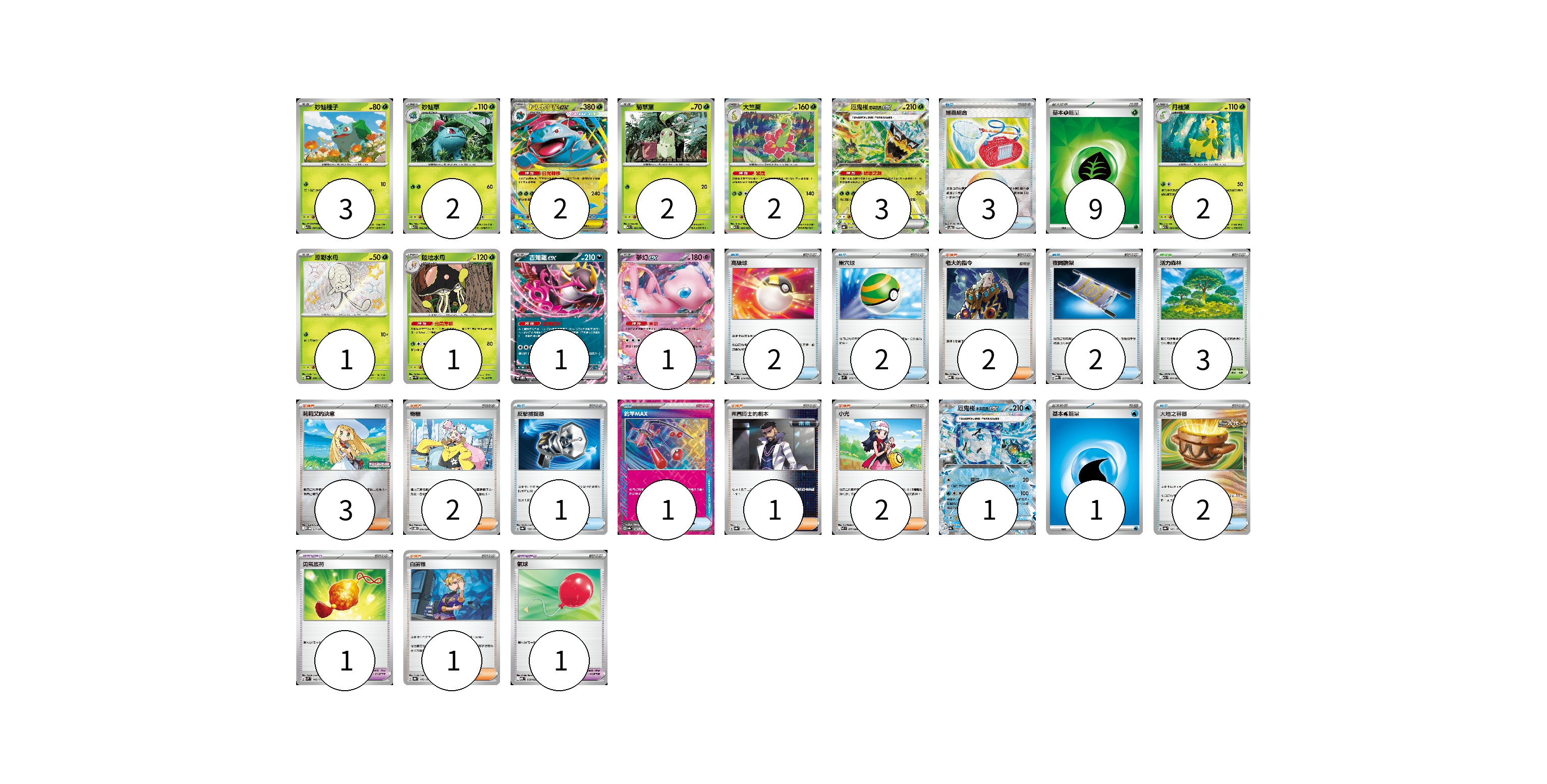 牌組構築方案 以此牌組為基礎新構築牌組 顯示卡面 顯示列表 寶可夢卡(21) 3 2 2 2 2 3 2 1 1 1 1 1 寶可夢道具(2) 1 1 物品卡(13) 3 2 2 2 1 1 2 支援者卡(11) 2 3 2 1 2 1 競技場卡(3) 3 能量卡(10) 9 1 寶可夢卡(21) 卡牌名稱 張數 卡牌名稱 張數 妙蛙種子 M1L 001/063 03 妙蛙草 M1L 002/063 02 超級妙蛙花ex M1L 003/063 02 菊草葉 M1S 003/063 02 大竺葵 M1S 005/063 02 厄鬼椪 碧草面具ex SV8a 020/187 03 月桂葉 M1S 004/063 02 原野水母 SV4a 206/190 01 陸地水母 SV4M 008/066 01 吉雉雞ex SVOD 004/020 01 夢幻ex SVK 001/042 01 厄鬼椪 水井面具ex SV8a 050/187 01 寶可夢道具(2) 卡牌名稱 張數 卡牌名稱 張數 勇氣護符 SVM 142/175 01 氣球 MBD 018/022 01 物品卡(13) 卡牌名稱 張數 卡牌名稱 張數 捕蟲組合 SV8a 150/187 03 高級球 MBD 014/022 02 巢穴球 SVM 133/175 02 夜間擔架 MBG 017/022 02 反擊捕捉器 SV8a 139/187 01 釣竿MAX SV8a 142/187 01 大地之容器 SV8a 143/187 02 支援者卡(11) 卡牌名稱 張數 卡牌名稱 張數 老大的指令 MBD 020/022 02 莉莉艾的決意 M-P 011/M-P 03 奇樹 SVOD 016/020 02 弗圖博士的劇本 SV8a 175/187 01 小光 M2 077/080 02 白蕾雅 SV8a 176/187 01 競技場卡(3) 卡牌名稱 張數 卡牌名稱 張數 活力森林 M1S 061/063 03 能量卡(10) 卡牌名稱 張數 卡牌名稱 張數 基本【草】能量 SVK GRA 09 基本【水】能量 SVF WAT 01 以此牌組為基礎新構築牌組 牌組編碼 BFQYYc-GuGLnk-cIXxqe copy 列印牌組單 牌組編碼已複製 分享至SNS