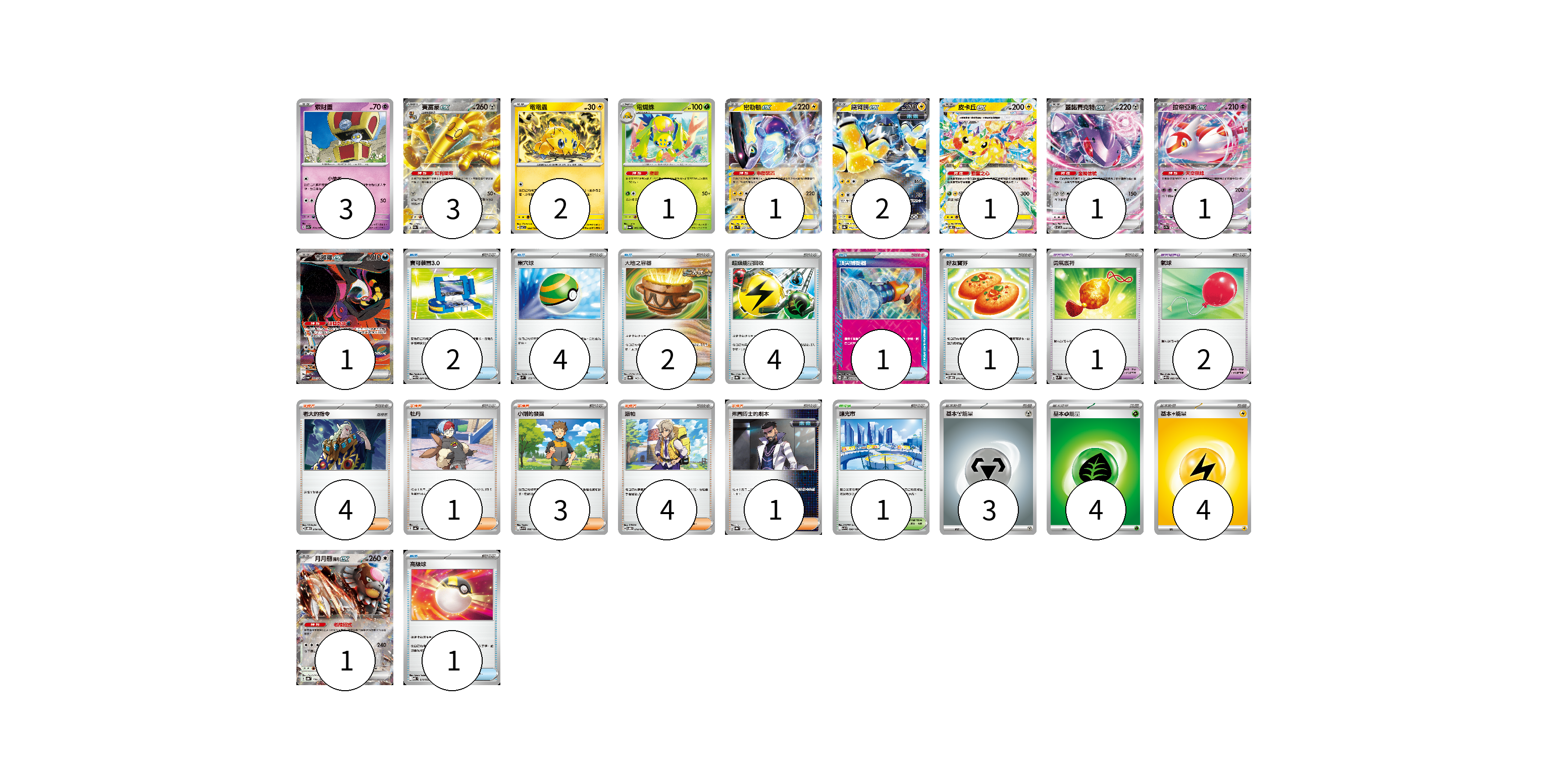 牌組構築方案 以此牌組為基礎新構築牌組 顯示卡面 顯示列表 寶可夢卡(17) 3 3 2 1 1 2 1 1 1 1 1 寶可夢道具(3) 1 2 物品卡(15) 2 4 2 4 1 1 1 支援者卡(13) 4 1 3 4 1 競技場卡(1) 1 能量卡(11) 3 4 4 寶可夢卡(17) 卡牌名稱 張數 卡牌名稱 張數 索財靈 SV7a 024/064 03 賽富豪ex SV3a 050/062 03 電電蟲 SV7 032/102 02 電蜘蛛 SV6a 002/064 01 密勒頓ex SV1V 037/078 01 鐵臂膀ex SV8a 054/187 02 皮卡丘ex SV8 033/106 01 蓋諾賽克特ex SV11B 069/086 01 拉帝亞斯ex SV7a 019/064 01 吉雉雞ex SV6a 089/064 01 月月熊 赫月ex SV8a 134/187 01 寶可夢道具(3) 卡牌名稱 張數 卡牌名稱 張數 勇氣護符 SVM 142/175 01 氣球 SV11B 082/086 02 物品卡(15) 卡牌名稱 張數 卡牌名稱 張數 寶可裝置3.0 SV11B 081/086 02 巢穴球 SVM 133/175 04 大地之容器 SV8a 143/187 02 超級能量回收 SV8a 141/187 04 頂尖捕捉器 SV5M 062/071 01 好友寶芬 SVOD 011/020 01 高級球 MBD 014/022 01 支援者卡(13) 卡牌名稱 張數 卡牌名稱 張數 老大的指令 SVOD 019/020 04 牡丹 SV4a 182/190 01 小剛的發掘 SV9 096/100 03 派帕 SVOD 018/020 04 弗圖博士的劇本 SV8a 175/187 01 競技場卡(1) 卡牌名稱 張數 卡牌名稱 張數 釀光市 SV9 098/100 01 能量卡(11) 卡牌名稱 張數 卡牌名稱 張數 基本【鋼】能量 SVF MET 03 基本【草】能量 SVTM GRA 04 基本【雷】能量 SVD LIG 04 以此牌組為基礎新構築牌組 牌組編碼 BGMGYI-ulhCpP-dYGHxL copy 列印牌組單 牌組編碼已複製 分享至SNS