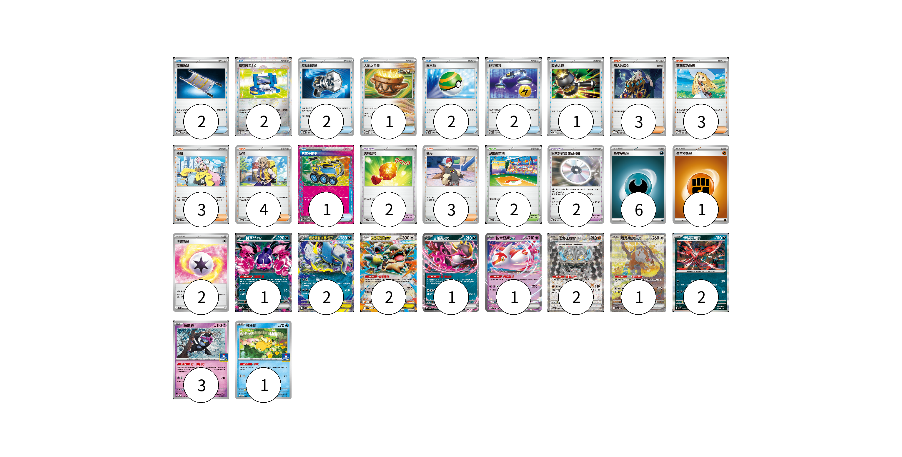 牌組構築方案 以此牌組為基礎新構築牌組 顯示卡面 顯示列表 寶可夢卡(16) 1 2 2 1 1 2 1 2 3 1 寶可夢道具(4) 2 2 物品卡(13) 2 2 2 1 2 2 1 1 支援者卡(16) 3 3 3 4 3 競技場卡(2) 2 能量卡(9) 6 1 2 寶可夢卡(16) 卡牌名稱 張數 卡牌名稱 張數 桃歹郎ex MBG 009/022 01 超級阿勃梭魯ex M1L 038/063 02 超級袋獸ex M1S 051/063 02 吉雉雞ex SVOM 009/021 01 拉帝亞斯ex MBD 003/022 01 厄鬼椪 礎石面具ex SV6 119/101 02 月月熊 赫月 ex SV5a 091/066 01 伊裴爾塔爾 M1L 040/063 02 願增猿 M-P 014/M-P 03 可達鴨 SV-P 220/SV-P 01 寶可夢道具(4) 卡牌名稱 張數 卡牌名稱 張數 勇氣護符 SVK 024/042 02 招式學習器 能量渦輪 SV3a 056/062 02 物品卡(13) 卡牌名稱 張數 卡牌名稱 張數 夜間擔架 MBG 017/022 02 寶可裝置3.0 SV11B 081/086 02 反擊捕捉器 SV8a 139/187 02 大地之容器 SV8a 143/187 01 巢穴球 SVM 133/175 02 能量轉移 SVK 008/042 02 改造之錘 SV5a 054/066 01 貴重手推車 SVK 020/042 01 支援者卡(16) 卡牌名稱 張數 卡牌名稱 張數 老大的指令 MBD 020/022 03 莉莉艾的決意 MBD 021/022 03 奇樹 SVOD 016/020 03 派帕 SVOD 018/020 04 牡丹 SV1S 077/078 03 競技場卡(2) 卡牌名稱 張數 卡牌名稱 張數 激動競技場 SV8 105/106 02 能量卡(9) 卡牌名稱 張數 卡牌名稱 張數 基本【惡】能量 SVF DAR 06 基本【鬥】能量 SVF FIG 01 薄霧能量 SV5M 071/071 02 以此牌組為基礎新構築牌組 牌組編碼 BGdTIm-EwrncR-BgHmry copy 列印牌組單 牌組編碼已複製 分享至SNS