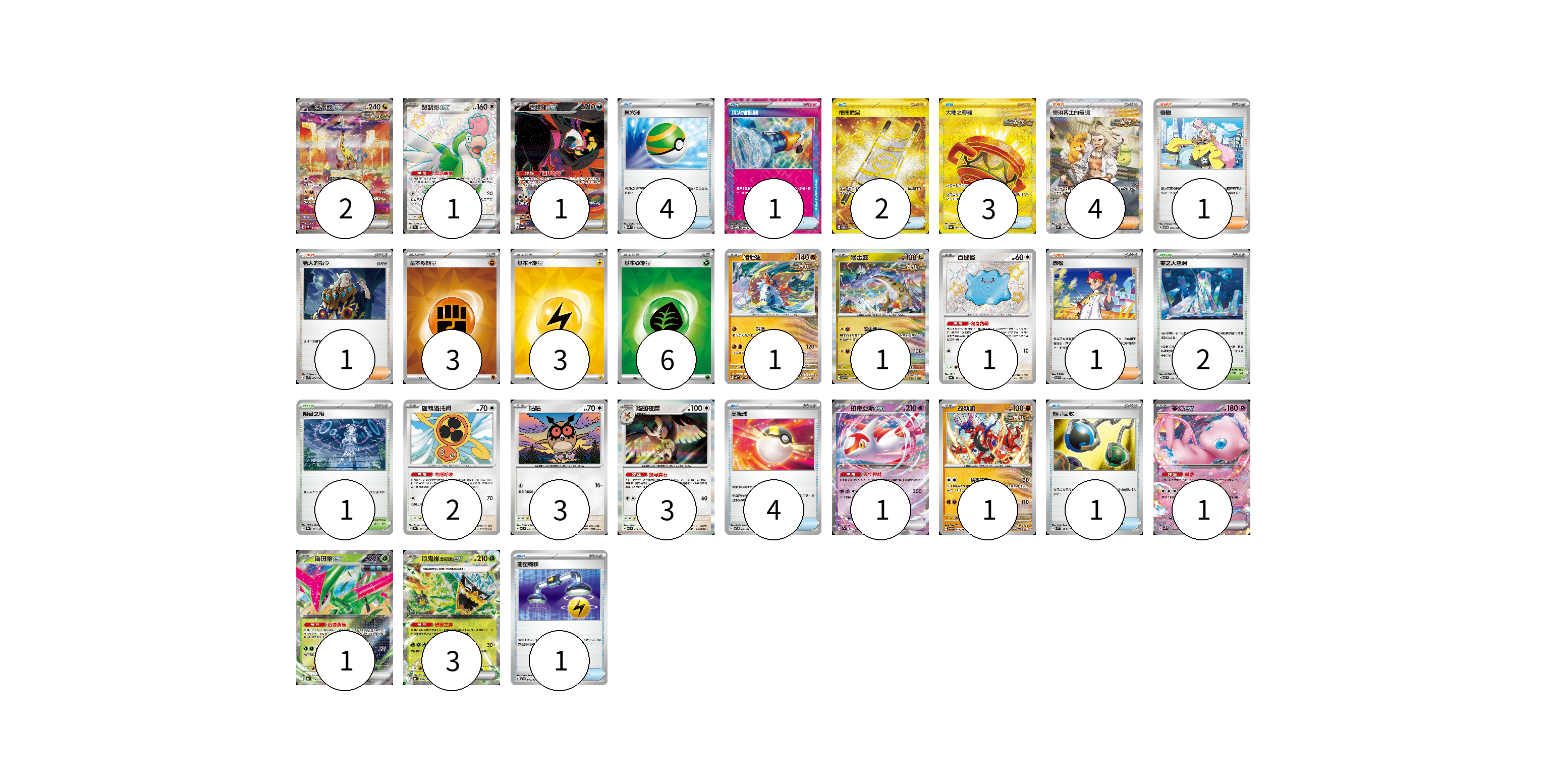 牌組構築方案 以此牌組為基礎新構築牌組 顯示卡面 顯示列表 寶可夢卡(22) 2 1 1 1 1 1 2 3 3 1 1 1 1 3 物品卡(16) 4 1 2 3 4 1 1 支援者卡(7) 4 1 1 1 競技場卡(3) 2 1 能量卡(12) 3 3 6 寶可夢卡(22) 卡牌名稱 張數 卡牌名稱 張數 猛雷鼓ex SV5K 095/071 02 怒鸚哥ex SV4a 337/190 01 吉雉雞ex SV6a 089/064 01 爬地翅 SV4K 041/066 01 猛雷鼓 SV7 075/102 01 百變怪 SV4a 309/190 01 旋轉洛托姆 SV8a 131/187 02 咕咕 SV7 076/102 03 貓頭夜鷹 SV7 077/102 03 拉帝亞斯ex SV7a 019/064 01 故勒頓 SV8 069/106 01 夢幻ex SVK 001/042 01 鐵斑葉ex SV8a 016/187 01 厄鬼椪 碧草面具ex SV8a 020/187 03 物品卡(16) 卡牌名稱 張數 卡牌名稱 張數 巢穴球 SVK 016/042 04 頂尖捕捉器 SV5M 062/071 01 夜間擔架 SV8 137/106 02 大地之容器 SV6a 093/064 03 高級球 SVTR 014/021 04 能量回收 SVM 125/175 01 能量轉移 SVTR 010/021 01 支援者卡(7) 卡牌名稱 張數 卡牌名稱 張數 奧琳博士的氣魄 SV4K 091/066 04 奇樹 SVTG 017/019 01 老大的指令 SVK 036/042 01 赤松 SV7 097/102 01 競技場卡(3) 卡牌名稱 張數 卡牌名稱 張數 零之大空洞 SV7 102/102 02 阻礙之塔 SV8a 181/187 01 能量卡(12) 卡牌名稱 張數 卡牌名稱 張數 基本【鬥】能量 SVK FIG 03 基本【雷】能量 SVK LIG 03 基本【草】能量 SVK GRA 06 以此牌組為基礎新構築牌組 牌組編碼 BHMMYb-iupDYv-hHjEDB copy 列印牌組單 牌組編碼已複製 分享至SNS
