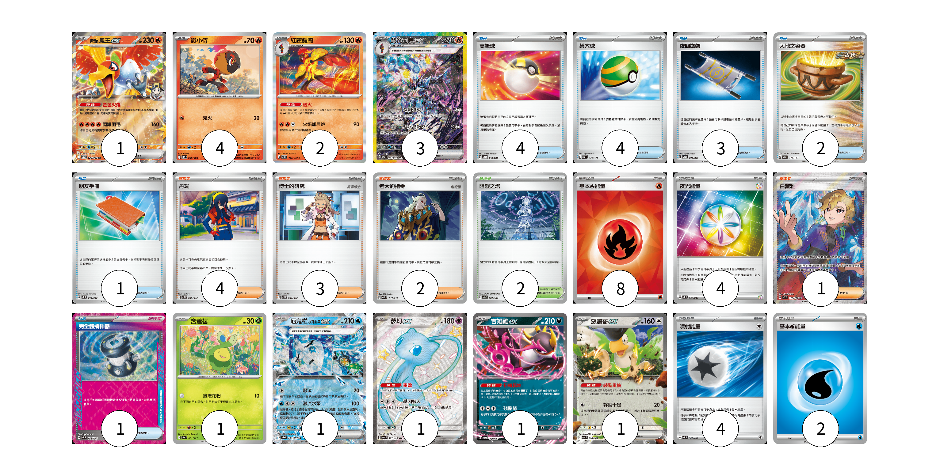 牌組構築方案 以此牌組為基礎新構築牌組 顯示卡面 顯示列表 寶可夢卡(15) 1 4 2 3 1 1 1 1 1 物品卡(15) 4 4 3 2 1 1 支援者卡(10) 4 3 2 1 競技場卡(2) 2 能量卡(18) 8 4 4 2 寶可夢卡(15) 卡牌名稱 張數 卡牌名稱 張數 <阿響的>鳳王ex SV9a 020/063 01 炭小侍 SVPS 005/008 04 紅蓮鎧騎 SV1S 012/078 02 蒼炎刃鬼ex SV8a 203/187 03 含羞苞 SV8a 001/187 01 厄鬼椪 水井面具ex SV8a 050/187 01 夢幻ex SV4a 327/190 01 吉雉雞ex SVOD 004/020 01 怒鸚哥ex SVK 006/042 01 物品卡(15) 卡牌名稱 張數 卡牌名稱 張數 高級球 SVOD 012/020 04 巢穴球 SVM 133/175 04 夜間擔架 SVOM 016/021 03 大地之容器 SV8a 143/187 02 朋友手冊 SVK 014/042 01 完全體攪拌器 SVK 017/042 01 支援者卡(10) 卡牌名稱 張數 卡牌名稱 張數 丹瑜 SVK 030/042 04 博士的研究 SVK 032/042 03 老大的指令 SVTH 017/018 02 白蕾雅 SV7 126/102 01 競技場卡(2) 卡牌名稱 張數 卡牌名稱 張數 阻礙之塔 SV8a 181/187 02 能量卡(18) 卡牌名稱 張數 卡牌名稱 張數 基本【火】能量 SVK FIR 08 夜光能量 SVK 042/042 04 噴射能量 SVK 040/042 04 基本【水】能量 SVF WAT 02 以此牌組為基礎新構築牌組 牌組編碼 BHghsK-TaPzFA-KezOHe copy 列印牌組單 牌組編碼已複製 分享至SNS