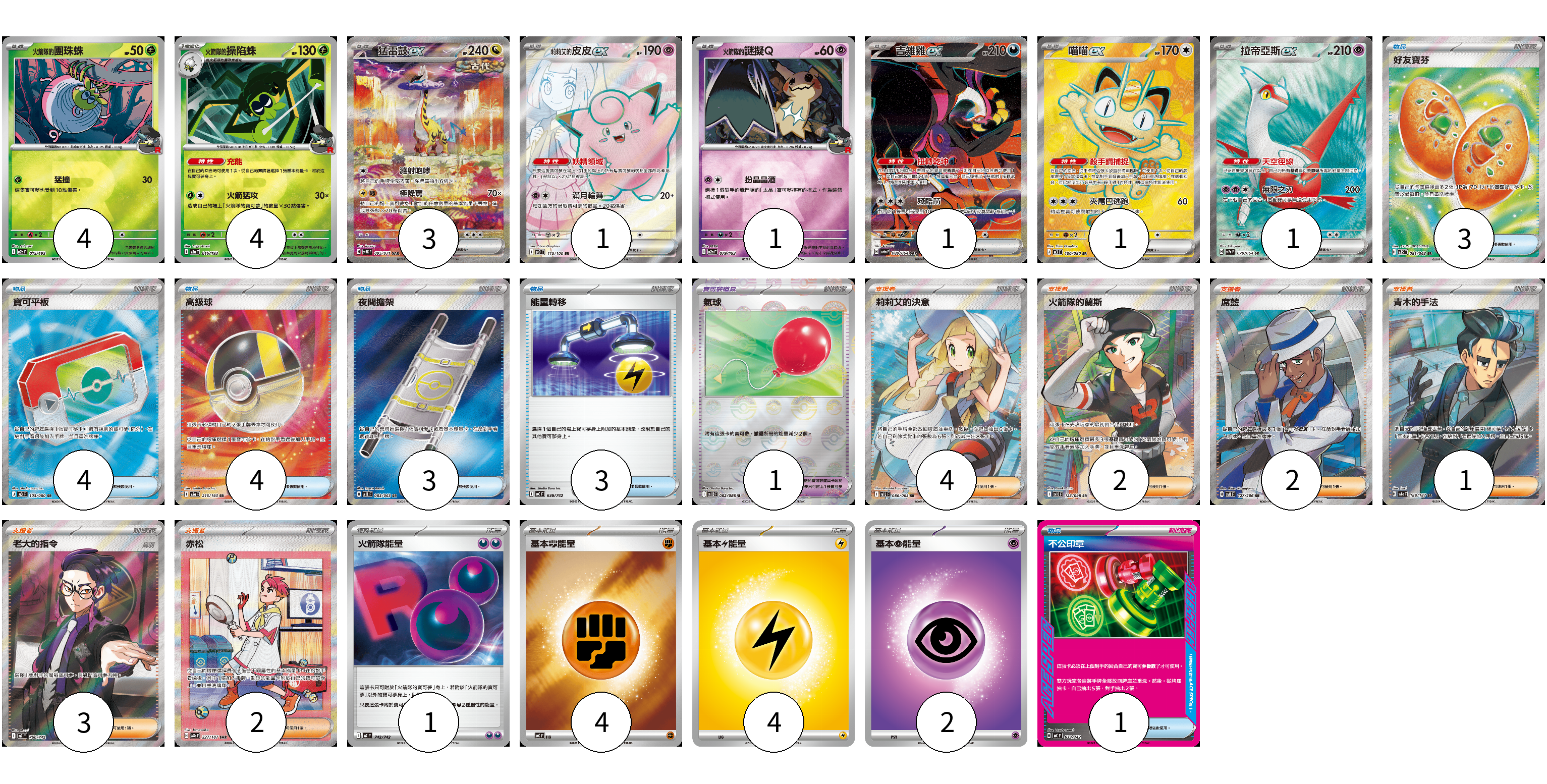 牌組構築方案 以此牌組為基礎新構築牌組 顯示卡面 顯示列表 寶可夢卡(16) 4 4 3 1 1 1 1 1 寶可夢道具(1) 1 物品卡(18) 3 4 4 3 3 1 支援者卡(14) 4 2 2 1 3 2 能量卡(11) 1 4 4 2 寶可夢卡(16) 卡牌名稱 張數 卡牌名稱 張數 <火箭隊的>團珠蛛 M2a 015/193 04 <火箭隊的>操陷蛛 M2a 016/193 04 猛雷鼓ex SV5K 095/071 03 莉莉艾的皮皮ex SV9 115/100 01 <火箭隊的>謎擬Q M2a 079/193 01 吉雉雞ex SV6a 089/064 01 喵喵ex M3 100/080 01 拉帝亞斯ex SV7a 078/064 01 寶可夢道具(1) 卡牌名稱 張數 卡牌名稱 張數 氣球 SV11B 082/086 01 物品卡(18) 卡牌名稱 張數 卡牌名稱 張數 好友寶芬 M1S 081/063 03 寶可平板 M3 103/080 04 高級球 M2a 216/193 04 夜間擔架 M1L 083/063 03 能量轉移 MC 638/742 03 不公印章 MC 633/742 01 支援者卡(14) 卡牌名稱 張數 卡牌名稱 張數 莉莉艾的決意 M1L 086/063 04 火箭隊的蘭斯 SV10 123/098 02 席藍 SV8 127/106 02 青木的手法 SV8a 188/187 01 老大的指令(烏羽) MC 760/742 03 赤松 SV8a 227/187 02 能量卡(11) 卡牌名稱 張數 卡牌名稱 張數 火箭隊能量 MC 742/742 01 基本【鬥】能量 MC FIG 04 基本【雷】能量 MJ LIG 04 基本【超】能量 M-P PSY 02 以此牌組為基礎新構築牌組 牌組編碼 BJwfkQ-XbtKdi-lzuJCy copy 列印牌組單 牌組編碼已複製 分享至SNS