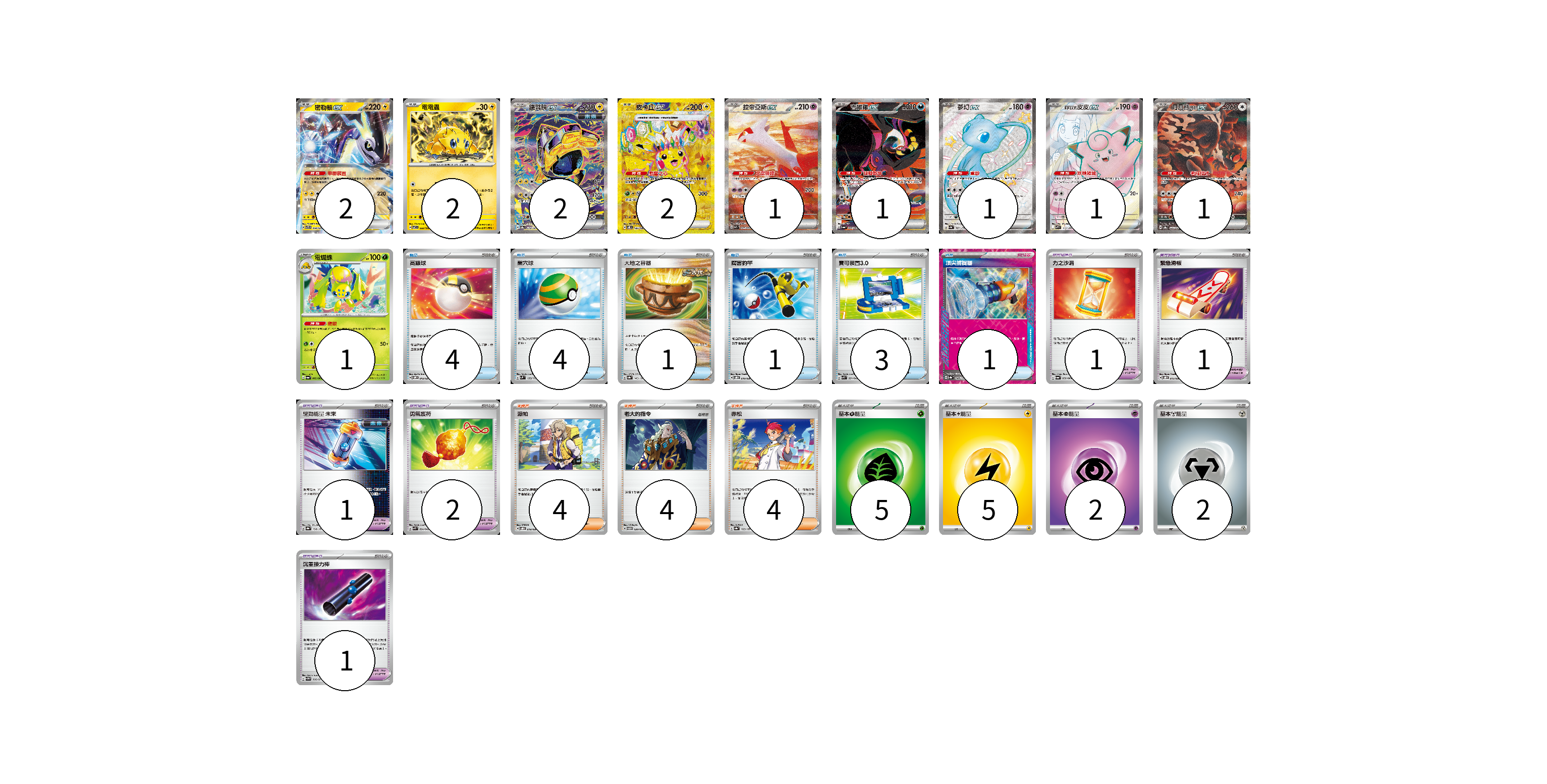 牌組構築方案 以此牌組為基礎新構築牌組 顯示卡面 顯示列表 寶可夢卡(14) 2 2 2 2 1 1 1 1 1 1 寶可夢道具(6) 1 1 1 2 1 物品卡(14) 4 4 1 1 3 1 支援者卡(12) 4 4 4 能量卡(14) 5 5 2 2 寶可夢卡(14) 卡牌名稱 張數 卡牌名稱 張數 密勒頓ex SVTR 008/021 02 電電蟲 SV7 032/102 02 鐵臂膀ex SV8a 210/187 02 皮卡丘ex SV8 136/106 02 拉帝亞斯ex SV7a 087/064 01 吉雉雞ex SV6a 089/064 01 夢幻ex SV4a 327/190 01 莉莉艾的皮皮ex SV9 115/100 01 月月熊 赫月ex SV8a 225/187 01 電蜘蛛 SV6a 002/064 01 寶可夢道具(6) 卡牌名稱 張數 卡牌名稱 張數 力之沙漏 SV6a 058/064 01 緊急滑板 SVOD 015/020 01 驅勁能量 未來 SV8a 158/187 01 勇氣護符 SVK 024/042 02 沉重接力棒 SV5M 066/071 01 物品卡(14) 卡牌名稱 張數 卡牌名稱 張數 高級球 SVOM 013/021 04 巢穴球 SVM 133/175 04 大地之容器 SV8a 143/187 01 厲害釣竿 SVOD 010/020 01 寶可裝置3.0 SVK 021/042 03 頂尖捕捉器 SV8a 148/187 01 支援者卡(12) 卡牌名稱 張數 卡牌名稱 張數 派帕 SVOD 018/020 04 老大的指令 SVTM 020/022 04 赤松 SV8a 163/187 04 能量卡(14) 卡牌名稱 張數 卡牌名稱 張數 基本草能量 sv-p GRA 05 基本雷能量 sv-p LIG 05 基本超能量 sv-p PSY 02 基本鋼能量 sv-p MET 02 以此牌組為基礎新構築牌組 牌組編碼 BMgBvo-DoWMcs-InmEnI copy 列印牌組單 牌組編碼已複製 分享至SNS