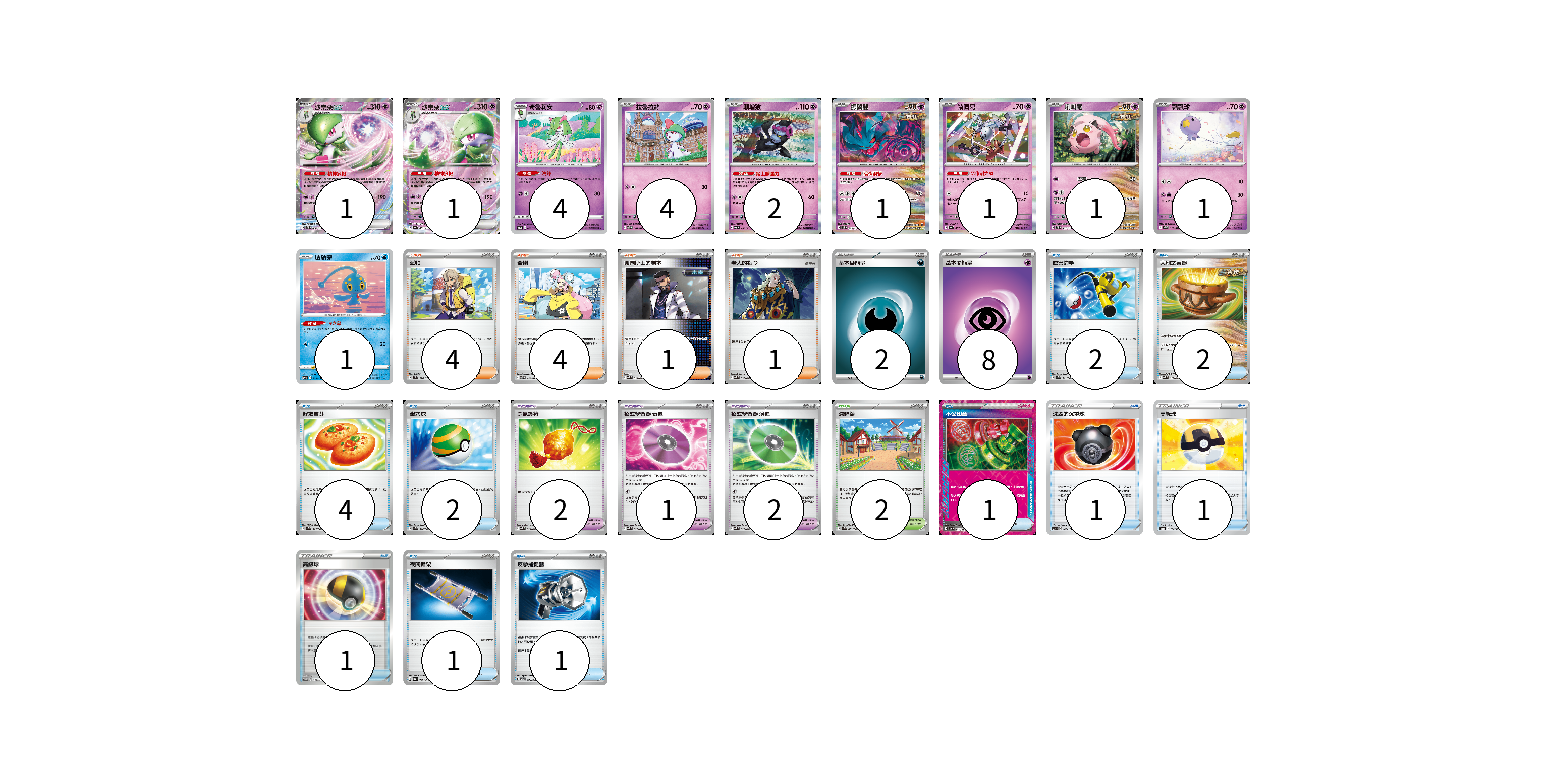 牌組構築方案 以此牌組為基礎新構築牌組 顯示卡面 顯示列表 寶可夢卡(17) 1 1 4 4 2 1 1 1 1 1 寶可夢道具(5) 2 1 2 物品卡(16) 2 2 4 2 1 1 1 1 1 1 支援者卡(10) 4 4 1 1 競技場卡(2) 2 能量卡(10) 2 8 寶可夢卡(17) 卡牌名稱 張數 卡牌名稱 張數 沙奈朵ex SVTS 004/022 01 沙奈朵ex SV4a 082/190 01 奇魯莉安 SVTS 003/022 04 拉魯拉絲 SVTS 002/022 04 願增猿 SV6 055/101 02 振翼髮 SV5K 033/071 01 鑰圈兒 SV4a 087/190 01 吼叫尾 SVTS 007/022 01 飄飄球 SV1S 029/078 01 瑪納霏 SVF 003/038 01 寶可夢道具(5) 卡牌名稱 張數 卡牌名稱 張數 勇氣護符 SVK 024/042 02 招式學習器 衰退 SVK 026/042 01 招式學習器 演進 SVK 025/042 02 物品卡(16) 卡牌名稱 張數 卡牌名稱 張數 厲害釣竿 SVK 011/042 02 大地之容器 SVK 012/042 02 好友寶芬 SVK 015/042 04 巢穴球 SVK 016/042 02 不公印章 SV5a 053/066 01 洗翠的沉重球 S12a 140/172 01 高級球 S12a 138/172 01 高級球 S-P 148/S-P 01 夜間擔架 SV6a 056/064 01 反擊捕捉器 SVTS 009/022 01 支援者卡(10) 卡牌名稱 張數 卡牌名稱 張數 派帕 SV1V 076/078 04 奇樹 SVTS 018/022 04 弗圖博士的劇本 SVK 034/042 01 老大的指令 SVK 036/042 01 競技場卡(2) 卡牌名稱 張數 卡牌名稱 張數 深缽鎮 SVK 039/042 02 能量卡(10) 卡牌名稱 張數 卡牌名稱 張數 基本惡能量 sv-p DAR 02 基本【超】能量 SVF PSY 08 以此牌組為基礎新構築牌組 牌組編碼 BOqTIU-nCYfCd-MToieT copy 列印牌組單 牌組編碼已複製 分享至SNS