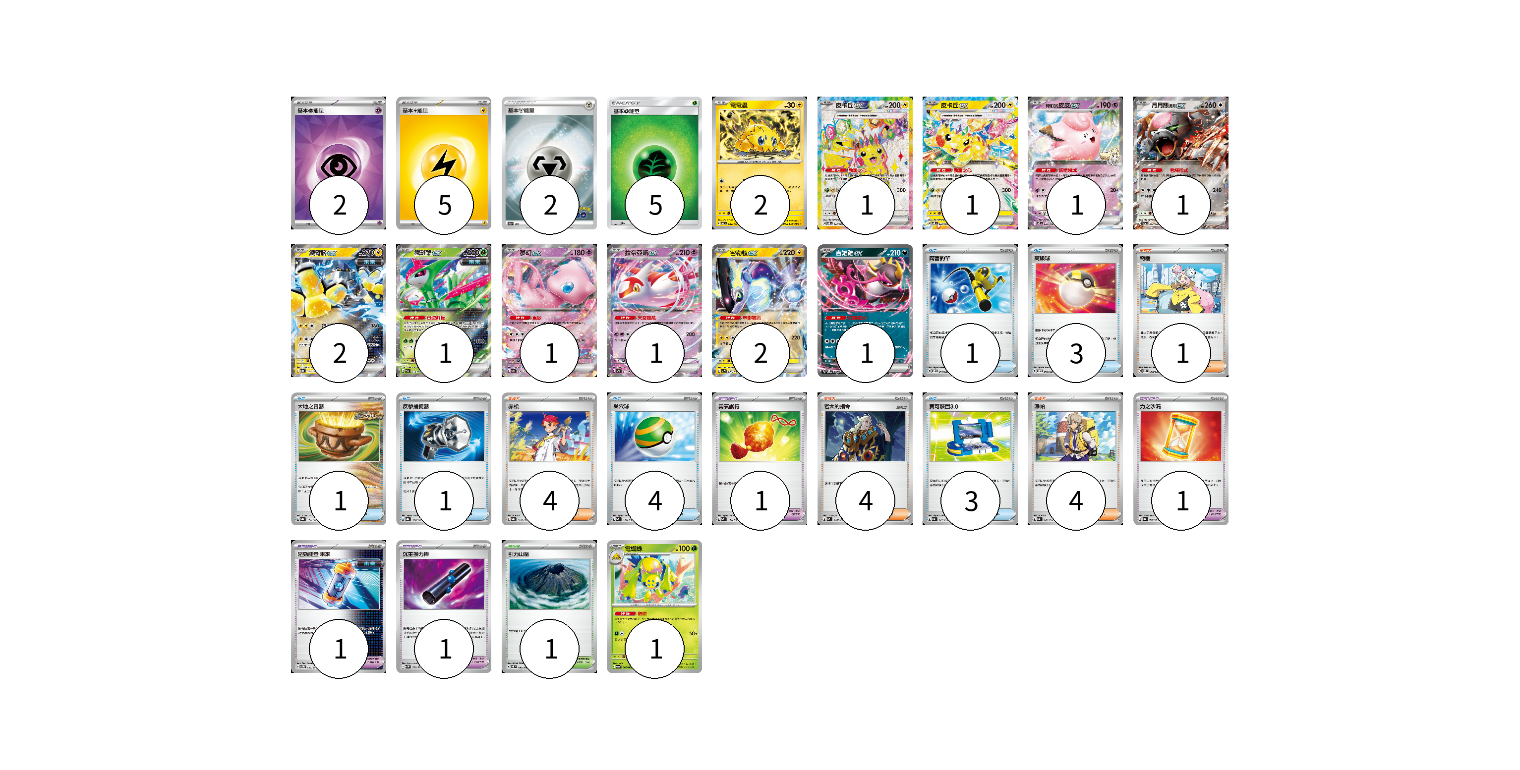 牌組構築方案 以此牌組為基礎新構築牌組 顯示卡面 顯示列表 寶可夢卡(15) 2 1 1 1 1 2 1 1 1 2 1 1 寶可夢道具(4) 1 1 1 1 物品卡(13) 1 3 1 1 4 3 支援者卡(13) 1 4 4 4 競技場卡(1) 1 能量卡(14) 2 5 2 5 寶可夢卡(15) 卡牌名稱 張數 卡牌名稱 張數 電電蟲 SV7 032/102 02 皮卡丘ex SV8 122/106 01 皮卡丘ex SV8 033/106 01 莉莉艾的皮皮ex SV9 033/100 01 月月熊 赫月 ex SV5a 052/066 01 鐵臂膀ex SV8a 054/187 02 鐵斑葉ex SV5M 016/071 01 夢幻ex SV4a 076/190 01 拉帝亞斯ex SV7a 019/064 01 密勒頓ex SV1V 037/078 02 吉雉雞ex SVOM 009/021 01 電蜘蛛 SV6a 002/064 01 寶可夢道具(4) 卡牌名稱 張數 卡牌名稱 張數 勇氣護符 SVM 142/175 01 力之沙漏 SV6a 058/064 01 驅勁能量 未來 SV5M 065/071 01 沉重接力棒 SV5M 066/071 01 物品卡(13) 卡牌名稱 張數 卡牌名稱 張數 厲害釣竿 SVOM 011/021 01 高級球 SVOM 013/021 03 大地之容器 SV8a 143/187 01 反擊捕捉器 SV8a 139/187 01 巢穴球 SVM 133/175 04 寶可裝置3.0 SVK 021/042 03 支援者卡(13) 卡牌名稱 張數 卡牌名稱 張數 奇樹 SVOM 018/021 01 赤松 SV8a 163/187 04 老大的指令 SVM 172/175 04 派帕 SVK 035/042 04 競技場卡(1) 卡牌名稱 張數 卡牌名稱 張數 引力山岳 SV8 106/106 01 能量卡(14) 卡牌名稱 張數 卡牌名稱 張數 基本【超】能量 SVOD PSY 02 基本雷能量 sv-p LIG 05 基本鋼能量 S10b MET 02 基本草能量 AS6D GRA 05 以此牌組為基礎新構築牌組 牌組編碼 BPyZjl-veJeOZ-rMILTW copy 列印牌組單 牌組編碼已複製 分享至SNS