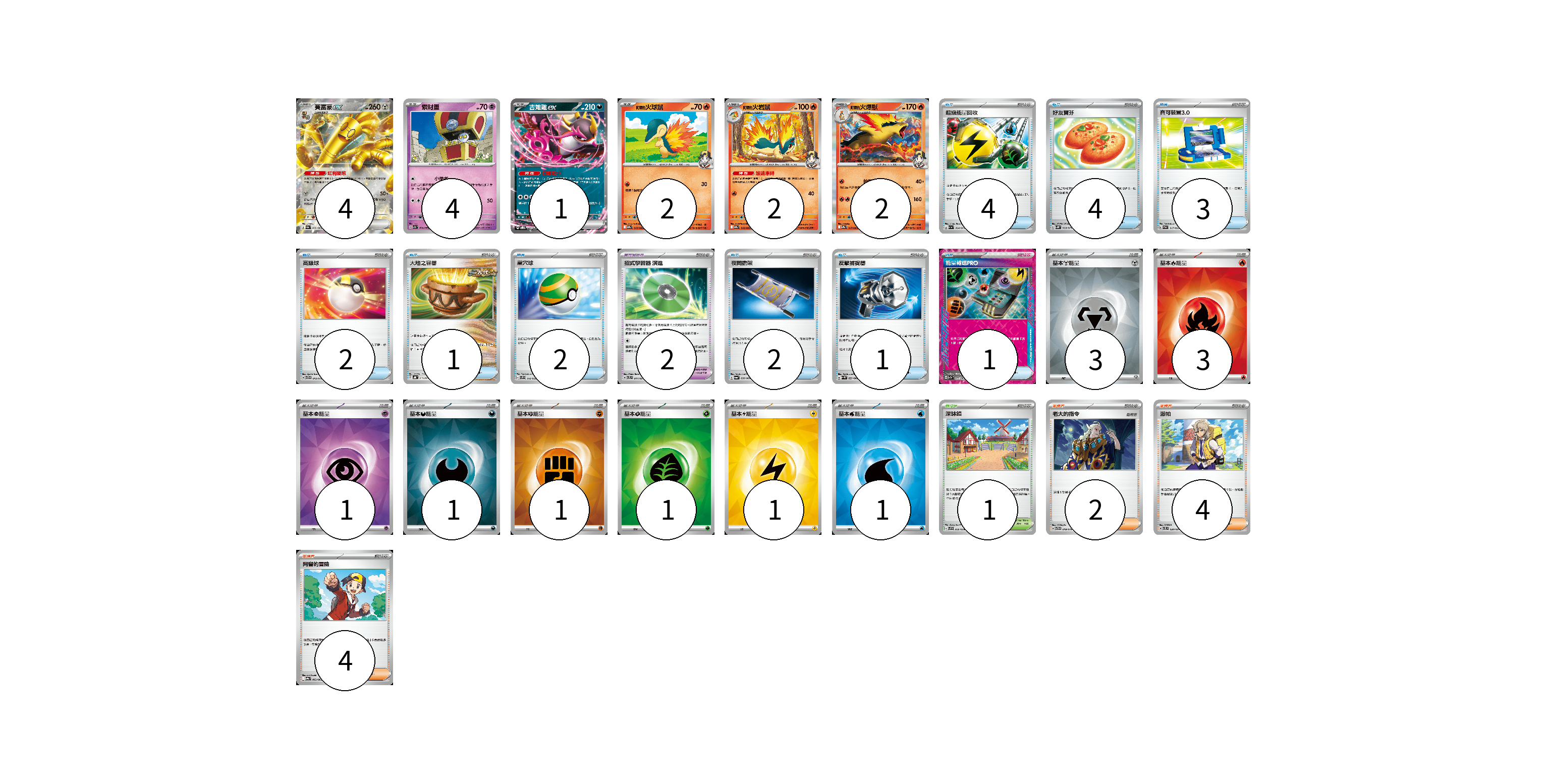牌組構築方案 以此牌組為基礎新構築牌組 顯示卡面 顯示列表 寶可夢卡(15) 4 4 1 2 2 2 寶可夢道具(2) 2 物品卡(20) 4 4 3 2 1 2 2 1 1 支援者卡(10) 2 4 4 競技場卡(1) 1 能量卡(12) 3 3 1 1 1 1 1 1 寶可夢卡(15) 卡牌名稱 張數 卡牌名稱 張數 賽富豪ex SV3a 050/062 04 索財靈 SV7a 024/064 04 吉雉雞ex SVOD 004/020 01 <阿響的>火球鼠 SV9a 015/063 02 <阿響的>火岩鼠 SV9a 016/063 02 <阿響的>火爆獸 SV9a 017/063 02 寶可夢道具(2) 卡牌名稱 張數 卡牌名稱 張數 招式學習器 演進 SVTL 017/021 02 物品卡(20) 卡牌名稱 張數 卡牌名稱 張數 超級能量回收 SV1a 064/073 04 好友寶芬 SV5K 063/071 04 寶可裝置3.0 SVAM 017/023 03 高級球 SVTG 013/019 02 大地之容器 SVHK 011/022 01 巢穴球 SVF 016/038 02 夜間擔架 SV6a 056/064 02 反擊捕捉器 SV4M 059/066 01 能量輸送PRO SV7a 052/064 01 支援者卡(10) 卡牌名稱 張數 卡牌名稱 張數 老大的指令 SVTG 019/019 02 派帕 SVTL 020/021 04 阿響的冒險 SV9a 063/063 04 競技場卡(1) 卡牌名稱 張數 卡牌名稱 張數 深缽鎮 SVF 036/038 01 能量卡(12) 卡牌名稱 張數 卡牌名稱 張數 基本【鋼】能量 SVOD MET 03 基本【火】能量 SVK FIR 03 基本【超】能量 SVOD PSY 01 基本【惡】能量 SVOM DAR 01 基本【鬥】能量 SVK FIG 01 基本【草】能量 SVK GRA 01 基本【雷】能量 SVK LIG 01 基本【水】能量 SVK WAT 01 以此牌組為基礎新構築牌組 牌組編碼 BQDrOf-DajaQT-UsPAsJ copy 列印牌組單 牌組編碼已複製 分享至SNS