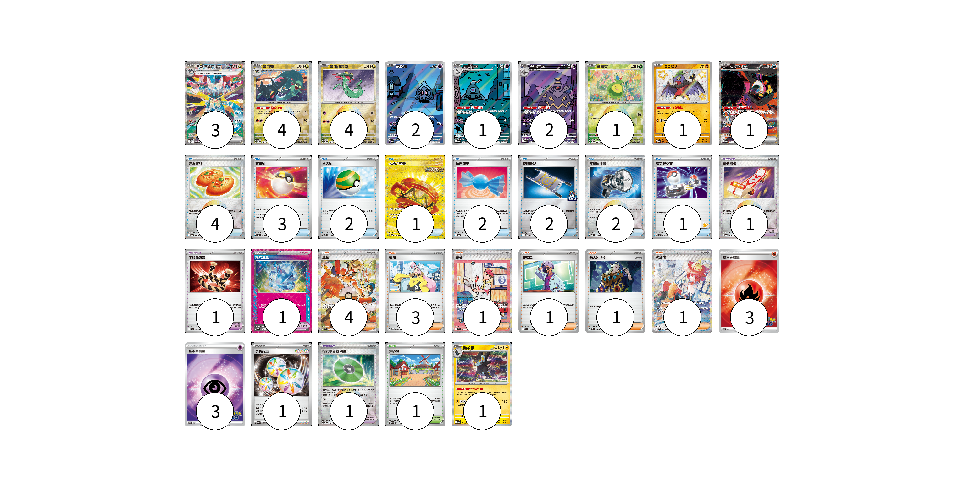 牌組構築方案 以此牌組為基礎新構築牌組 顯示卡面 顯示列表 寶可夢卡(20) 3 4 4 2 1 2 1 1 1 1 寶可夢道具(4) 1 1 1 1 物品卡(17) 4 3 2 1 2 2 2 1 支援者卡(11) 4 3 1 1 1 1 競技場卡(1) 1 能量卡(7) 3 3 1 寶可夢卡(20) 卡牌名稱 張數 卡牌名稱 張數 多龍巴魯托ex SV8a 221/187 03 多龍奇 SV8a 119/187 04 多龍梅西亞 SV8a 118/187 04 夜巡靈 SV6a 068/064 02 彷徨夜靈 SV6a 069/064 01 黑夜魔靈 SV6a 070/064 02 含羞苞 SV8a 001/187 01 摔角鷹人 SV4a 282/190 01 吉雉雞ex SV6a 089/064 01 倫琴貓 SV4a 061/190 01 寶可夢道具(4) 卡牌名稱 張數 卡牌名稱 張數 緊急滑板 SV8a 153/187 01 不服輸頭帶 SVTL 016/021 01 璀璨結晶 SV8a 152/187 01 招式學習器 演進 SV8a 160/187 01 物品卡(17) 卡牌名稱 張數 卡牌名稱 張數 好友寶芬 SV8a 147/187 04 高級球 SVOD 012/020 03 巢穴球 SVM 133/175 02 大地之容器 SV6a 093/064 01 神奇糖果 SVOD 013/020 02 夜間擔架 SV-P 204/SV-P 02 反擊捕捉器 SV8a 139/187 02 寶可夢交替 SVI 054/066 01 支援者卡(11) 卡牌名稱 張數 卡牌名稱 張數 派帕 SV4a 353/190 04 奇樹 SVOD 016/020 03 赤松 SV8a 227/187 01 吉尼亞 SVD 129/139 01 老大的指令 SVOD 019/020 01 梅洛可 SV4K 092/066 01 競技場卡(1) 卡牌名稱 張數 卡牌名稱 張數 深缽鎮 SVK 039/042 01 能量卡(7) 卡牌名稱 張數 卡牌名稱 張數 基本火能量 S10b FIR 03 基本超能量 S10b PSY 03 反轉能量 SVK 041/042 01 以此牌組為基礎新構築牌組 牌組編碼 BSFJTP-VsvtFJ-NBtAub copy 列印牌組單 牌組編碼已複製 分享至SNS