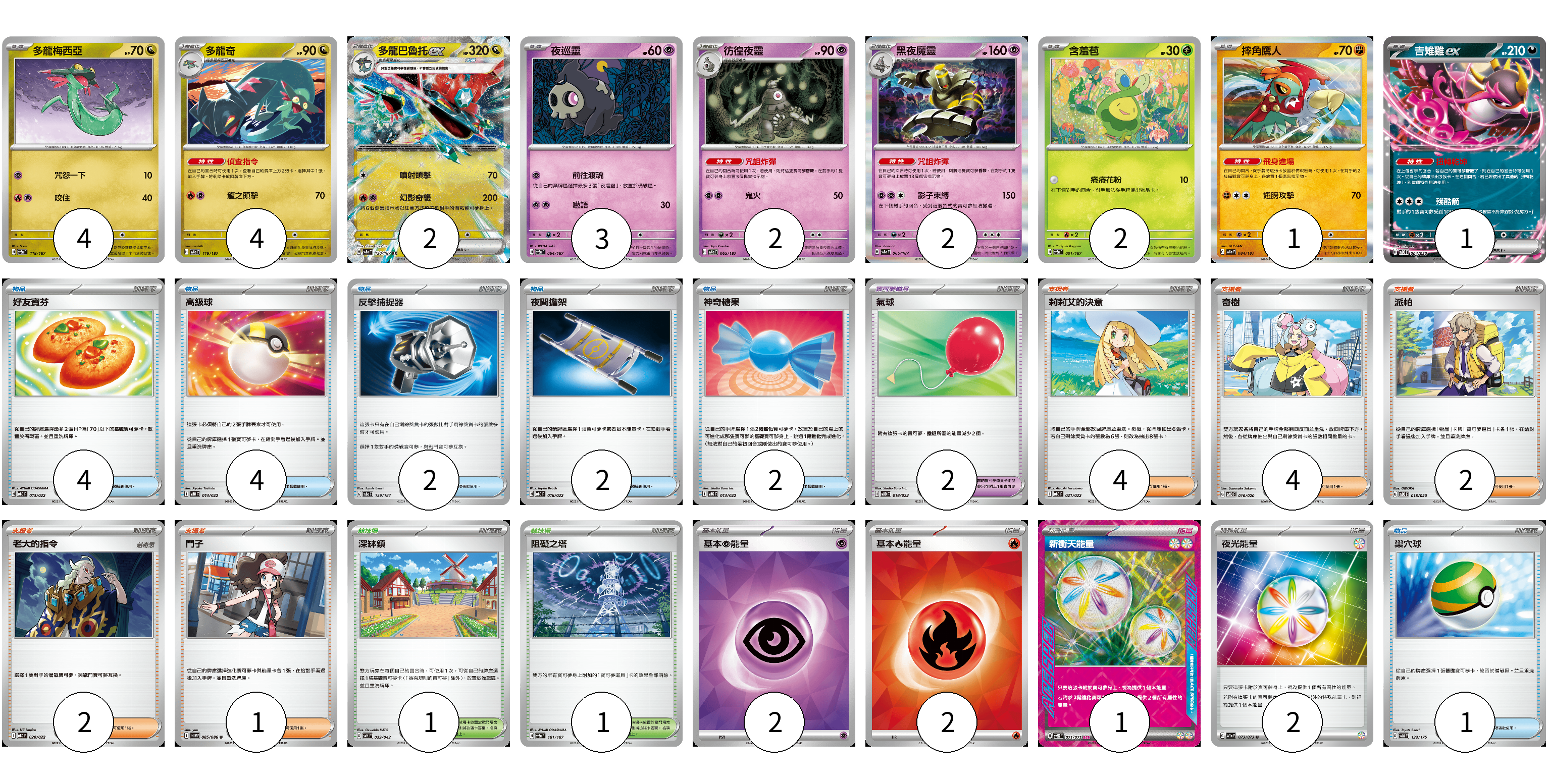 牌組構築方案 以此牌組為基礎新構築牌組 顯示卡面 顯示列表 寶可夢卡(21) 4 4 2 3 2 2 2 1 1 寶可夢道具(2) 2 物品卡(15) 4 4 2 2 2 1 支援者卡(13) 4 4 2 2 1 競技場卡(2) 1 1 能量卡(7) 2 2 1 2 寶可夢卡(21) 卡牌名稱 張數 卡牌名稱 張數 多龍梅西亞 SV8a 118/187 04 多龍奇 SV8a 119/187 04 多龍巴魯托ex SV8a 120/187 02 夜巡靈 SV8a 064/187 03 彷徨夜靈 SV8a 065/187 02 黑夜魔靈 SV8a 066/187 02 含羞苞 SV8a 001/187 02 摔角鷹人 SV8a 084/187 01 吉雉雞ex SVOD 004/020 01 寶可夢道具(2) 卡牌名稱 張數 卡牌名稱 張數 氣球 MBD 018/022 02 物品卡(15) 卡牌名稱 張數 卡牌名稱 張數 好友寶芬 MBD 013/022 04 高級球 MBD 014/022 04 反擊捕捉器 SV8a 139/187 02 夜間擔架 MBD 016/022 02 神奇糖果 MBG 013/022 02 巢穴球 SVM 133/175 01 支援者卡(13) 卡牌名稱 張數 卡牌名稱 張數 莉莉艾的決意 MBD 021/022 04 奇樹 SVOD 016/020 04 派帕 SVOD 018/020 02 老大的指令 MBD 020/022 02 鬥子 SV11W 085/086 01 競技場卡(2) 卡牌名稱 張數 卡牌名稱 張數 深缽鎮 SVK 039/042 01 阻礙之塔 SV8a 181/187 01 能量卡(7) 卡牌名稱 張數 卡牌名稱 張數 基本【超】能量 SVOD PSY 02 基本【火】能量 SVK FIR 02 新衝天能量 SV5K 071/071 01 夜光能量 SV1a 073/073 02 以此牌組為基礎新構築牌組 牌組編碼 BTaGsZ-XyBGyH-buSTKk copy 列印牌組單 牌組編碼已複製 分享至SNS