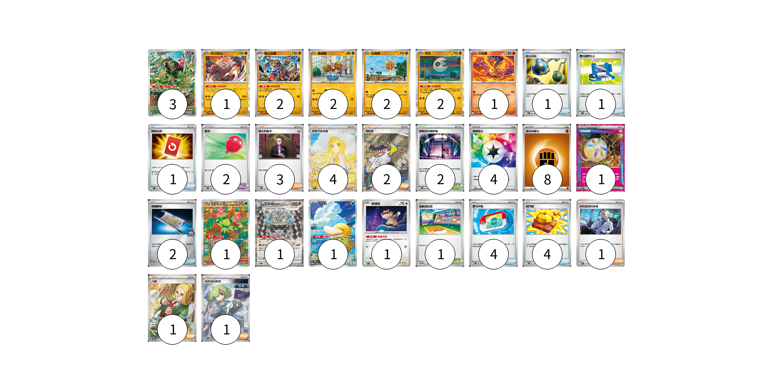 牌組構築方案 以此牌組為基礎新構築牌組 顯示卡面 顯示列表 寶可夢卡(17) 3 1 2 2 2 2 1 1 1 1 1 寶可夢道具(2) 2 物品卡(13) 1 1 1 2 4 4 支援者卡(12) 3 4 2 1 1 1 競技場卡(3) 2 1 能量卡(13) 4 8 1 寶可夢卡(17) 卡牌名稱 張數 卡牌名稱 張數 夠讚狗 SV6 110/101 03 月月熊 赫月 SV6a 025/064 01 龜足巨鎧 M3 042/080 02 龜腳腳 M3 041/080 02 太陽岩 M1L 027/063 02 月石 M1L 026/063 02 火焰鳥 M2 014/080 01 沙鈴仙人掌 SV9 101/100 01 厄鬼椪 礎石面具ex SV6 119/101 01 可達鴨 M2a 199/193 01 探探鼠 M4 068/083 01 寶可夢道具(2) 卡牌名稱 張數 卡牌名稱 張數 氣球 MC 688/742 02 物品卡(13) 卡牌名稱 張數 卡牌名稱 張數 能量回收 MC 636/742 01 寶可裝置3.0 MC 660/742 01 特殊紅牌 M4 072/083 01 夜間擔架 SV-P 204/SV-P 02 寶可平板 M3 070/080 04 戰鬥鑼 M2a 155/193 04 支援者卡(12) 卡牌名稱 張數 卡牌名稱 張數 老大的指令 MC 724/742 03 莉莉艾的決意 M1L 091/063 04 塔拉剛 M3 105/080 02 阿克羅瑪的執著 SV6a 059/064 01 八朔 SV6 124/101 01 暗碼迷的解讀 SV5M 090/071 01 競技場卡(3) 卡牌名稱 張數 卡牌名稱 張數 對戰圓形競技場 M2 079/080 02 激動競技場 SV8 105/106 01 能量卡(13) 卡牌名稱 張數 卡牌名稱 張數 稜鏡能量 SV11B 086/086 04 基本【鬥】能量 MC FIG 08 古舊能量 SV6 101/101 01 以此牌組為基礎新構築牌組 牌組編碼 BUPoNt-pbbFij-PXTwke copy 列印牌組單 牌組編碼已複製 分享至SNS