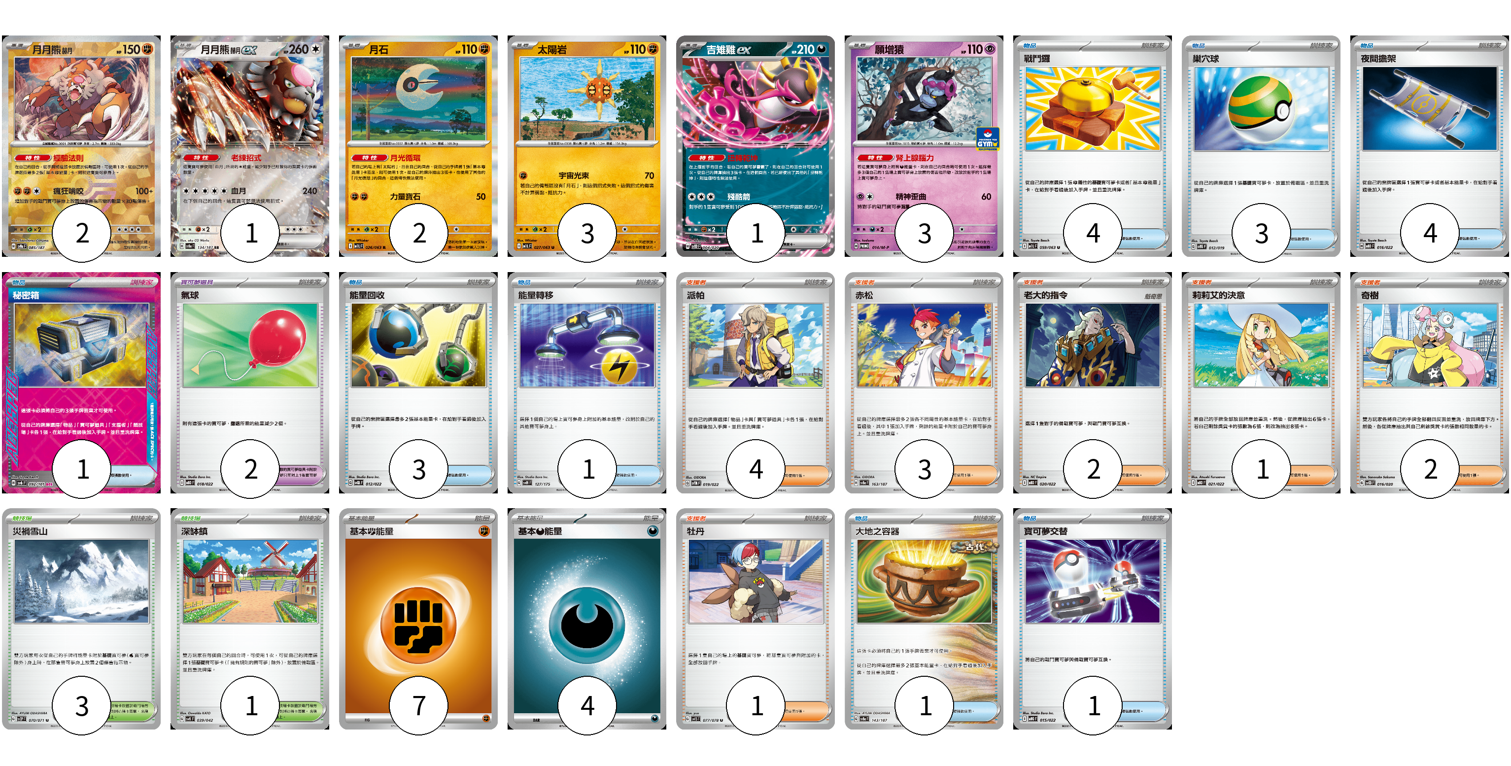 牌組構築方案 以此牌組為基礎新構築牌組 顯示卡面 顯示列表 寶可夢卡(12) 2 1 2 3 1 3 寶可夢道具(2) 2 物品卡(18) 4 3 4 1 3 1 1 1 支援者卡(13) 4 3 2 1 2 1 競技場卡(4) 3 1 能量卡(11) 7 4 寶可夢卡(12) 卡牌名稱 張數 卡牌名稱 張數 月月熊 赫月 SV8a 085/187 02 月月熊 赫月ex SV8a 134/187 01 月石 M1L 026/063 02 太陽岩 M1L 027/063 03 吉雉雞ex SVOD 004/020 01 願增猿 M-P 014/M-P 03 寶可夢道具(2) 卡牌名稱 張數 卡牌名稱 張數 氣球 MBD 018/022 02 物品卡(18) 卡牌名稱 張數 卡牌名稱 張數 戰鬥鑼 M1L 059/063 04 巢穴球 SVTG 012/019 03 夜間擔架 MBD 016/022 04 秘密箱 SV6 092/101 01 能量回收 SVQL 012/022 03 能量轉移 SVM 127/175 01 大地之容器 SV8a 143/187 01 寶可夢交替 MBG 015/022 01 支援者卡(13) 卡牌名稱 張數 卡牌名稱 張數 派帕 SVTM 019/022 04 赤松 SV8a 163/187 03 老大的指令 MBD 020/022 02 莉莉艾的決意 MBD 021/022 01 奇樹 SVOD 016/020 02 牡丹 SV1S 077/078 01 競技場卡(4) 卡牌名稱 張數 卡牌名稱 張數 災禍雪山 SV2P 070/071 03 深缽鎮 SVK 039/042 01 能量卡(11) 卡牌名稱 張數 卡牌名稱 張數 基本鬥能量 sv-p FIG 07 基本【惡】能量 MBG DAR 04 以此牌組為基礎新構築牌組 牌組編碼 BVaoYb-ADtrDZ-fEFhlS copy 列印牌組單 牌組編碼已複製 分享至SNS