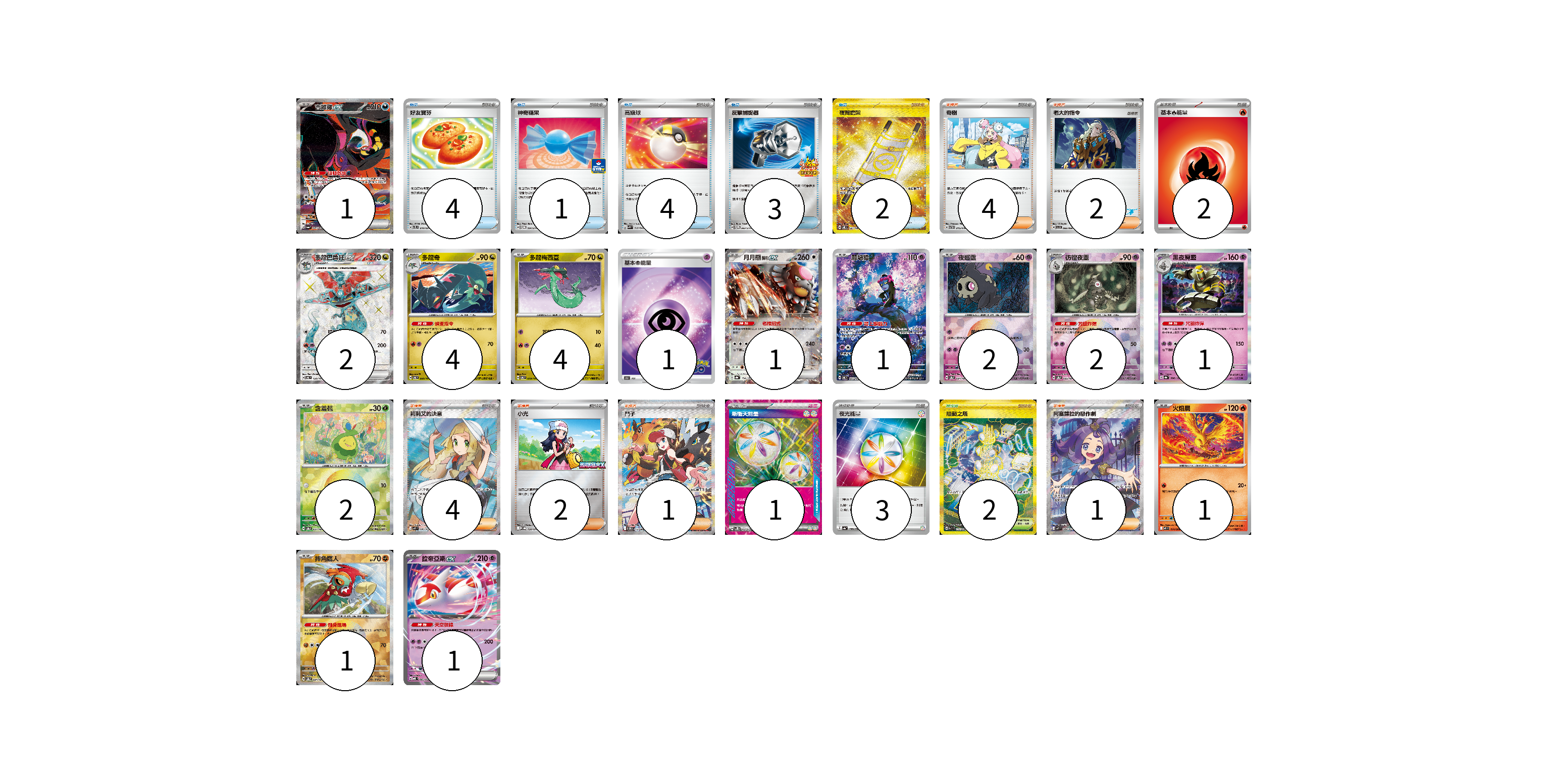 牌組構築方案 以此牌組為基礎新構築牌組 顯示卡面 顯示列表 寶可夢卡(23) 1 2 4 4 1 1 2 2 1 2 1 1 1 物品卡(14) 4 1 4 3 2 支援者卡(14) 4 2 4 2 1 1 競技場卡(2) 2 能量卡(7) 2 1 1 3 寶可夢卡(23) 卡牌名稱 張數 卡牌名稱 張數 吉雉雞ex SV6a 089/064 01 多龍巴魯托ex SV6 120/101 02 多龍奇 SV6 080/101 04 多龍梅西亞 SV6 079/101 04 月月熊 赫月ex SV8a 134/187 01 願增猿 SV6 107/101 01 夜巡靈 SV8a 064/187 02 彷徨夜靈 SV8a 065/187 02 黑夜魔靈 SV8a 066/187 01 含羞苞 SV8a 001/187 02 火焰鳥 M2 014/080 01 摔角鷹人 SV8a 084/187 01 拉帝亞斯ex MBD 003/022 01 物品卡(14) 卡牌名稱 張數 卡牌名稱 張數 好友寶芬 SVTL 010/021 04 神奇糖果 SV-P 104/SV-P 01 高級球 SVK 018/042 04 反擊捕捉器 SV-P 083/SV-P 03 夜間擔架 SV8 137/106 02 支援者卡(14) 卡牌名稱 張數 卡牌名稱 張數 奇樹 SVTH 015/018 04 老大的指令 SVI 066/066 02 莉莉艾的決意 M1L 086/063 04 小光 M-P 028/M-P 02 鬥子 SV11W 173/086 01 阿塞蘿拉的惡作劇 M1S 084/063 01 競技場卡(2) 卡牌名稱 張數 卡牌名稱 張數 阻礙之塔 SV10 132/098 02 能量卡(7) 卡牌名稱 張數 卡牌名稱 張數 基本【火】能量 SVF FIR 02 基本超能量 S10b PSY 01 新衝天能量 SV5K 071/071 01 夜光能量 SV4a 190/190 03 以此牌組為基礎新構築牌組 牌組編碼 BbNSMa-OvAAEC-SrwEQo copy 列印牌組單 牌組編碼已複製 分享至SNS