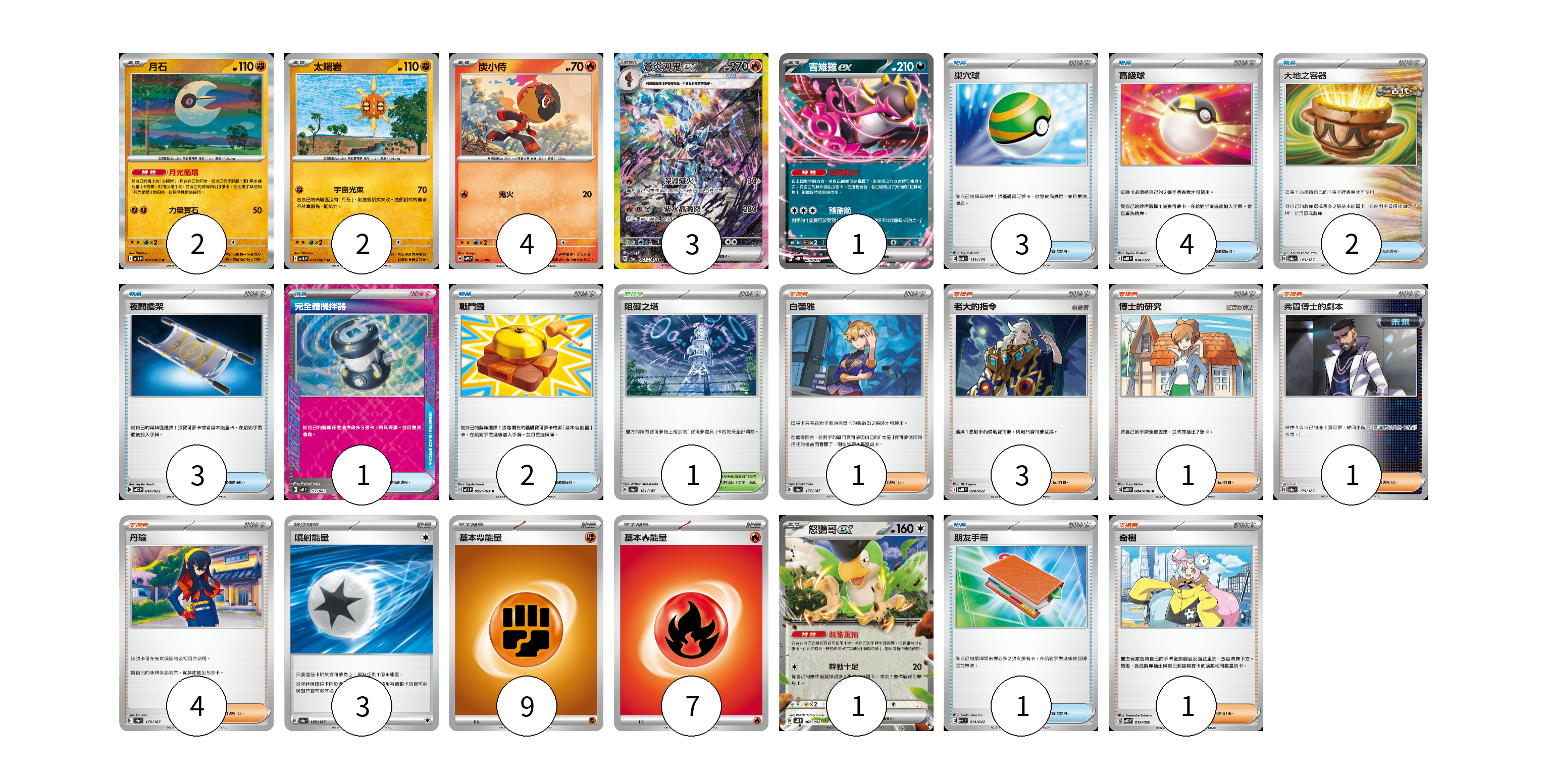 牌組構築方案 以此牌組為基礎新構築牌組 顯示卡面 顯示列表 寶可夢卡(13) 2 2 4 3 1 1 物品卡(16) 3 4 2 3 1 2 1 支援者卡(11) 1 3 1 1 4 1 競技場卡(1) 1 能量卡(19) 3 9 7 寶可夢卡(13) 卡牌名稱 張數 卡牌名稱 張數 月石 M1L 026/063 02 太陽岩 M1L 027/063 02 炭小侍 SVPS 005/008 04 蒼炎刃鬼ex SV8a 203/187 03 吉雉雞ex SVOM 009/021 01 怒鸚哥ex SVK 006/042 01 物品卡(16) 卡牌名稱 張數 卡牌名稱 張數 巢穴球 SVM 133/175 03 高級球 MBD 014/022 04 大地之容器 SV8a 143/187 02 夜間擔架 MBD 016/022 03 完全體攪拌器 SVK 017/042 01 戰鬥鑼 M1L 059/063 02 朋友手冊 SVK 014/042 01 支援者卡(11) 卡牌名稱 張數 卡牌名稱 張數 白蕾雅 SV8a 176/187 01 老大的指令 MBD 020/022 03 博士的研究 SV11B 084/086 01 弗圖博士的劇本 SV8a 175/187 01 丹瑜 SV8a 170/187 04 奇樹 SVOD 016/020 01 競技場卡(1) 卡牌名稱 張數 卡牌名稱 張數 阻礙之塔 SV8a 181/187 01 能量卡(19) 卡牌名稱 張數 卡牌名稱 張數 噴射能量 SV8a 185/187 03 基本鬥能量 sv-p FIG 09 基本火能量 sv-p FIR 07 以此牌組為基礎新構築牌組 牌組編碼 BdBtLJ-HuXjuU-CoJEKy copy 列印牌組單 牌組編碼已複製 分享至SNS